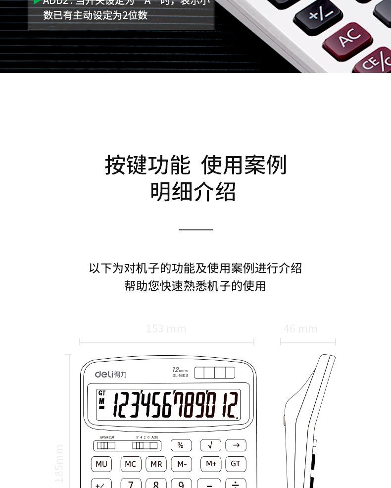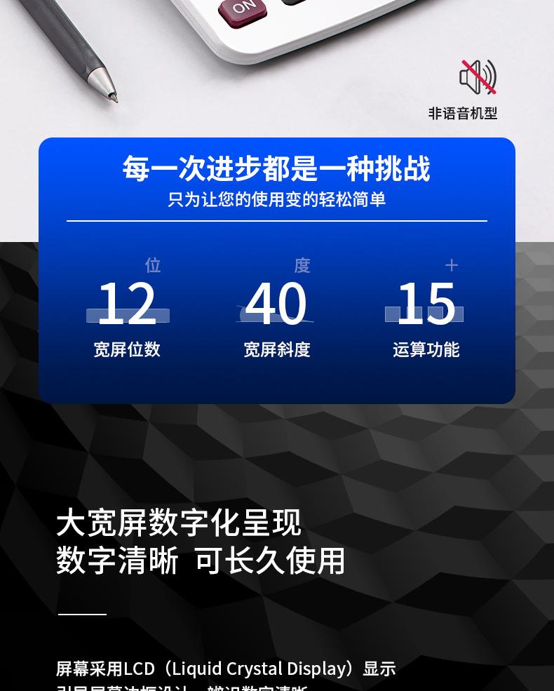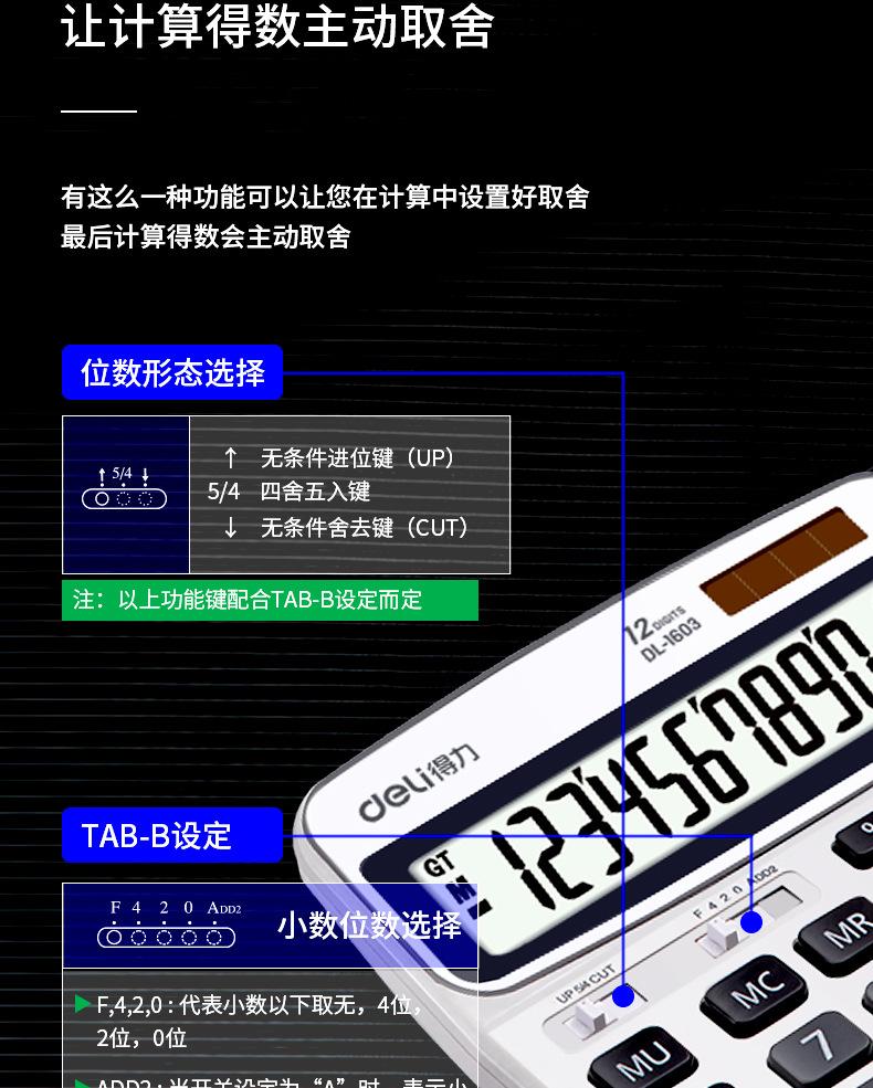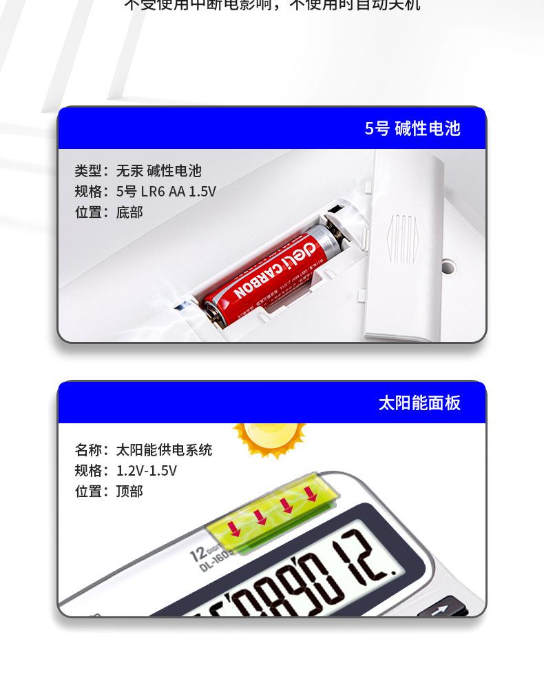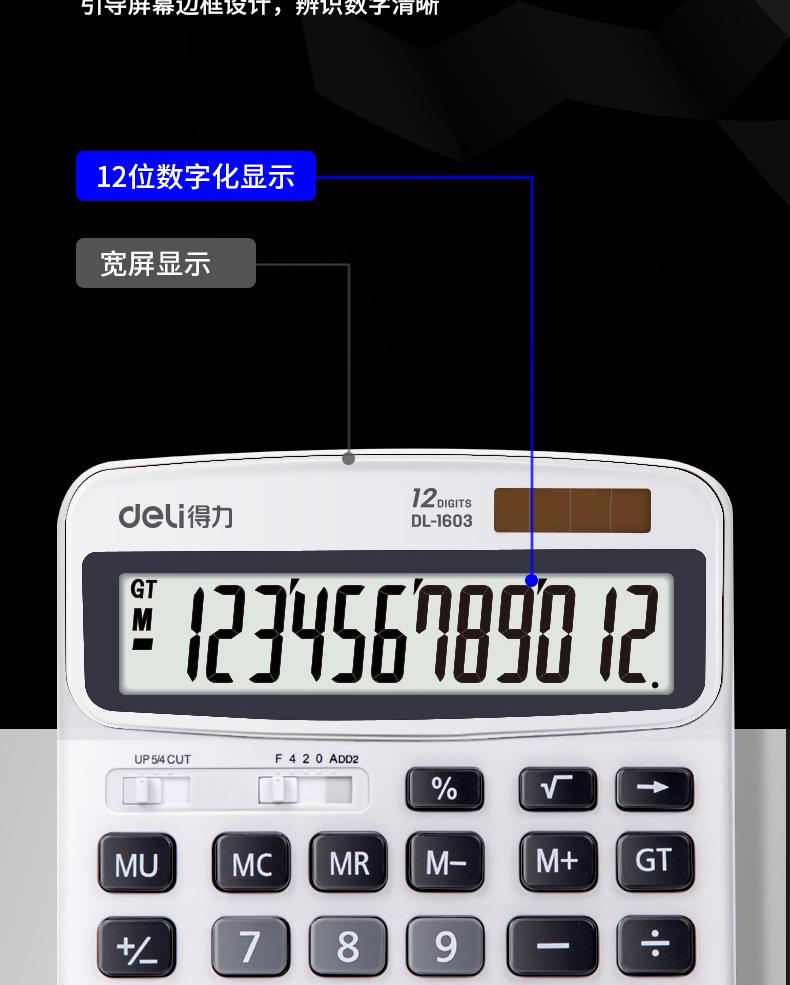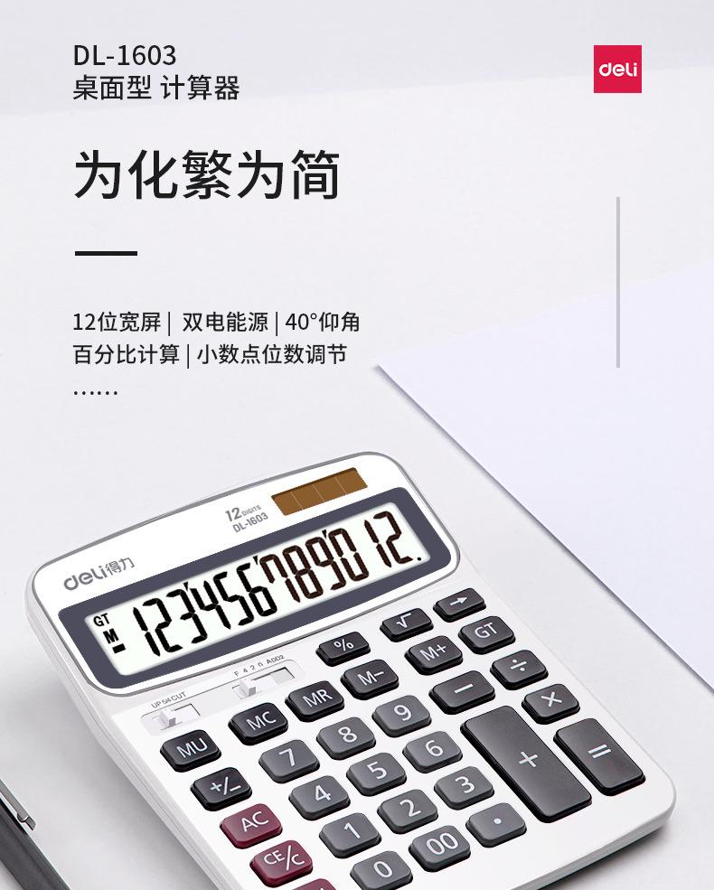 Calculadora Deli 1603 de moda para negocios, oficina y finanzas, calculadora de pantalla grande de 12 bits con energía solar dual