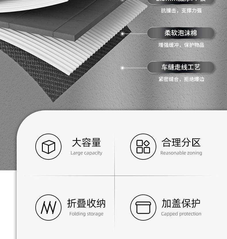 [Características del producto] Las particiones se pueden desmontar y dividir libremente. El material de la partición es impermeable y lavable. Los artículos divididos se pueden colocar de forma más ordenada. Se ajusta y pliega con flexibilidad para ahorrar espacio. Ocupa poco espacio y también permite guardar objetos pequeños. El bolsillo frontal de malla evita que se pierdan objetos pequeños. La práctica hebilla de bloqueo permite ajustar el ancho de la caja libremente. La bolsa de almacenamiento multiusos aumenta el espacio de almacenamiento y es fácil de usar. La tapa con velcro integrada es fácil de colocar y desmontar.
