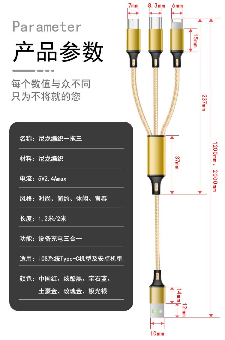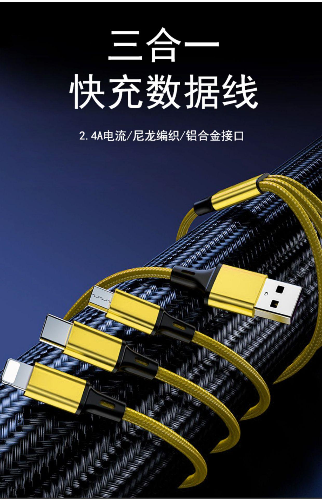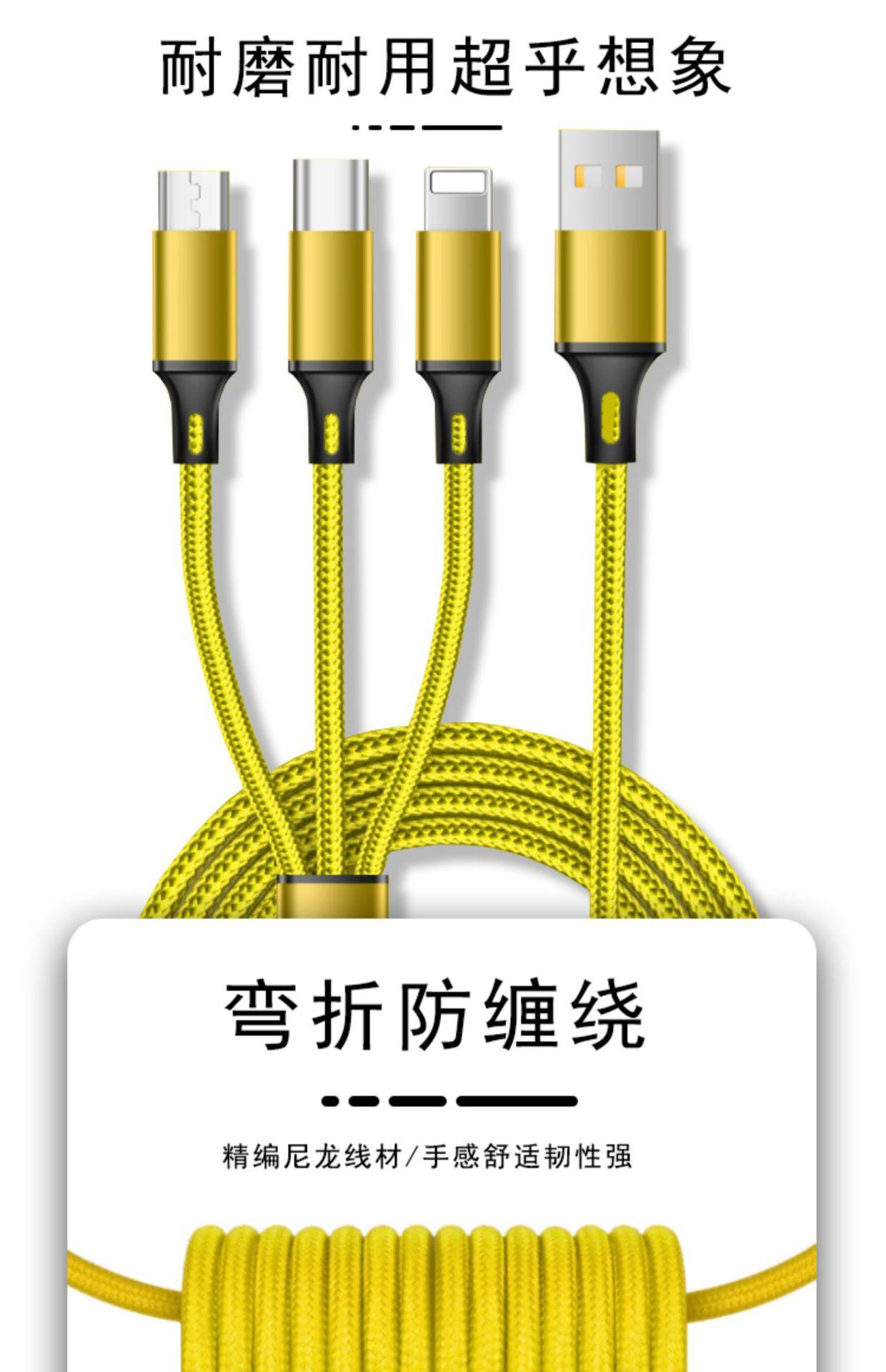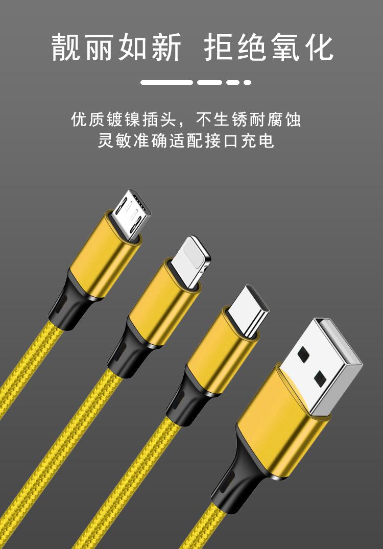 Cable de datos trenzado de nailon dorado uno arrastre tres Cable de carga Tipo-c Cable tres en uno de carga rápida Liquidación directa de fábrica