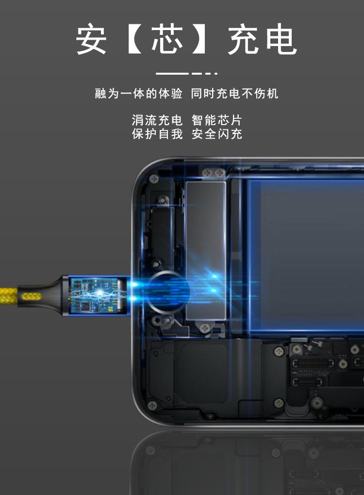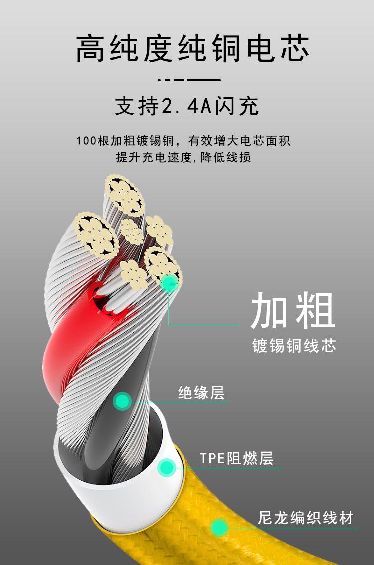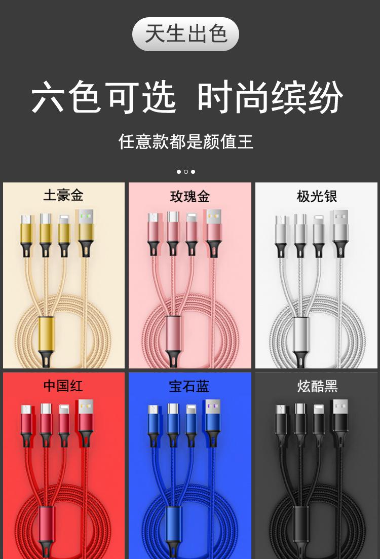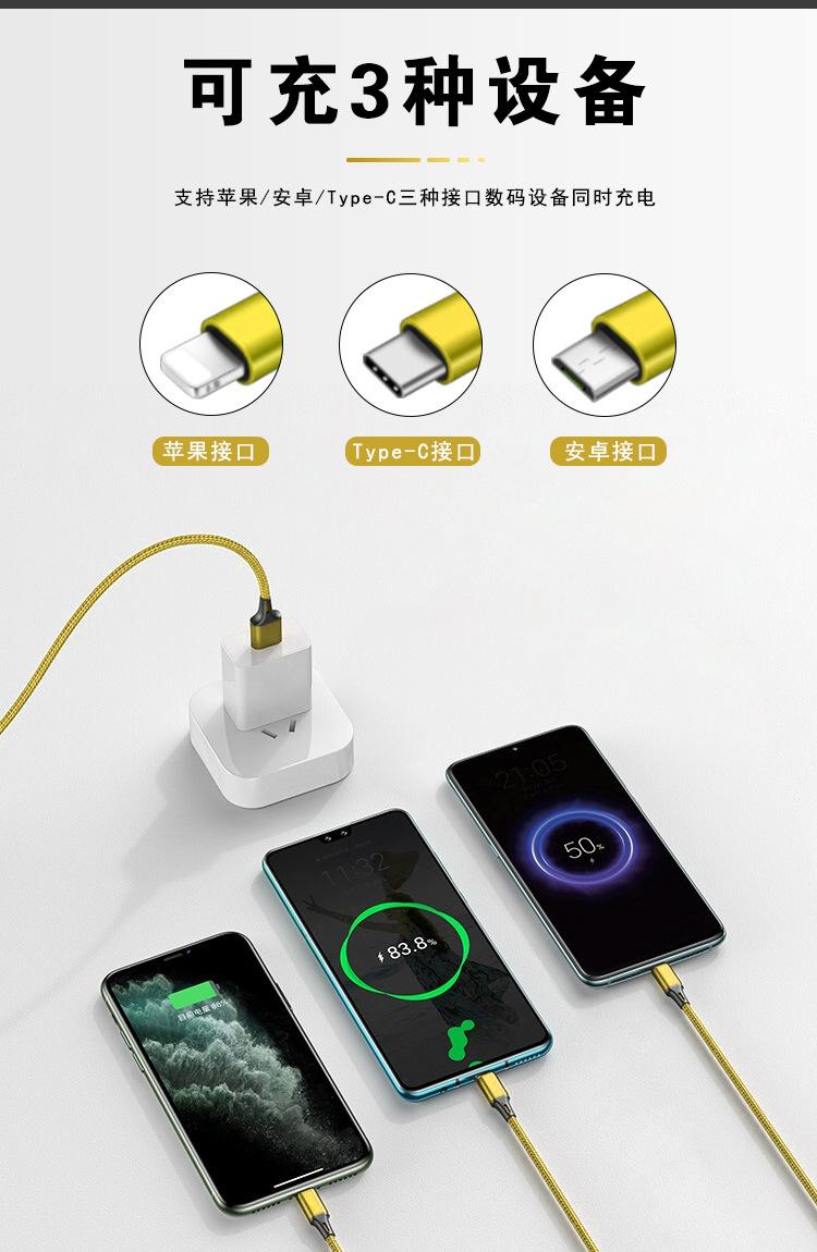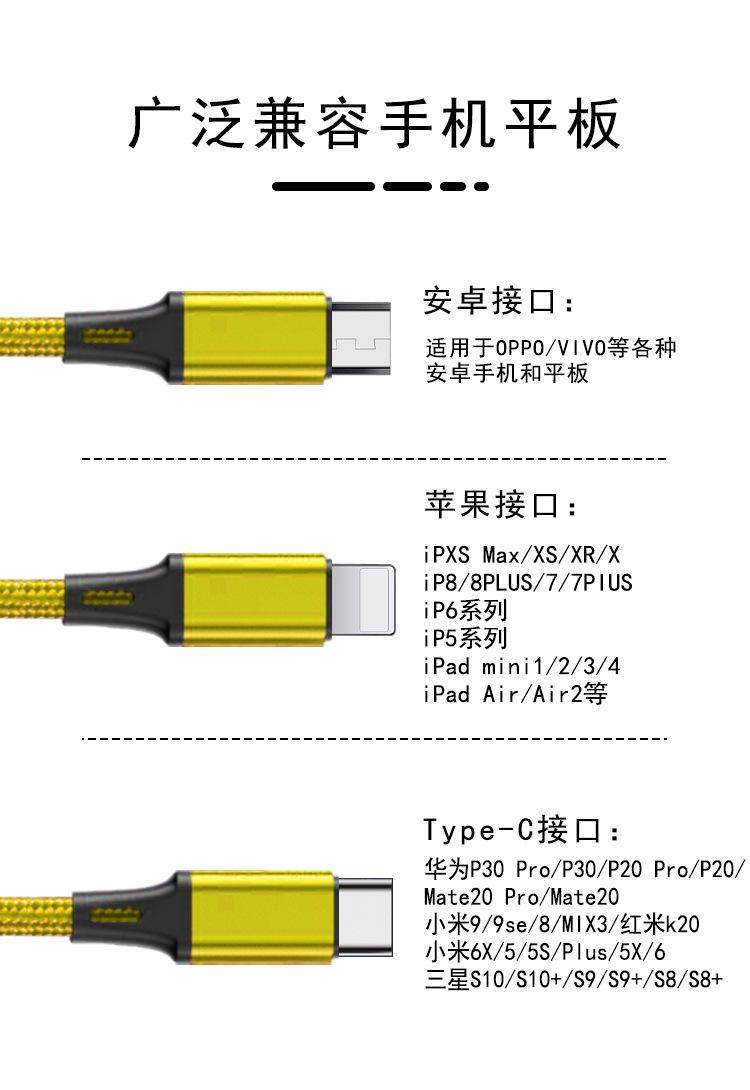 Cable de datos trenzado de nailon dorado uno arrastre tres Cable de carga Tipo-c Cable tres en uno de carga rápida Liquidación directa de fábrica