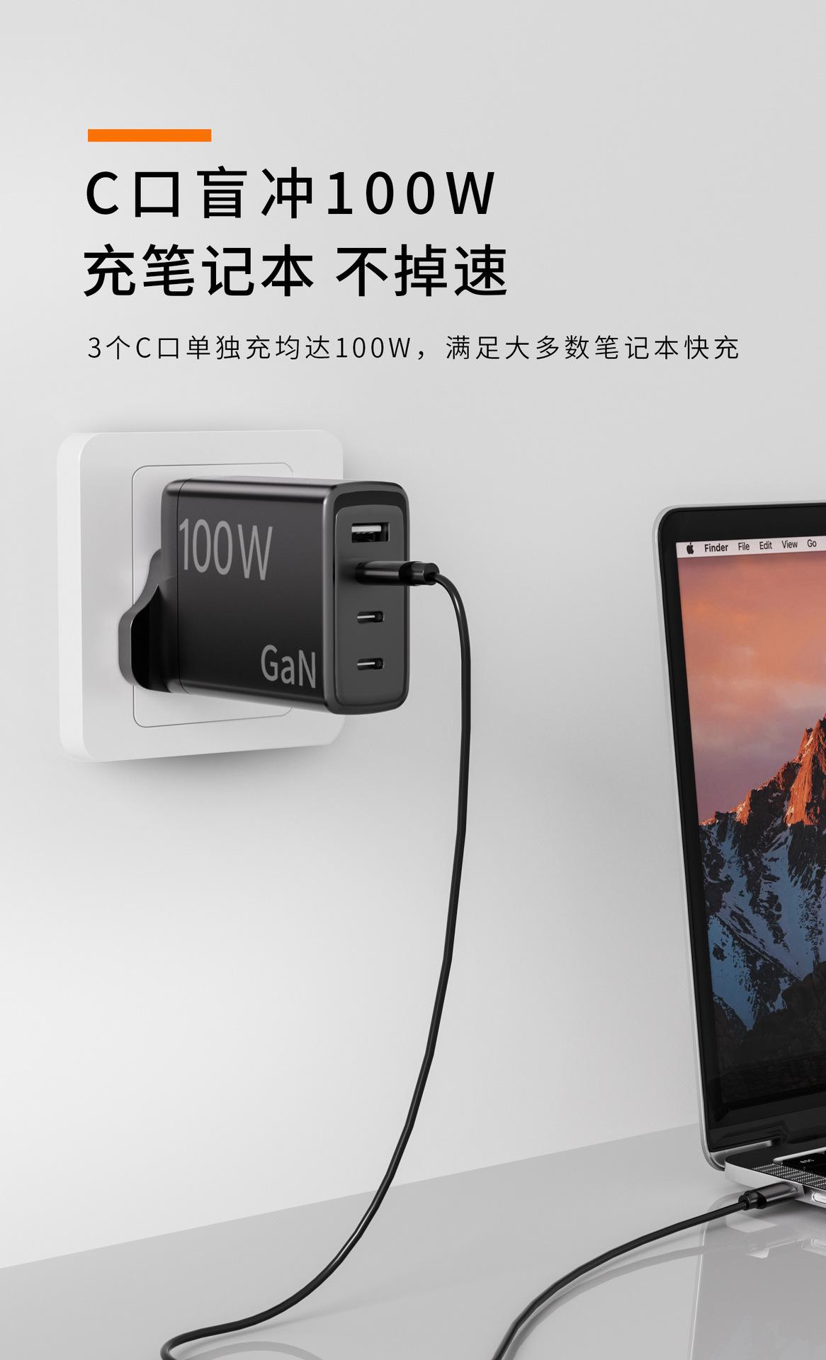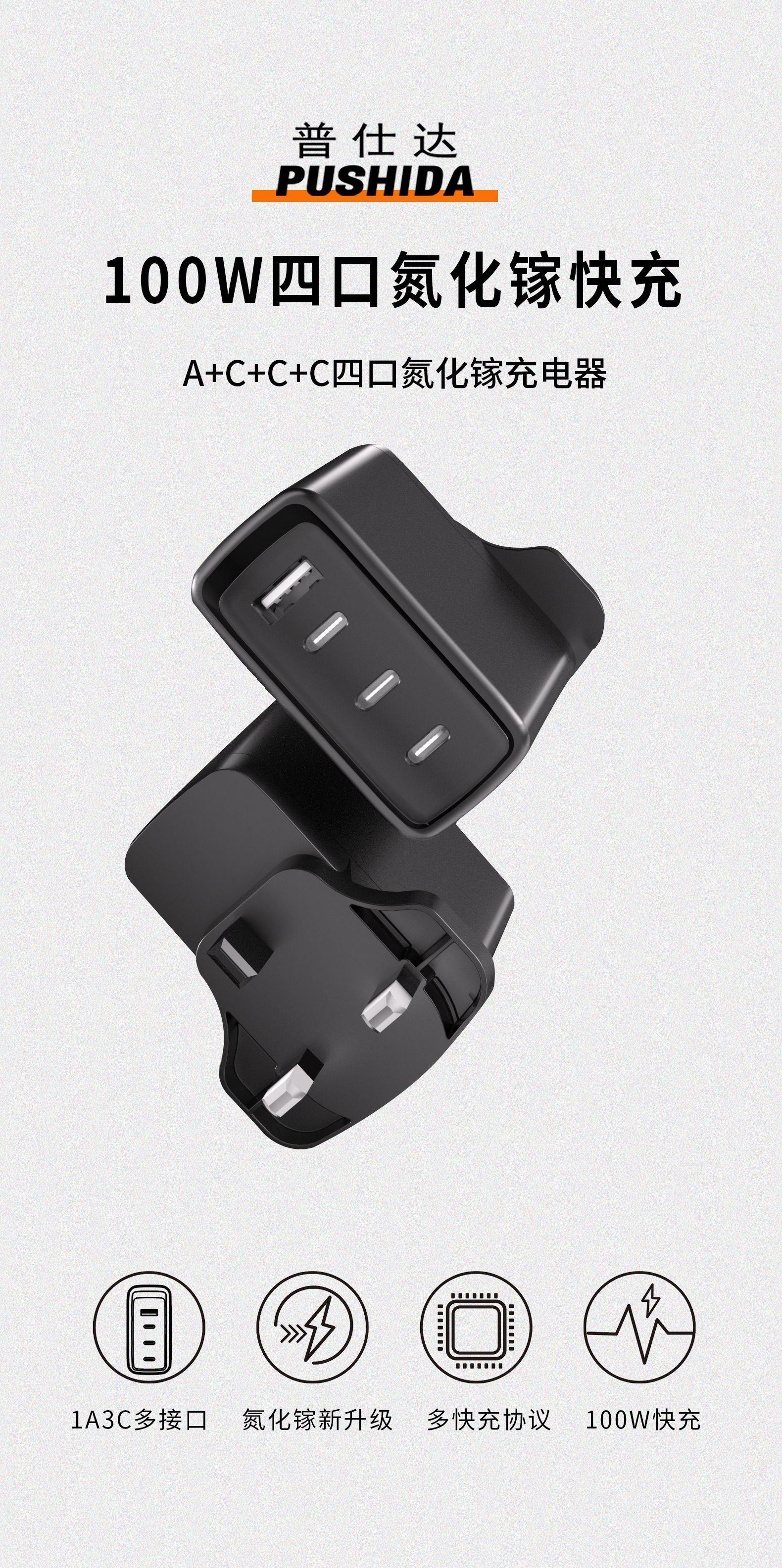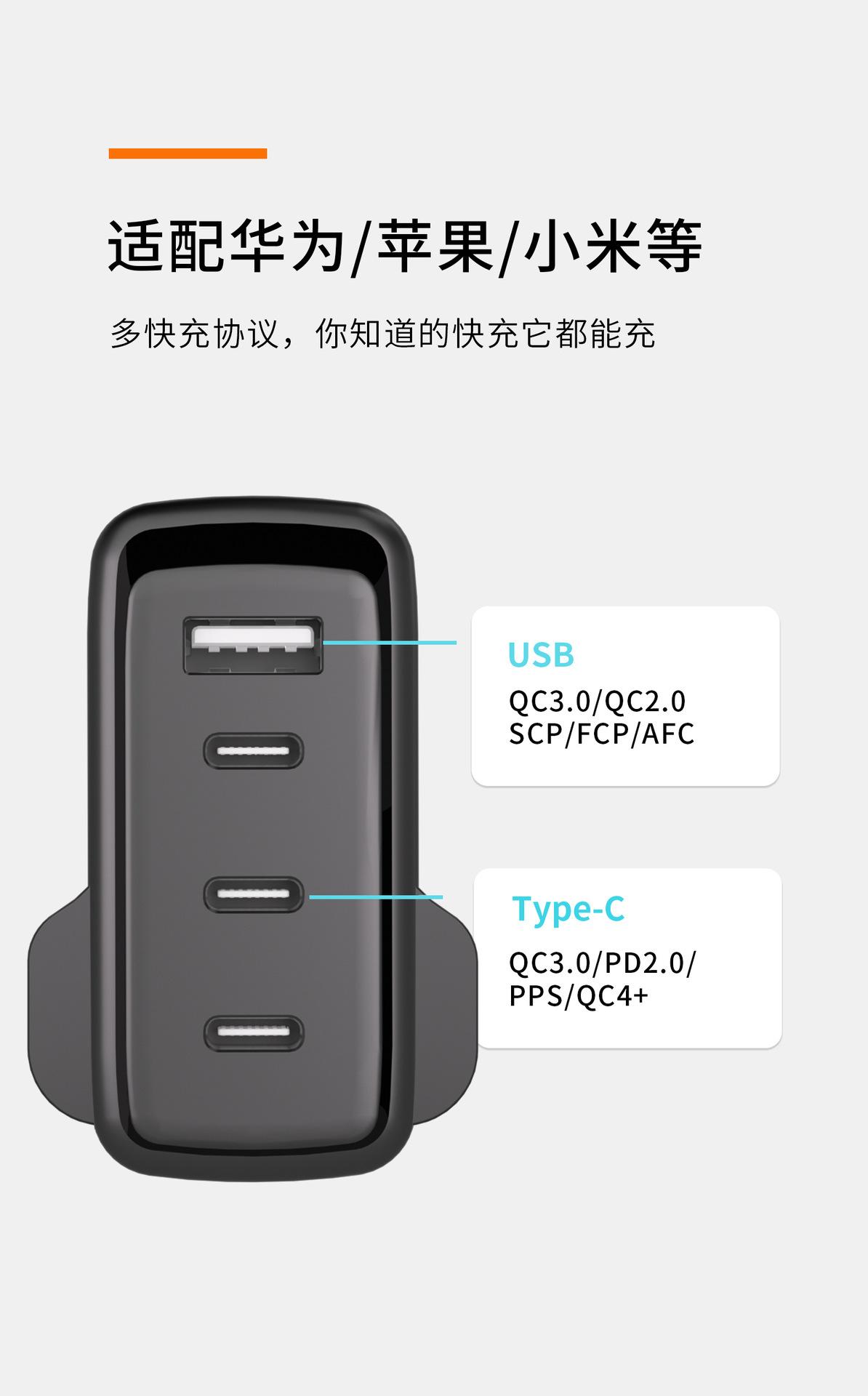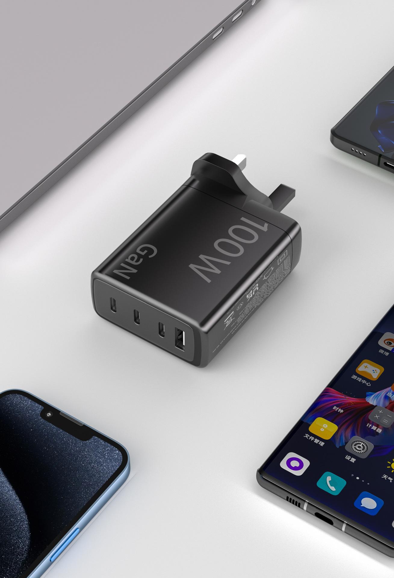 Cargador de nitruro de galio de calibre británico de 100 W con múltiples puertos PD de carga rápida para teléfonos móviles Apple y Huawei, portátiles y ordenadores.