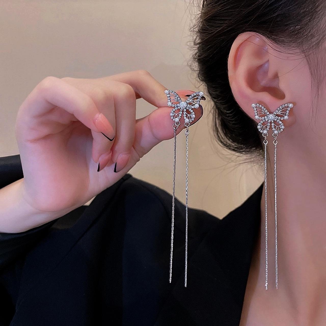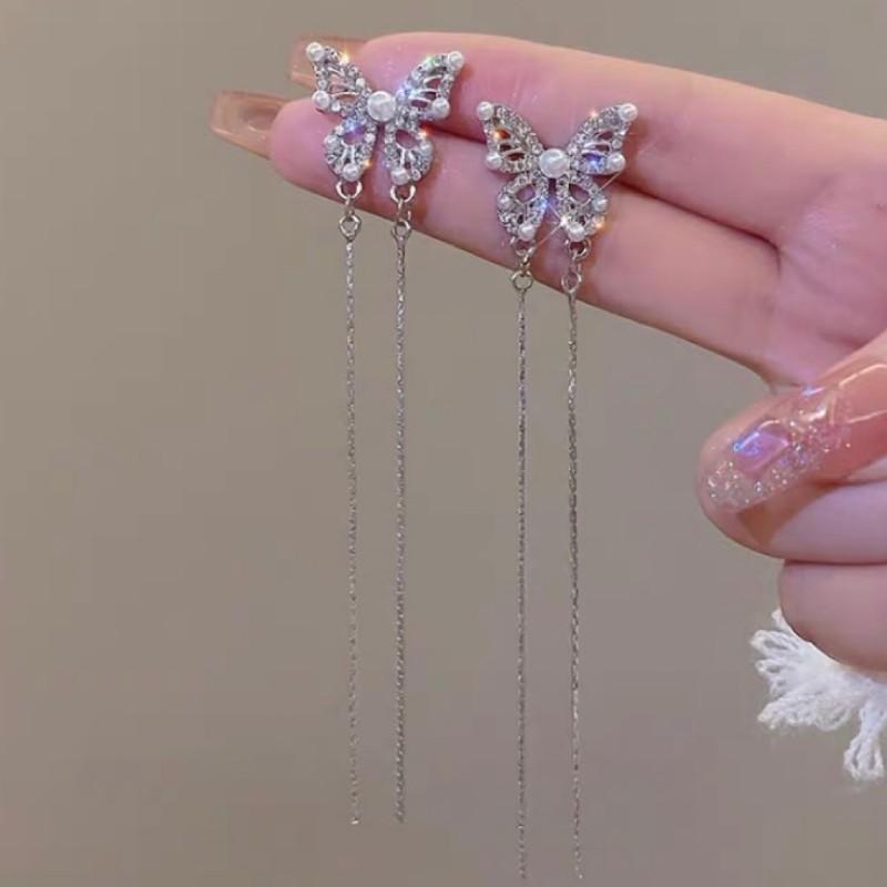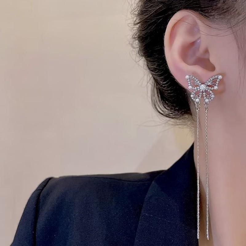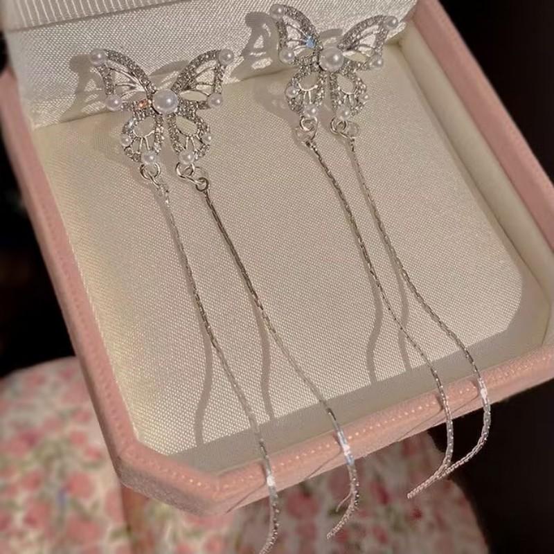 Pendientes largos elegantes con borlas de mariposa y perlas de Super Fairy, pendientes de moda muy dulces y femeninos