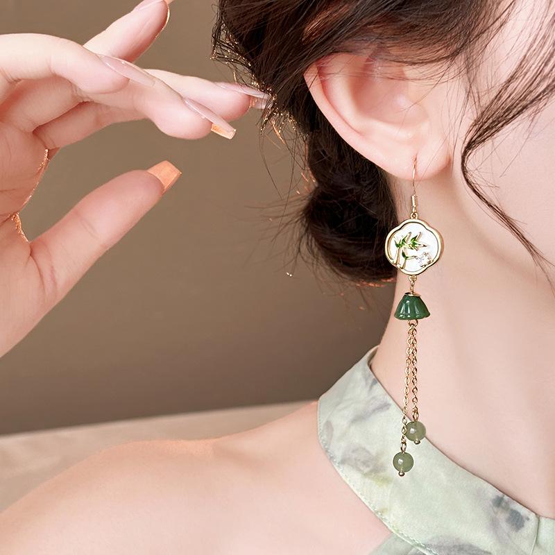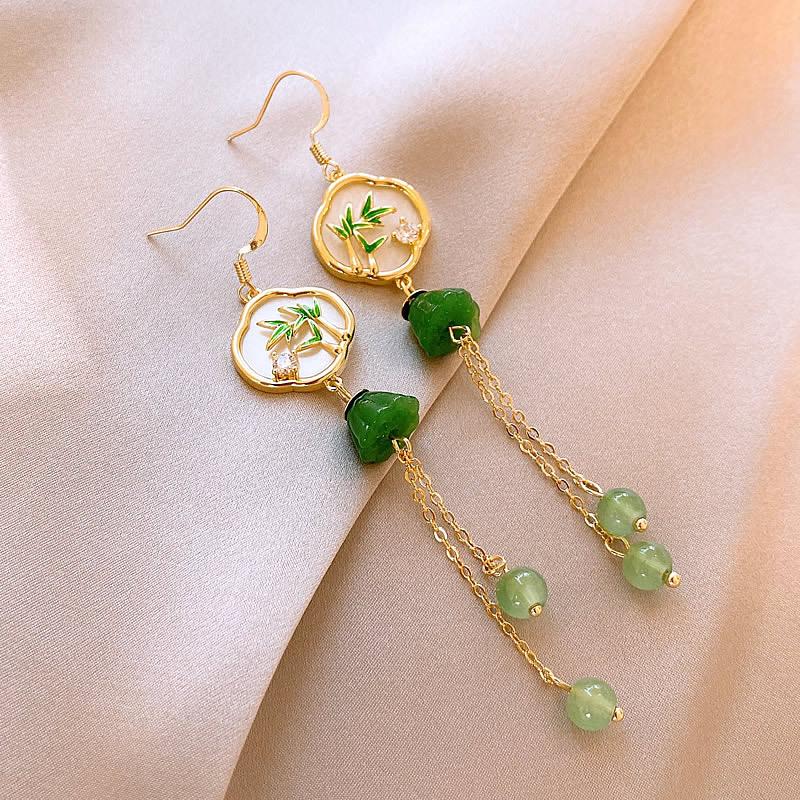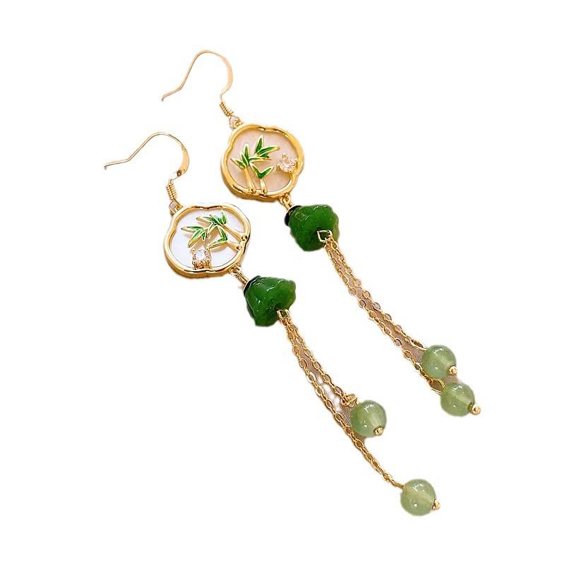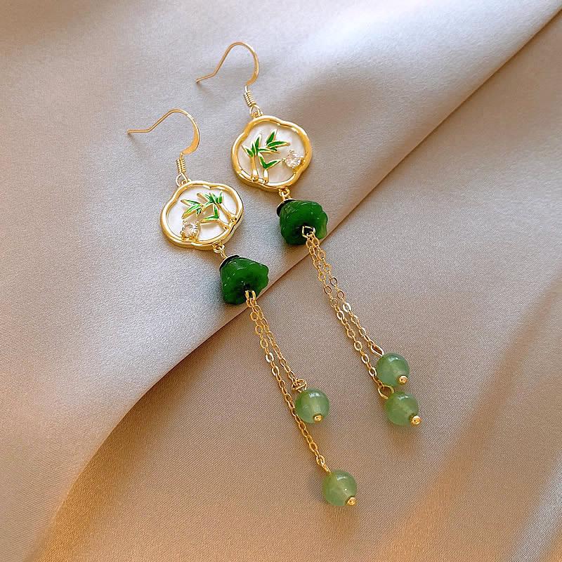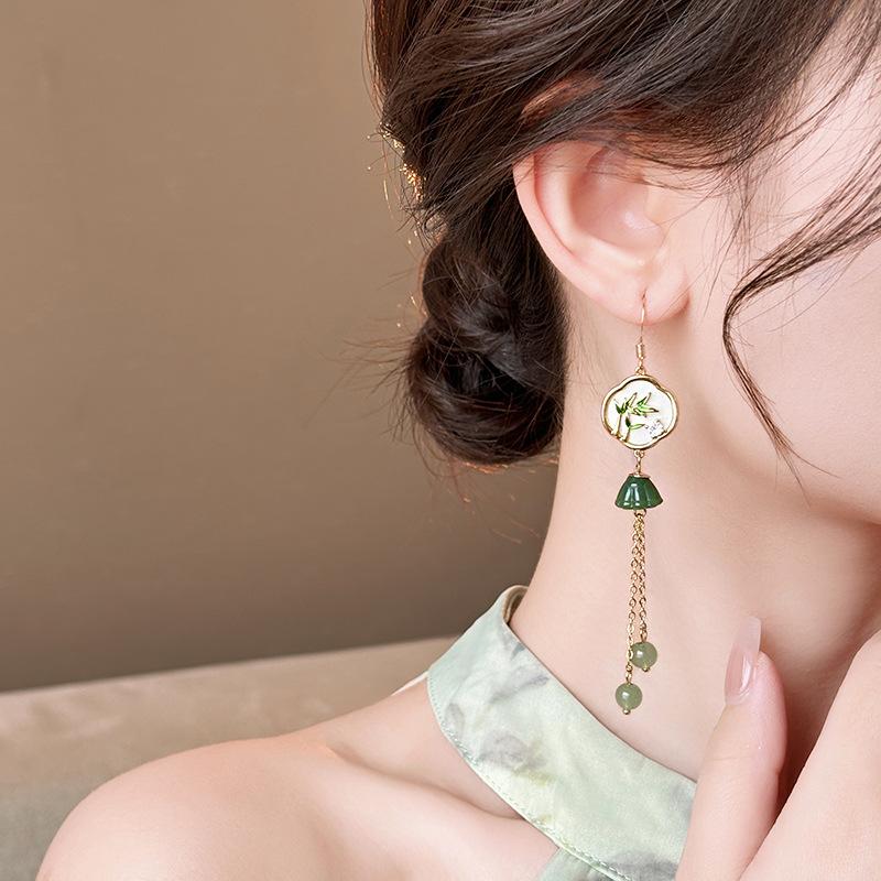 Nuevos pendientes de borlas de hojas de bambú de estilo chino para mujer, ligeros, de lujo, de alta gama, elegantes, 2024, nuevos pendientes únicos con explosiones.
