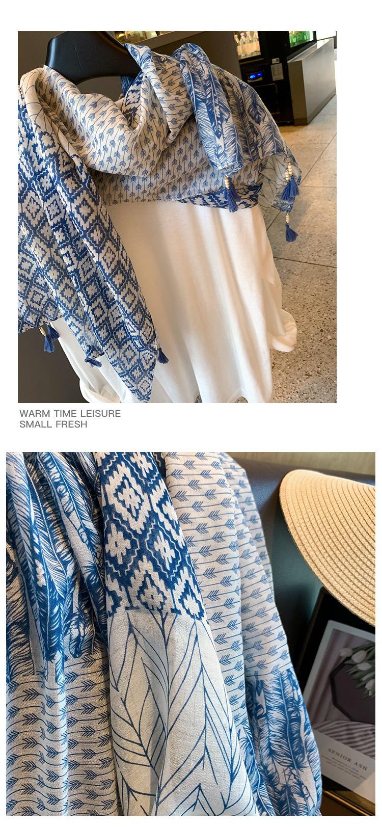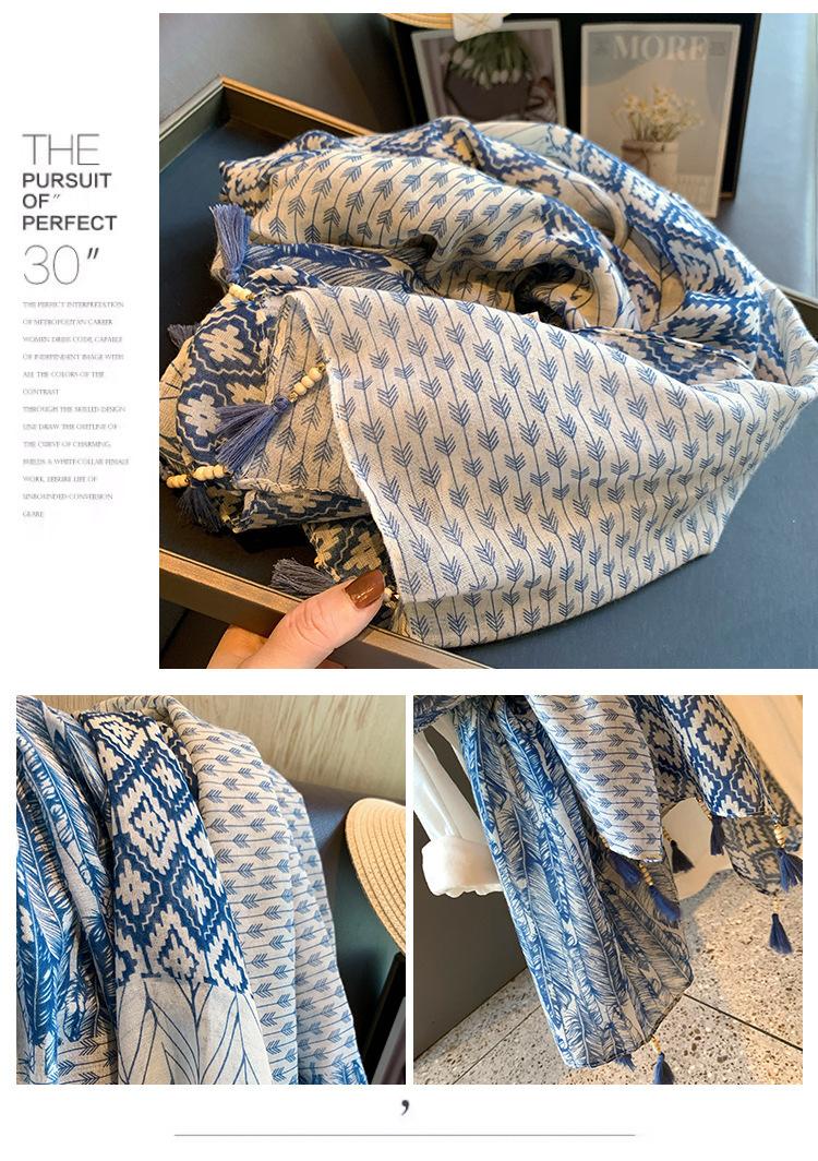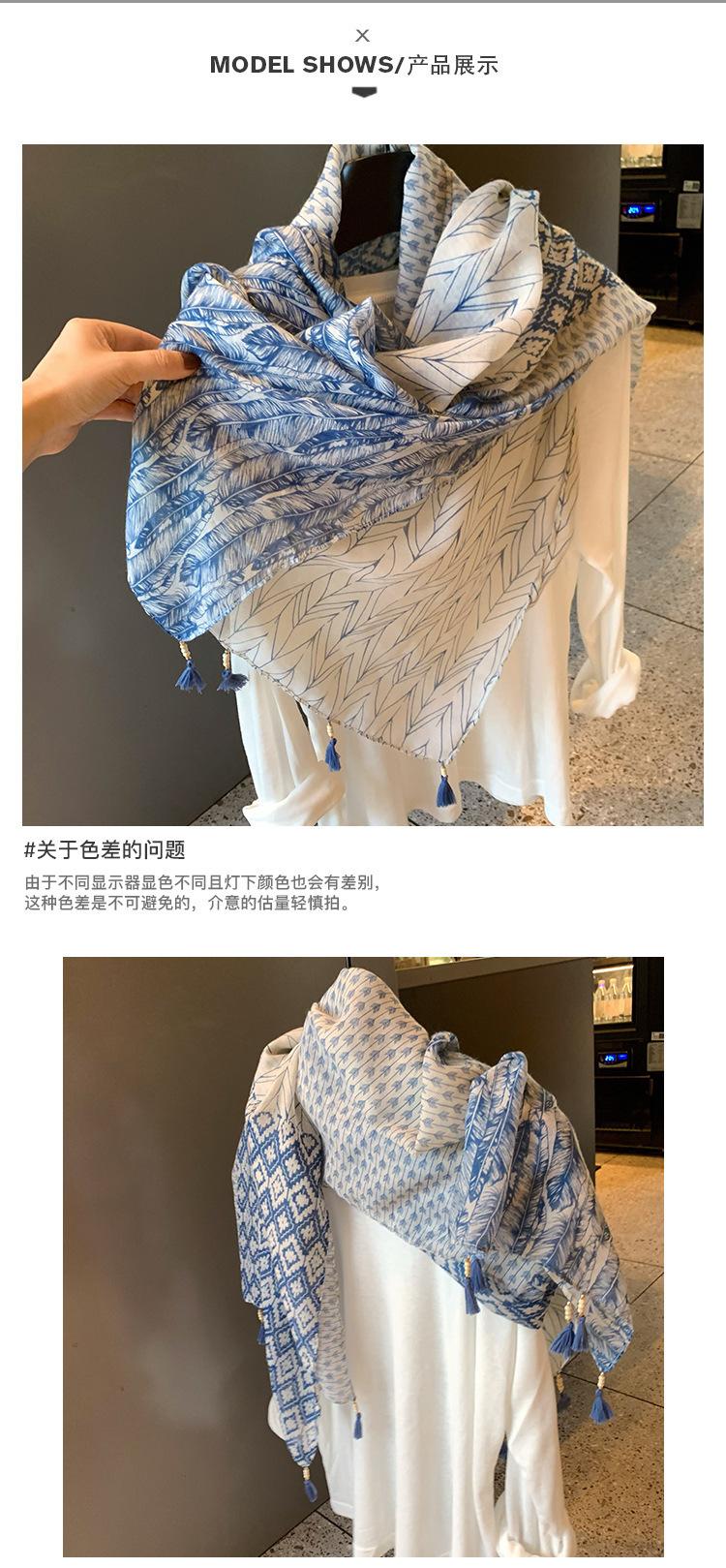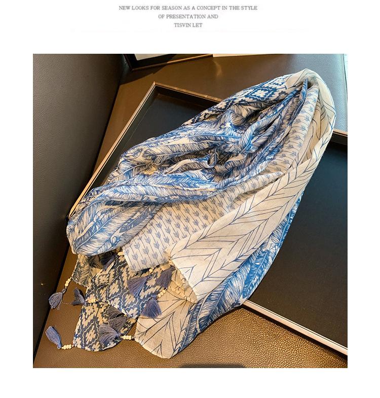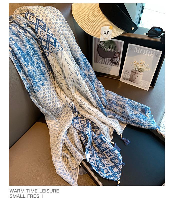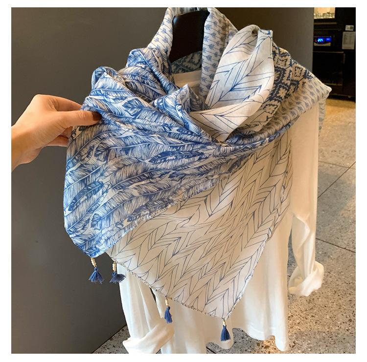 Bufanda de seda para mujer, estilo coreano de verano, fina, combinable, de algodón y lino, con borlas de plumas azules, toalla de playa, chal protector solar