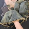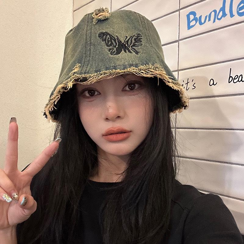 Sombrero de Pescador de Mezclilla con Mariposa Bordada Vintage Estilo Coreano para Mujer Cabeza Grande Cara Pequeña Lavado Viejo Sombrero de Cubo Nuevo Estilo