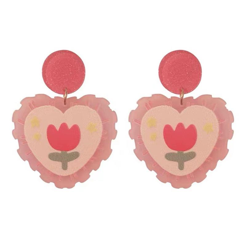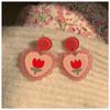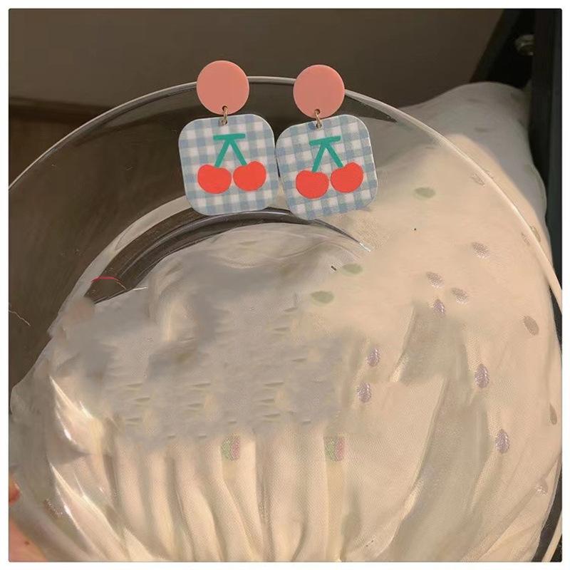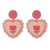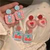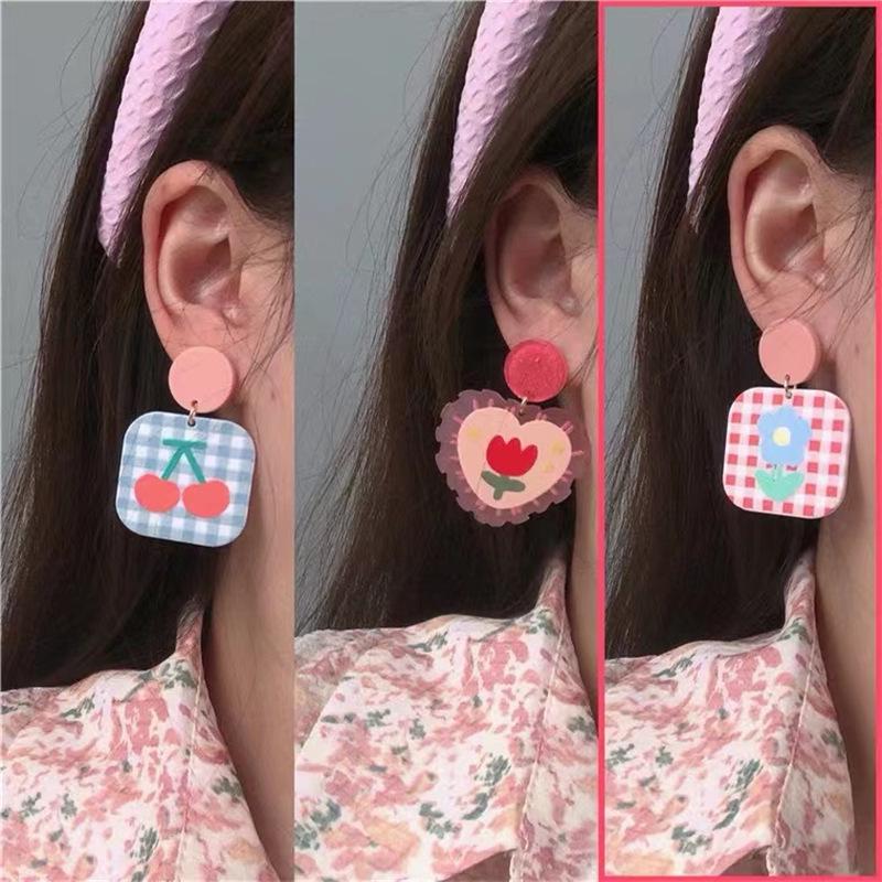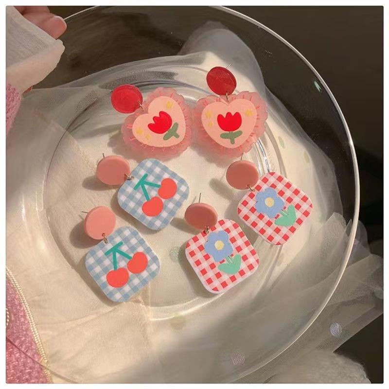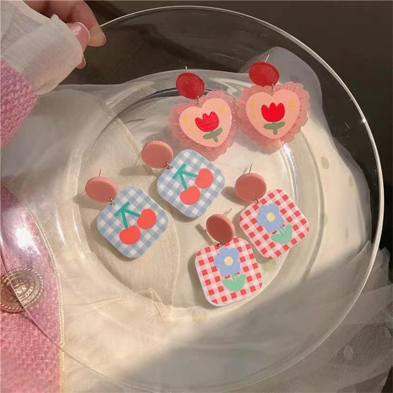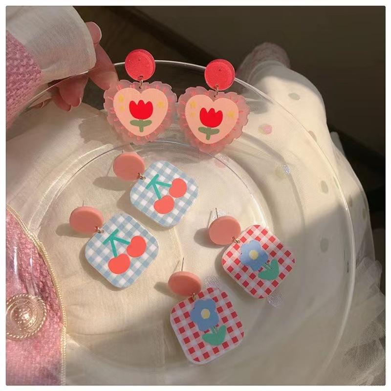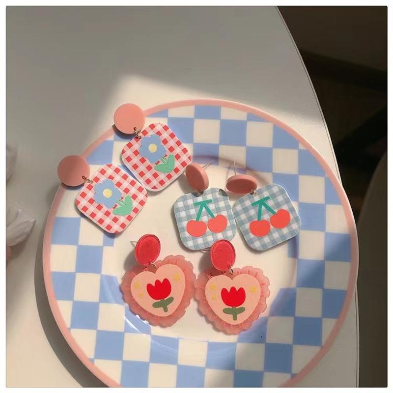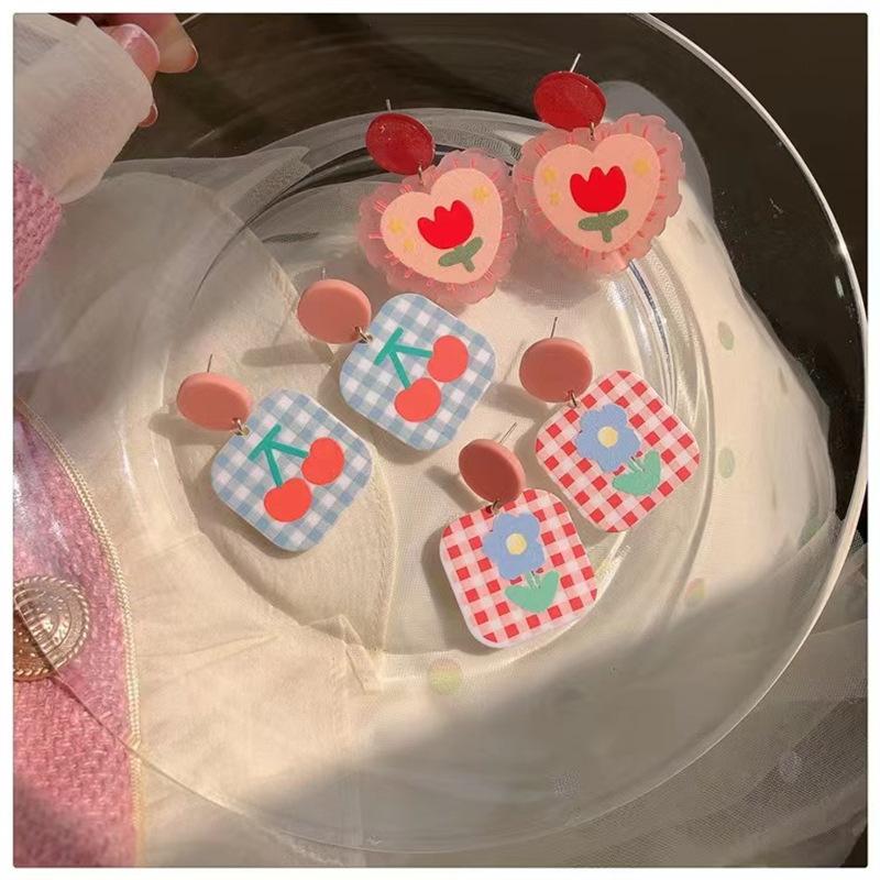 ¡Superprimavera! Pendientes de tulipán rosa con forma de corazón para niña, pendientes dulces con cuadros escoceses de colores contrastantes, pendientes de cereza