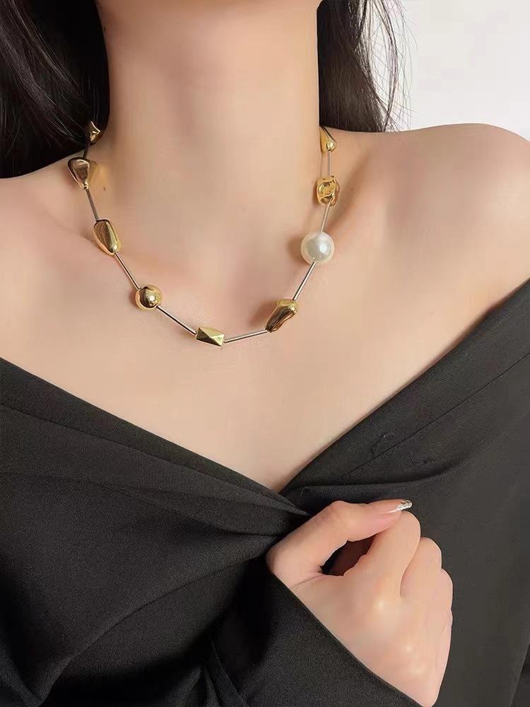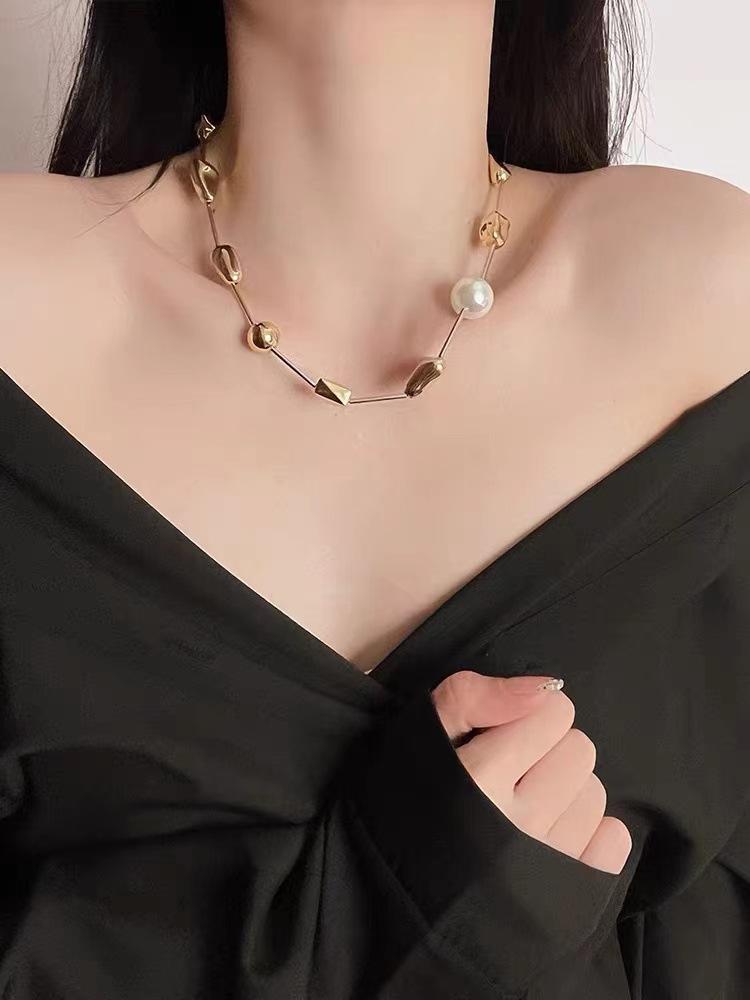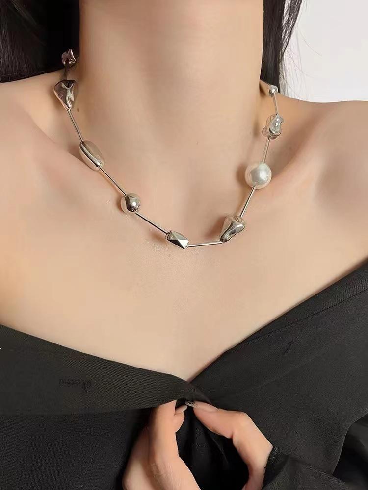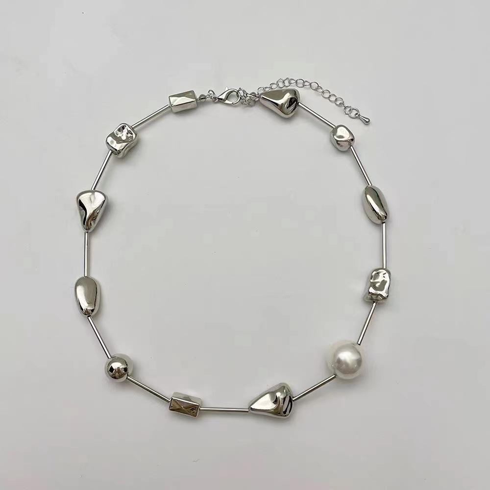 Collar de perlas con costuras de metal irregulares y elegantes de estilo retro para mujer, cadena de clavícula con efecto piedra geométrica de viento frío, cadena de moda