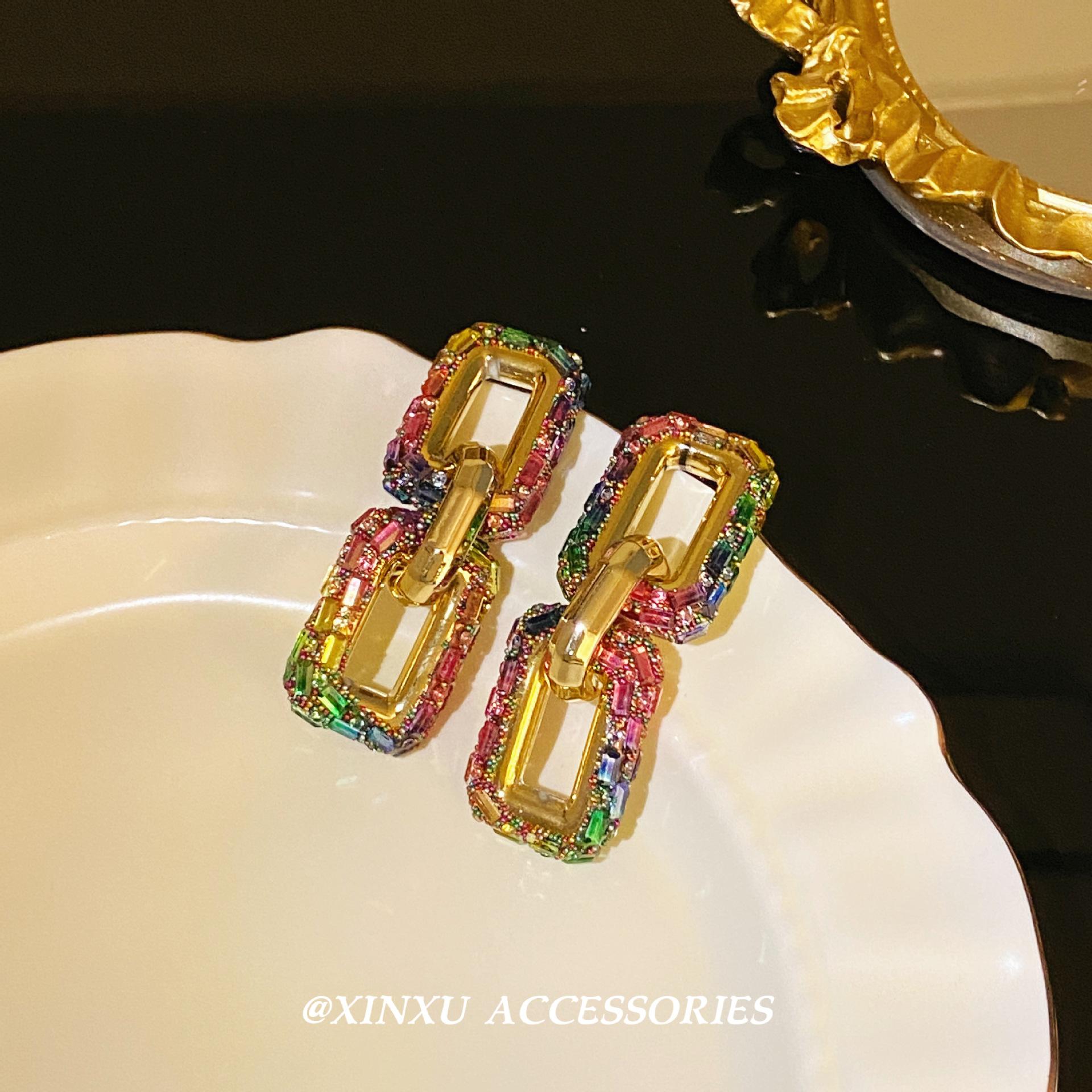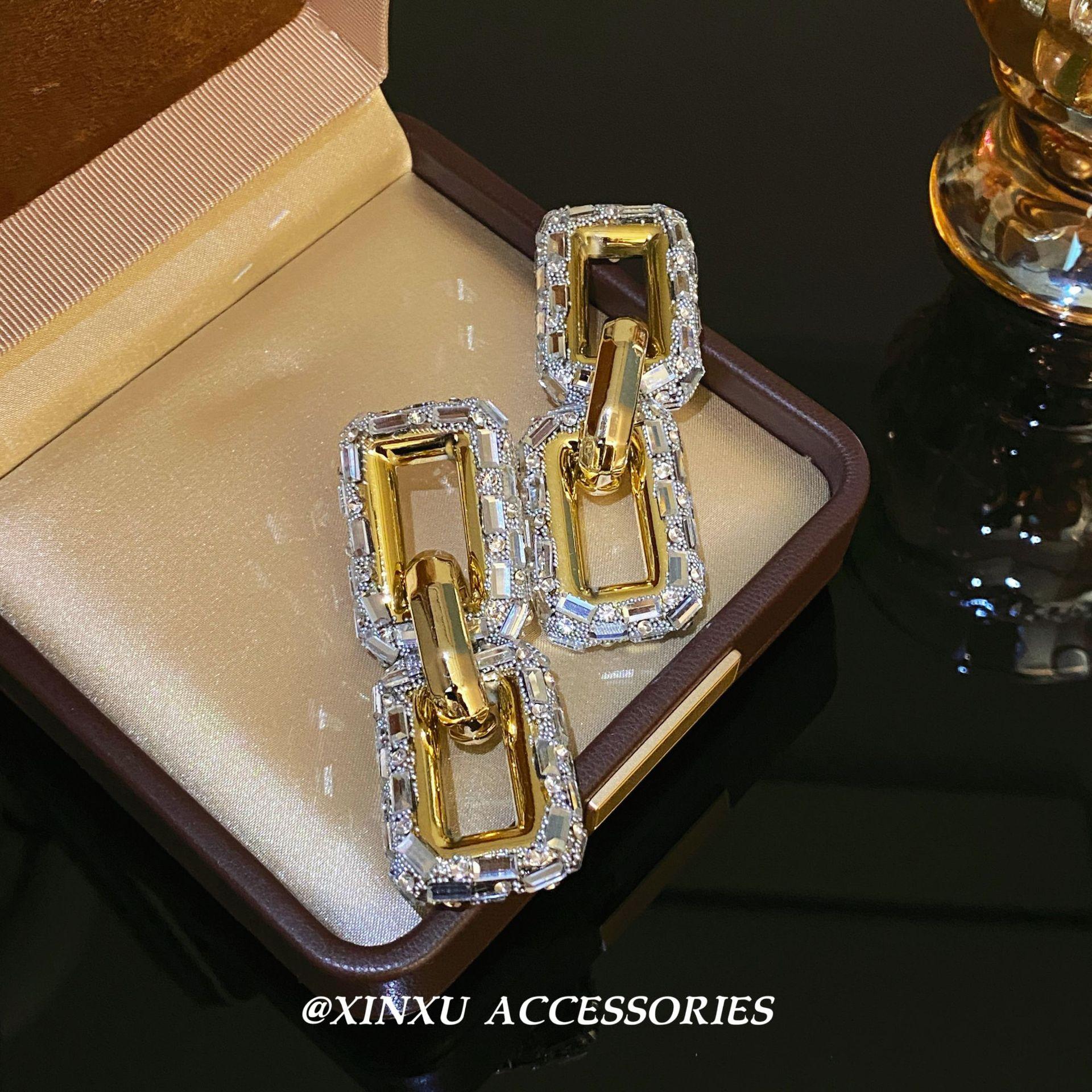 Nuevos pendientes de cadena con forma de caja geométrica europea y americana, con personalidad de temperamento exagerada, de alto sentido, de nicho, sencillos y versátiles.
