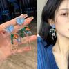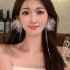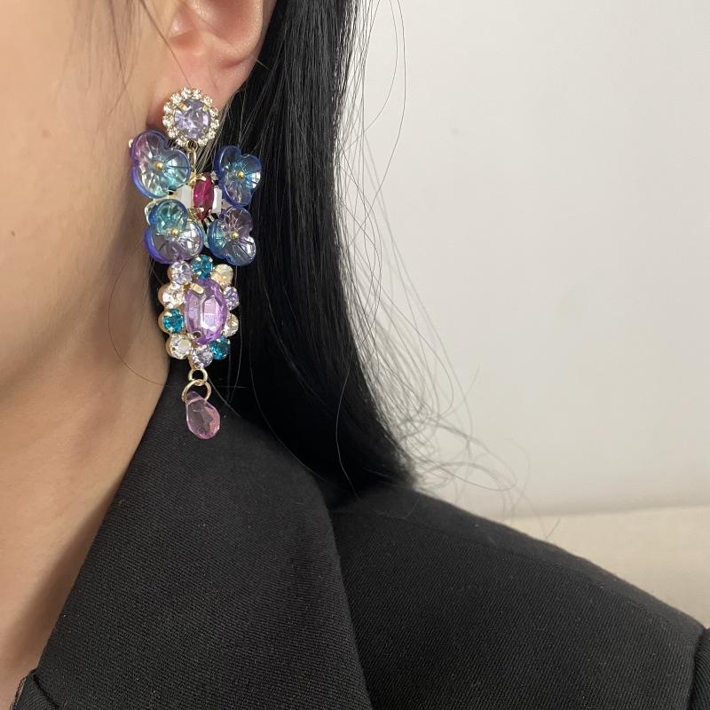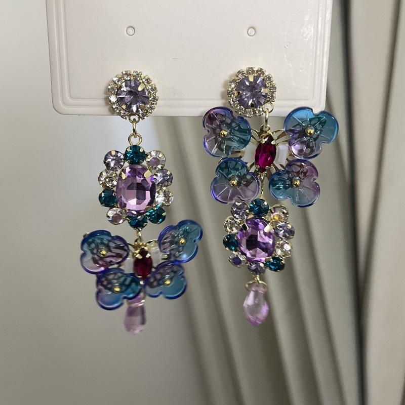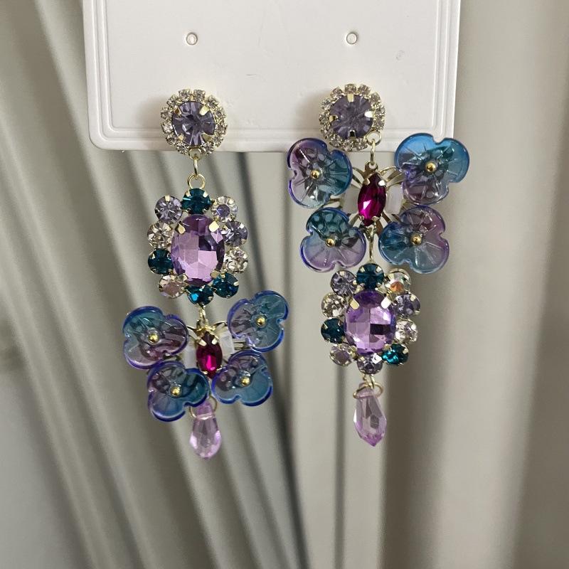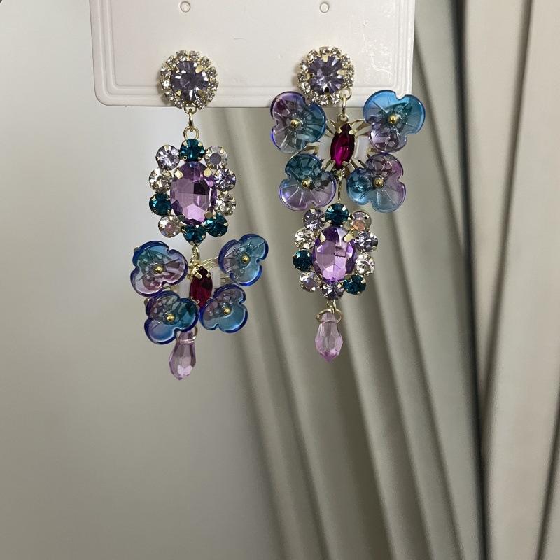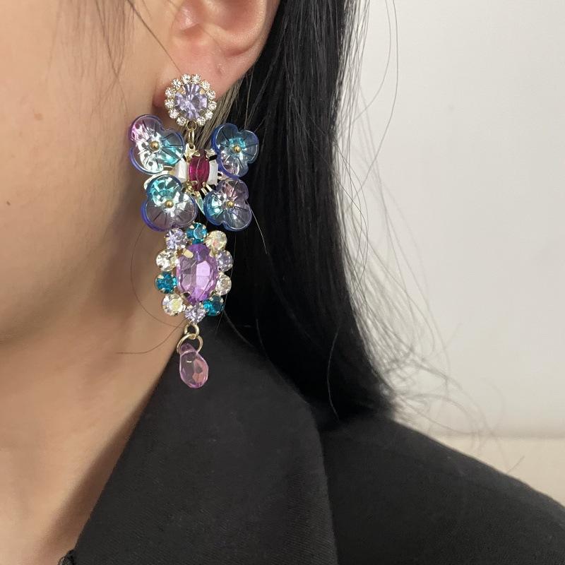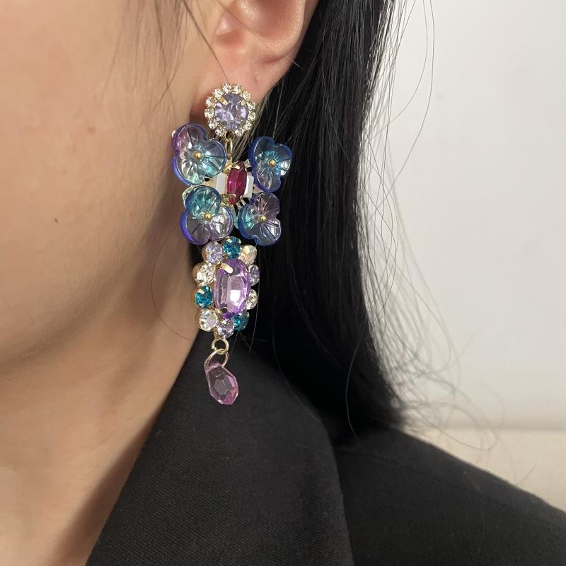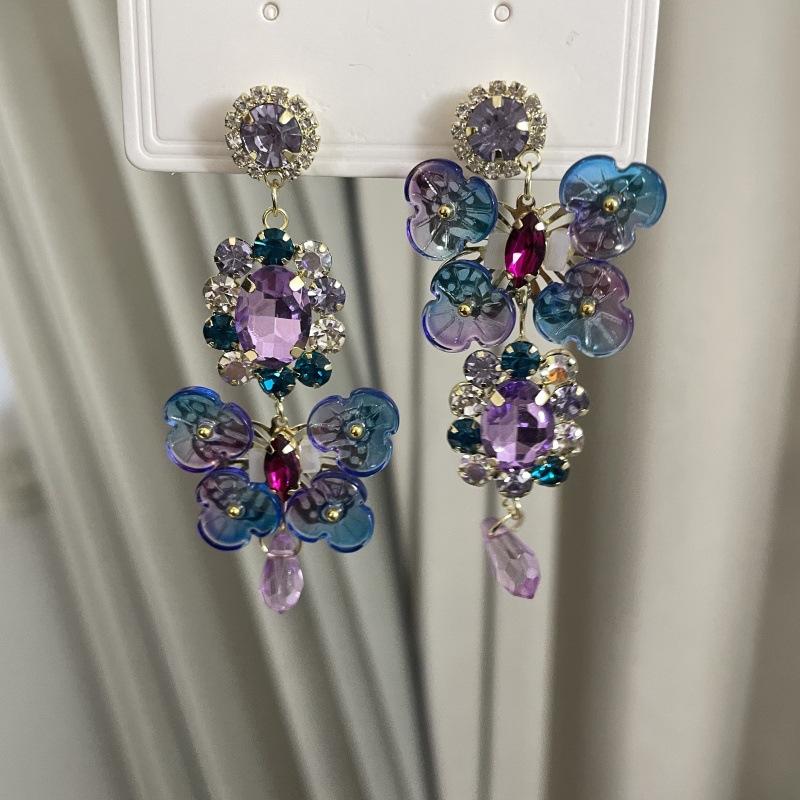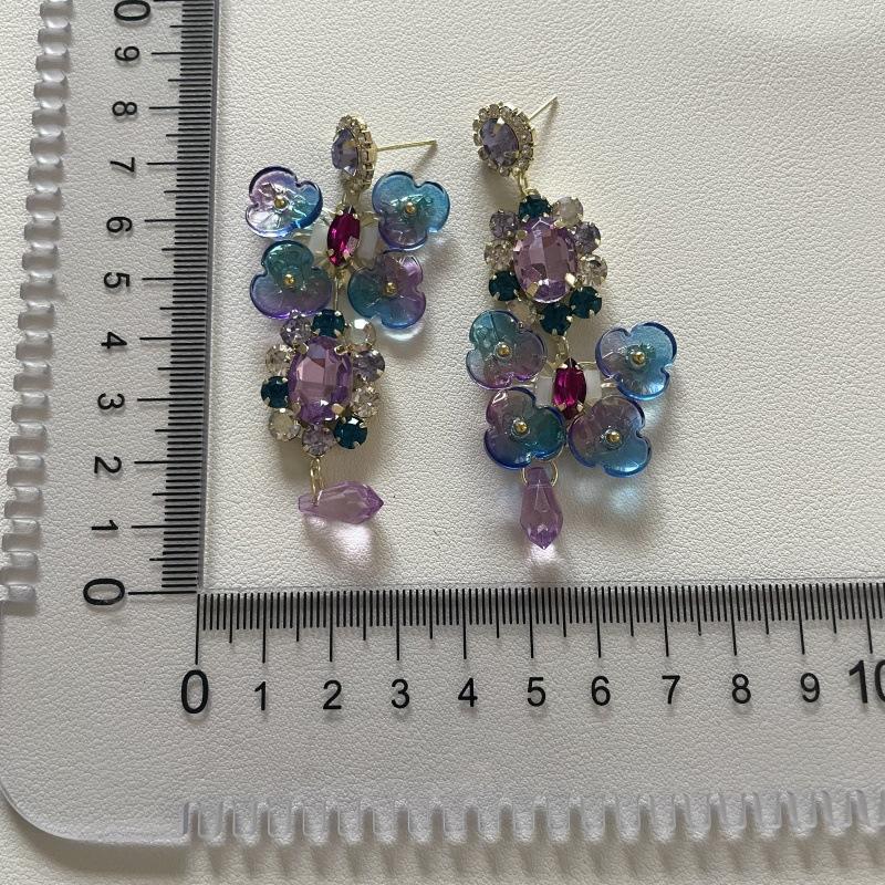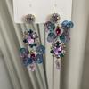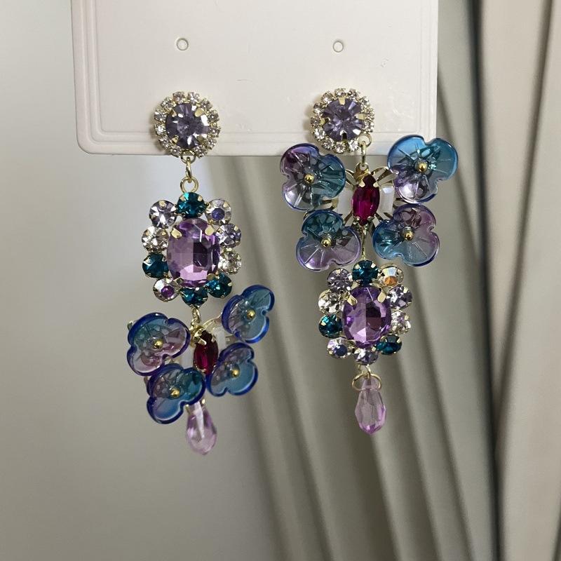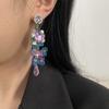Pendientes de borla con diamantes de imitación y flores de colores súper dulces y encantadores para niñas, pequeños y frescos, de tendencia de moda, asimétricos.