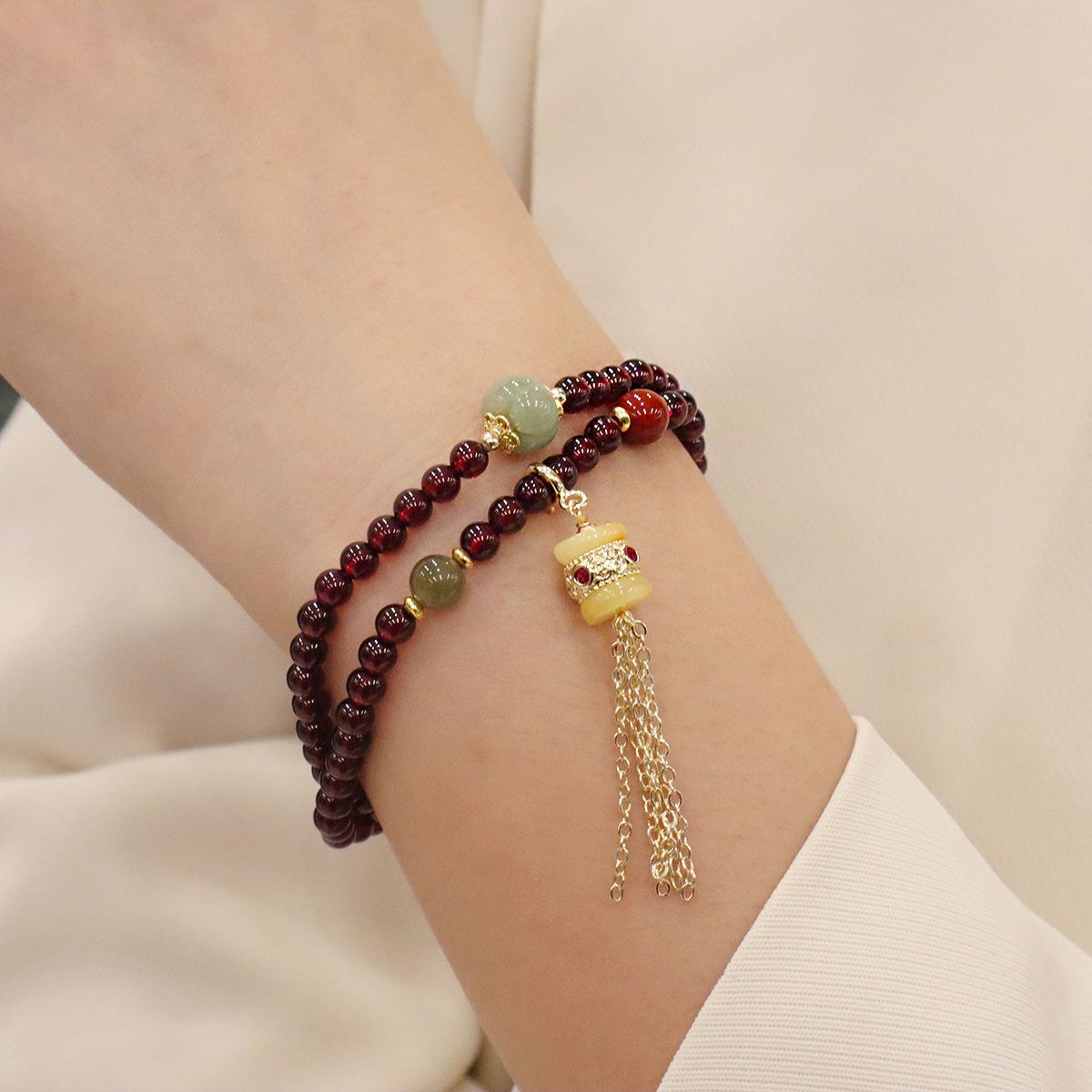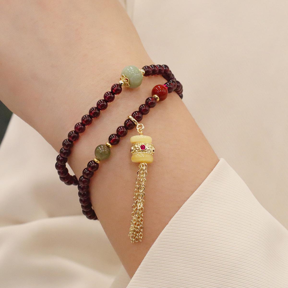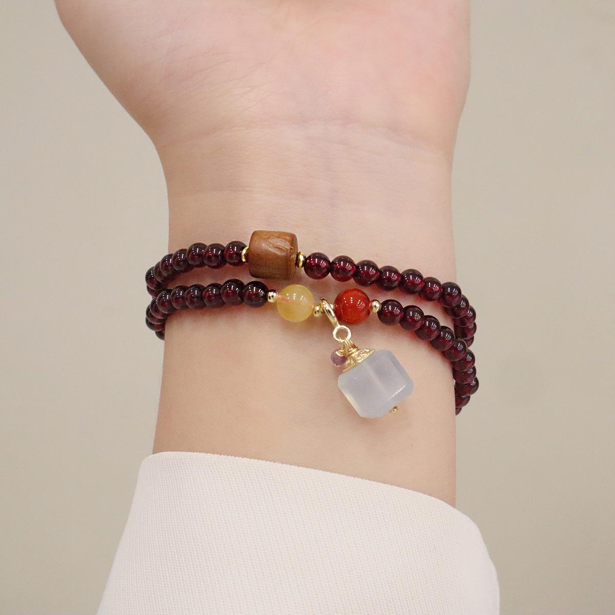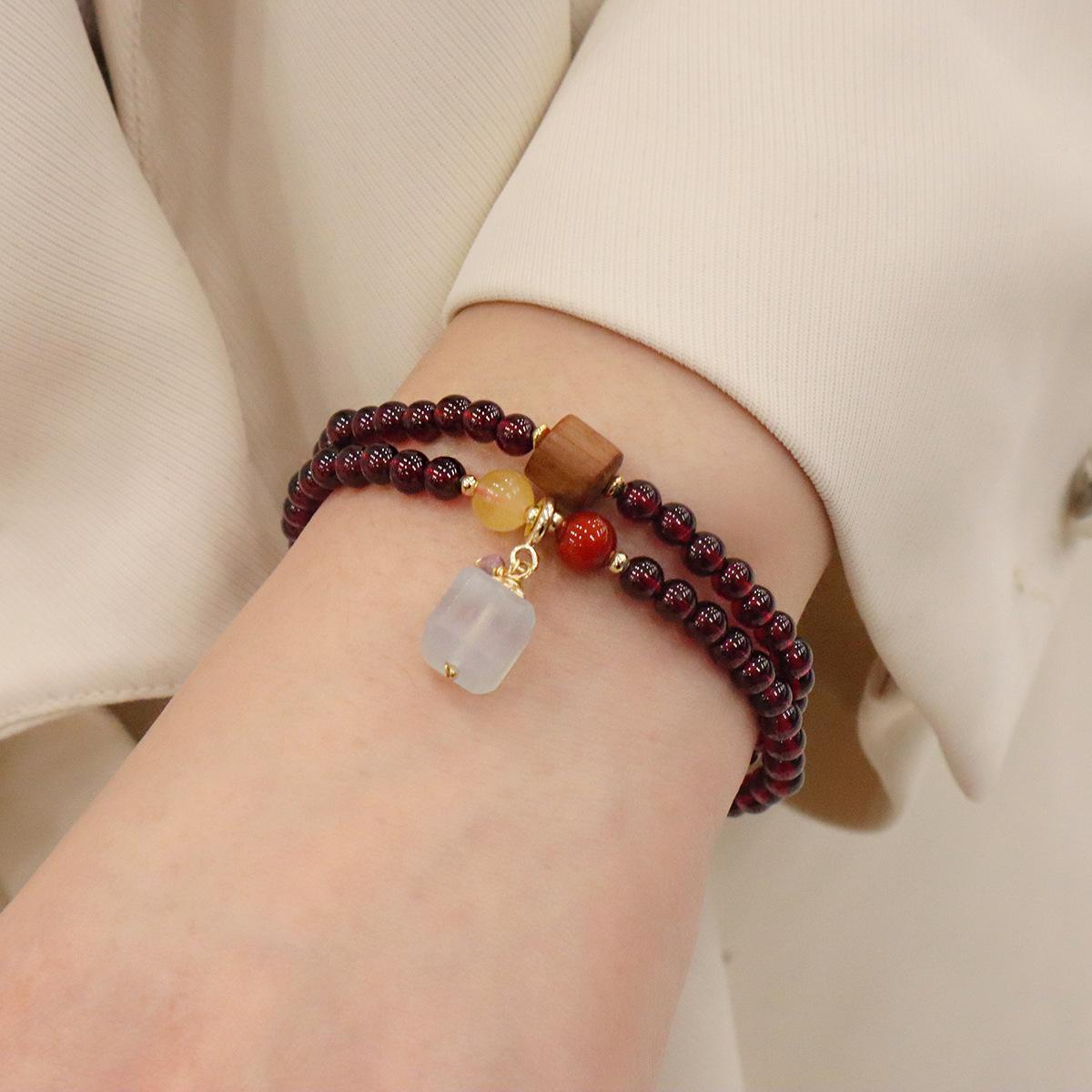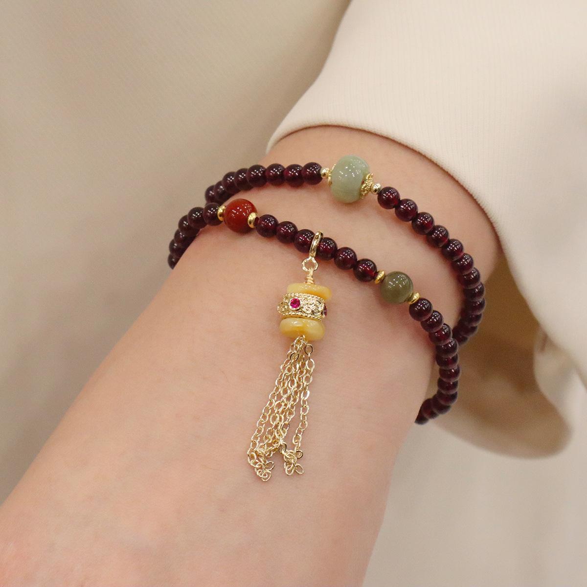 Pulsera de granate de doble anillo natural, pulsera de aguamarina cuadrada de azúcar, cuentas de cera de abeja, pulsera DIY, estilo nacional, estilo simple, joyería