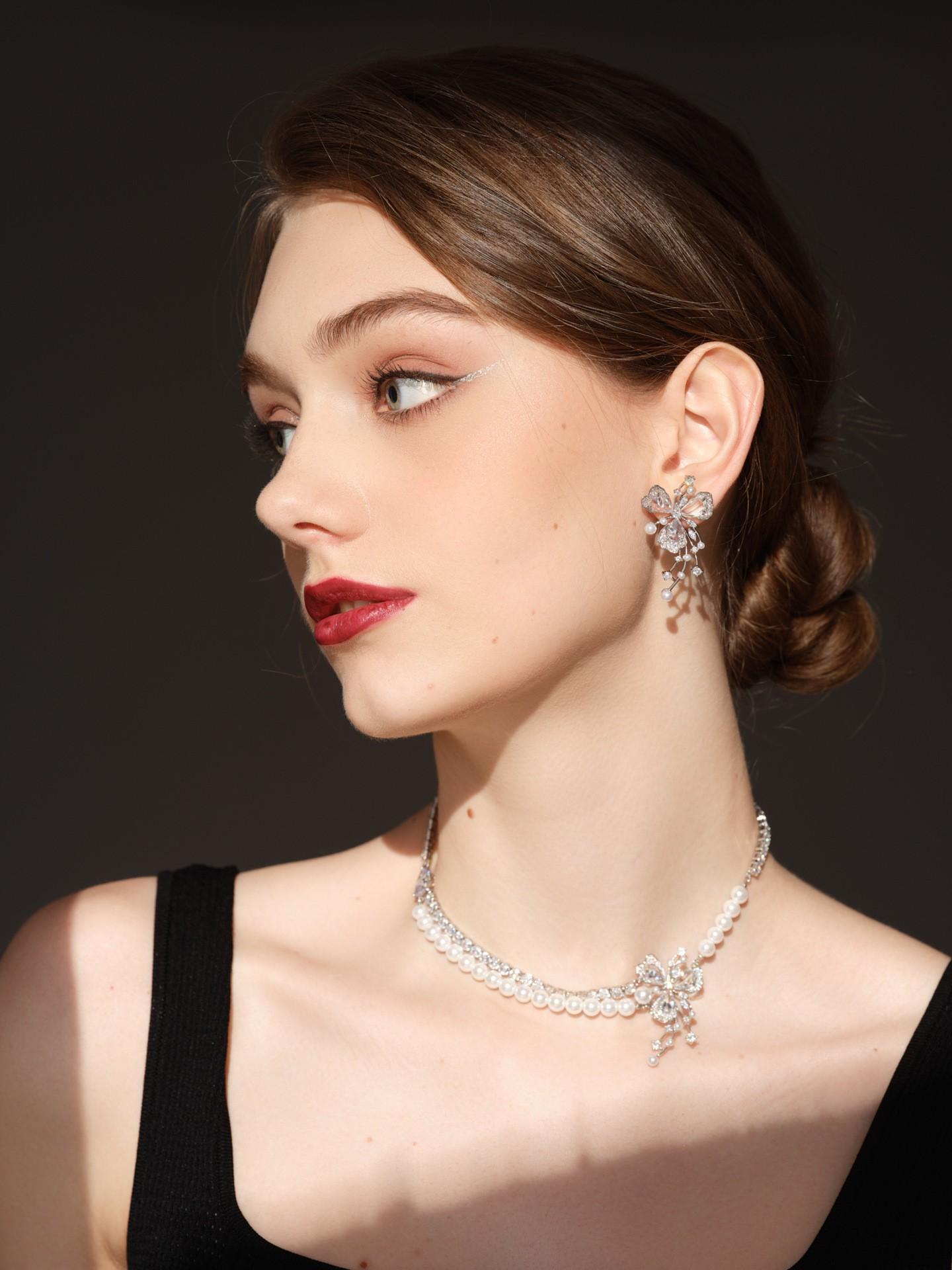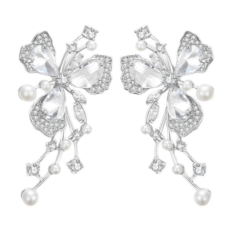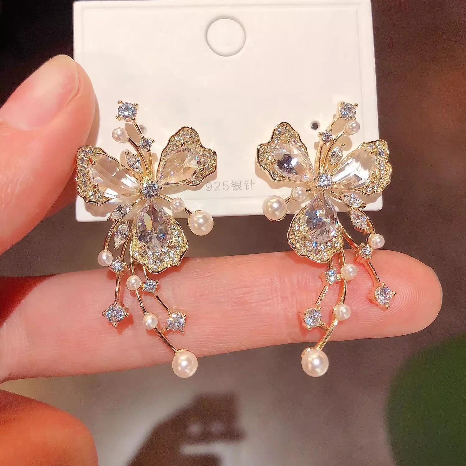 Nuevos pendientes de lujo ligeros con flores de diamantes, nuevos pendientes de mariposa elegantes y exagerados, nuevos pendientes de perlas, pendientes sin agujeros para las orejas.