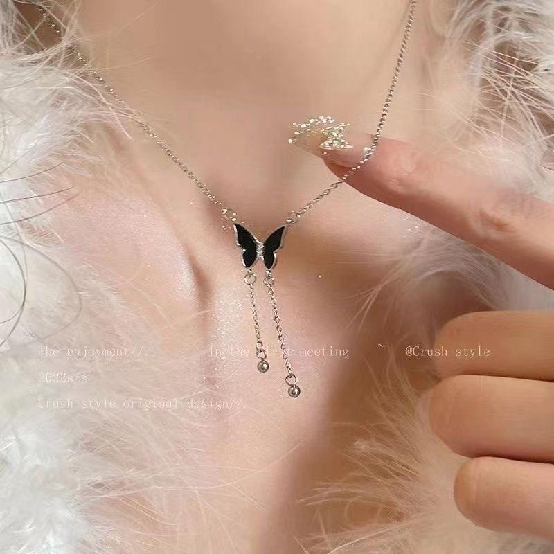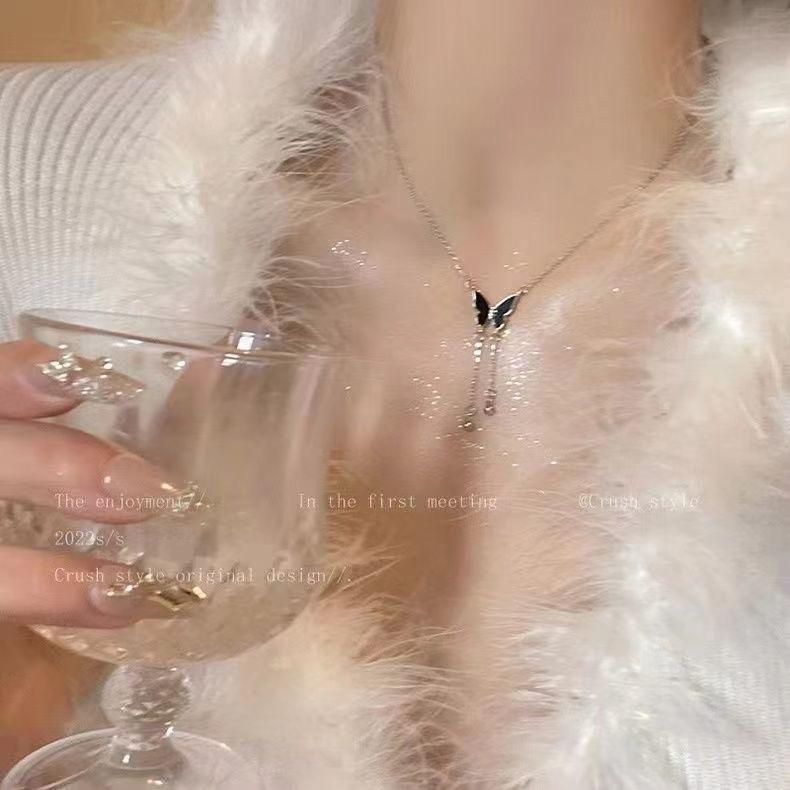 Collar de mariposa con borlas negras Tiancai de Pure Wish para mujer, diseño moderno de nicho, cadena de lana distintiva, cadena de clavícula ligera y lujosa.