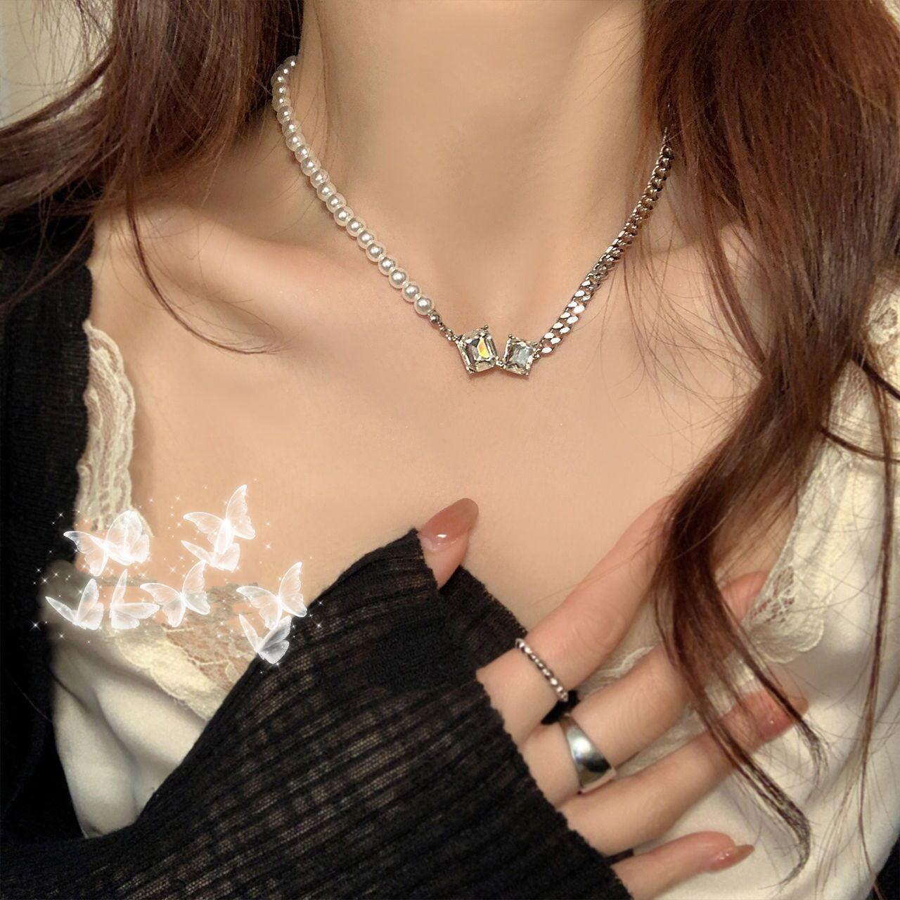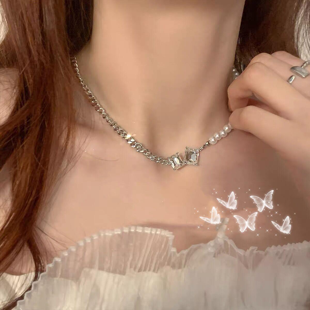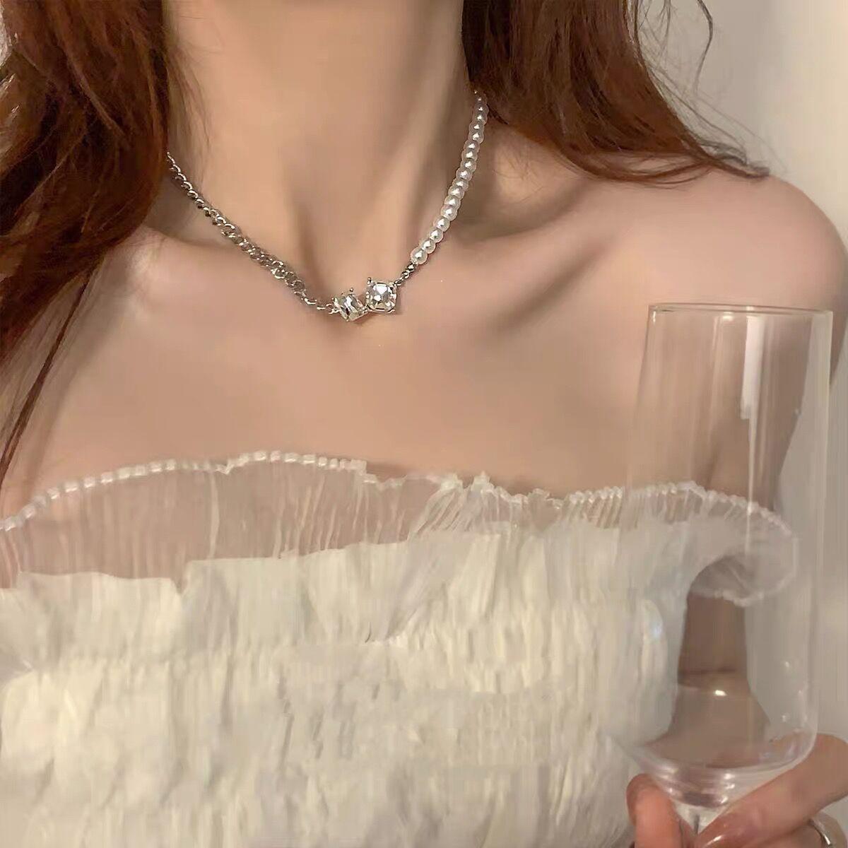 Collar con cuentas de circonitas cuadradas y perlas para mujer, cadena de clavícula ligera y lujosa de estilo Spice Girl, estilo verano