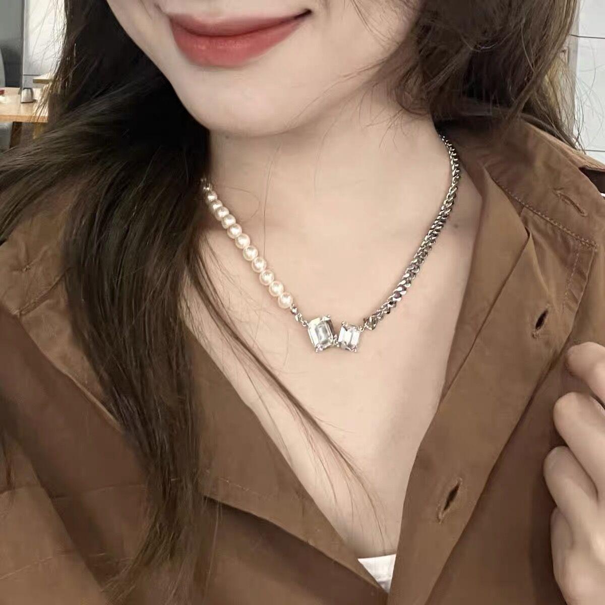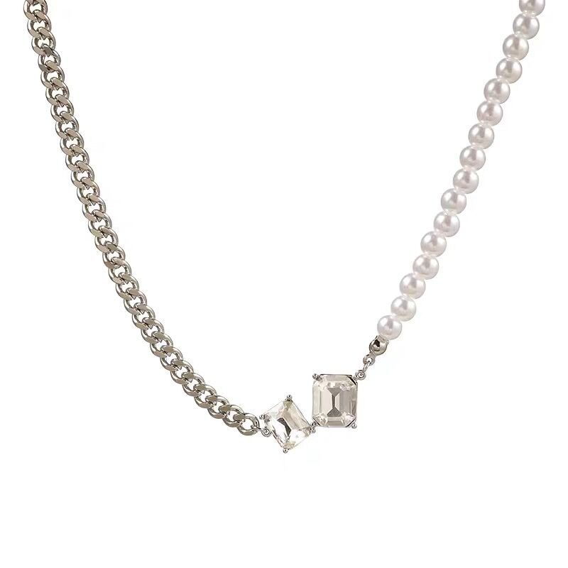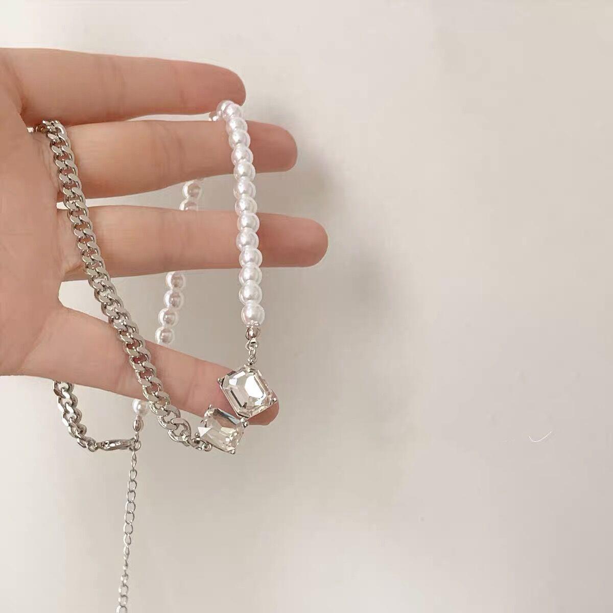 Collar con cuentas de circonitas cuadradas y perlas para mujer, cadena de clavícula ligera y lujosa de estilo Spice Girl, estilo verano