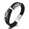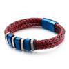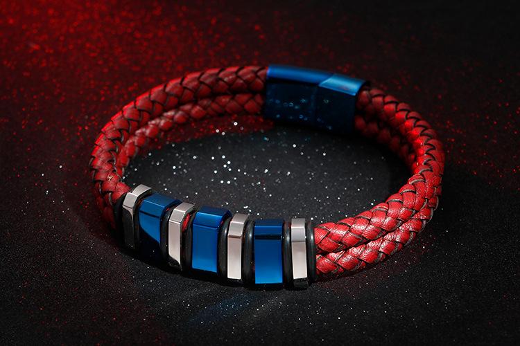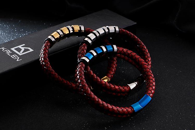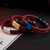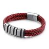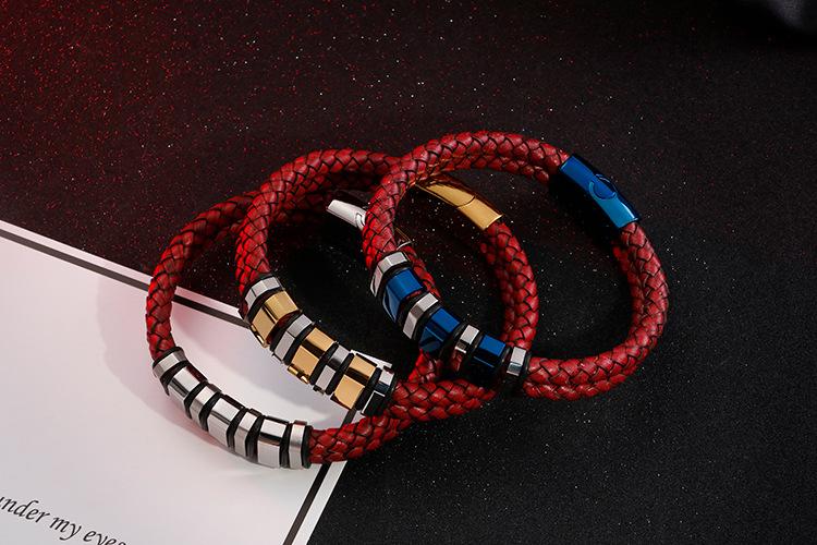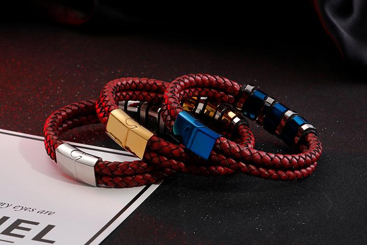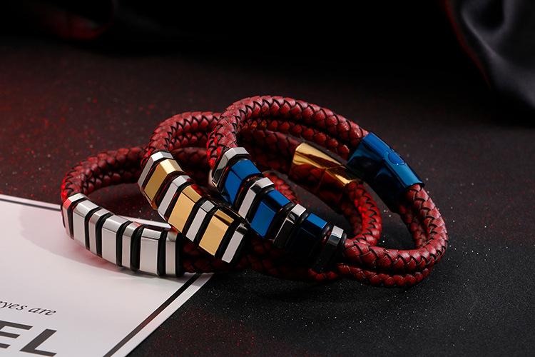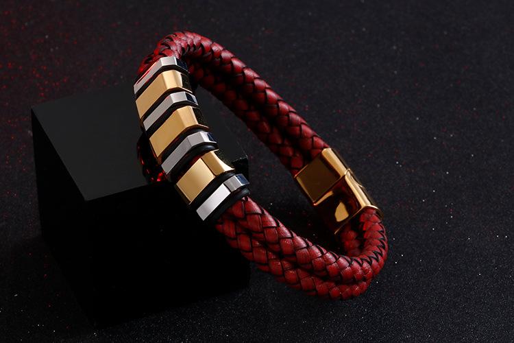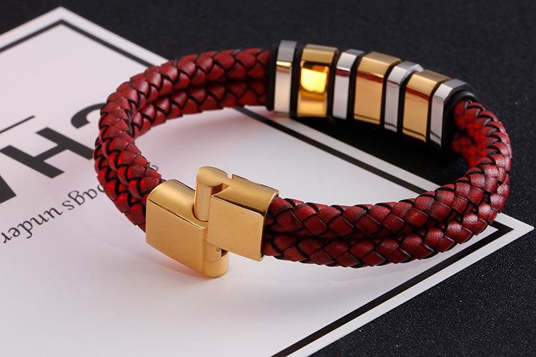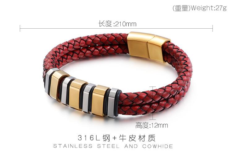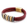 Pulsera de acero de titanio con cuerda de cuero tejido doble de piel de vaca roja para hombre, pulsera de acero inoxidable chapada en oro, estilo europeo y americano