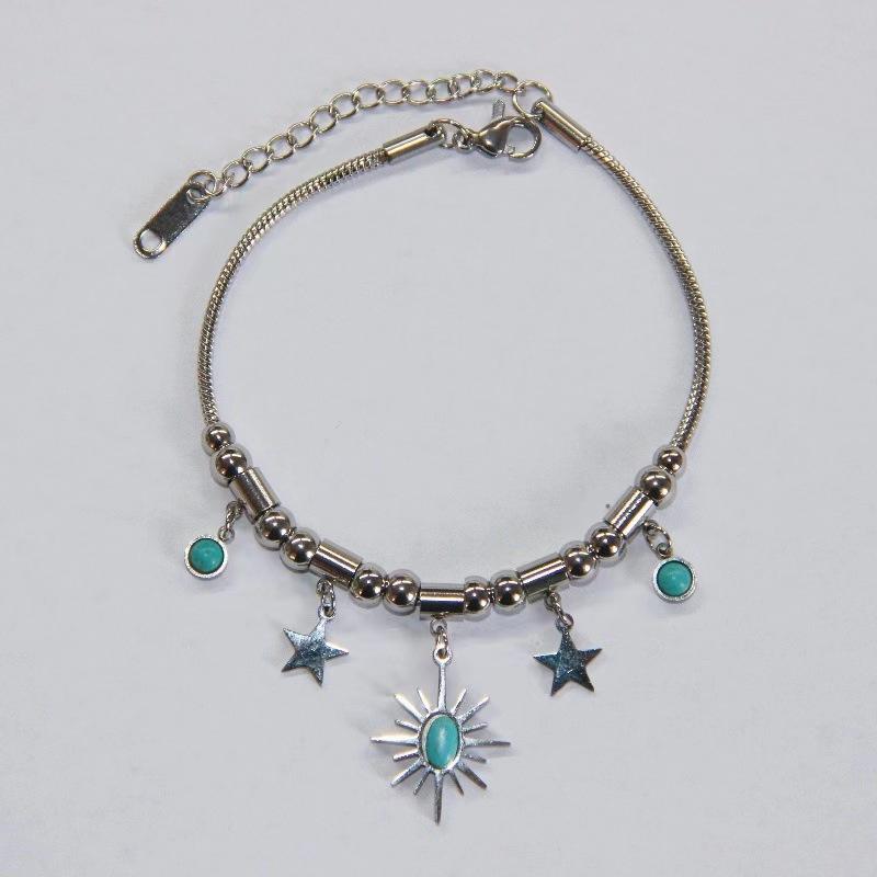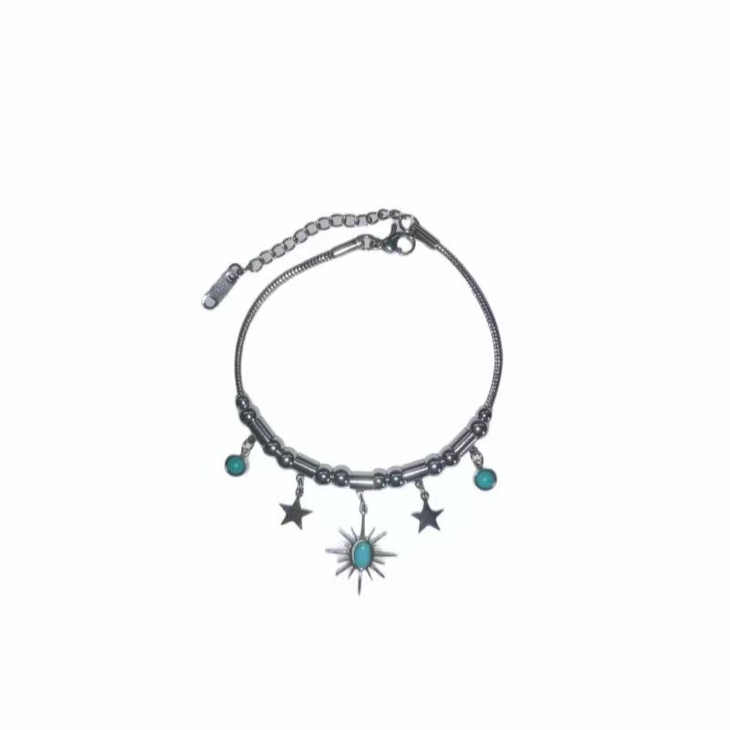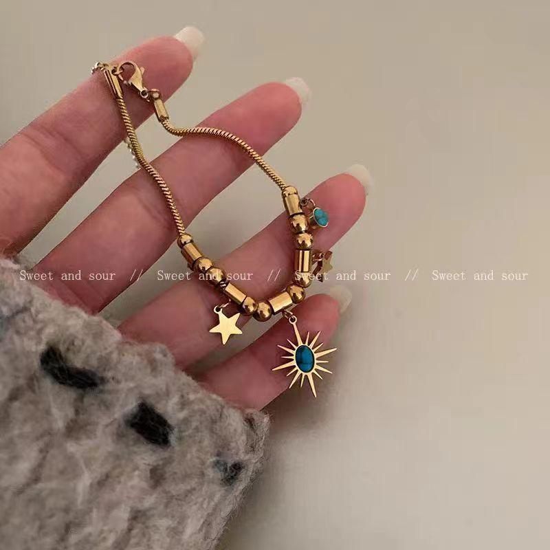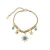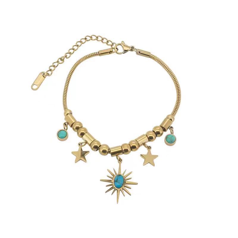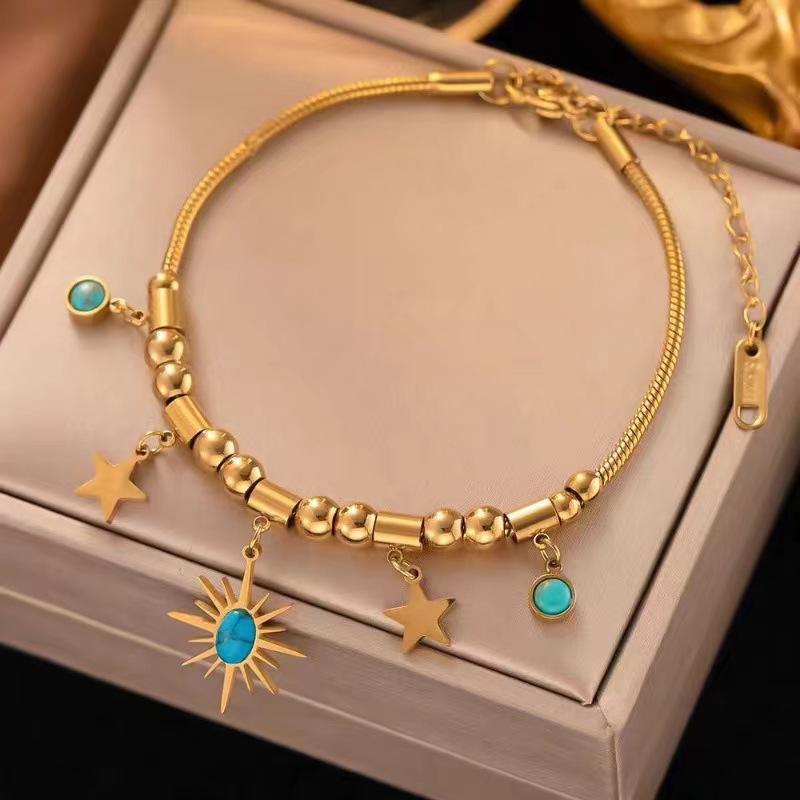 Pulsera de Cuentas de Girasol de Acero de Titanio con Pentagrama Incrustado con Joyería de Turquesa Azul, Oro de 18K Estilo Geométrico que No se Desvanece