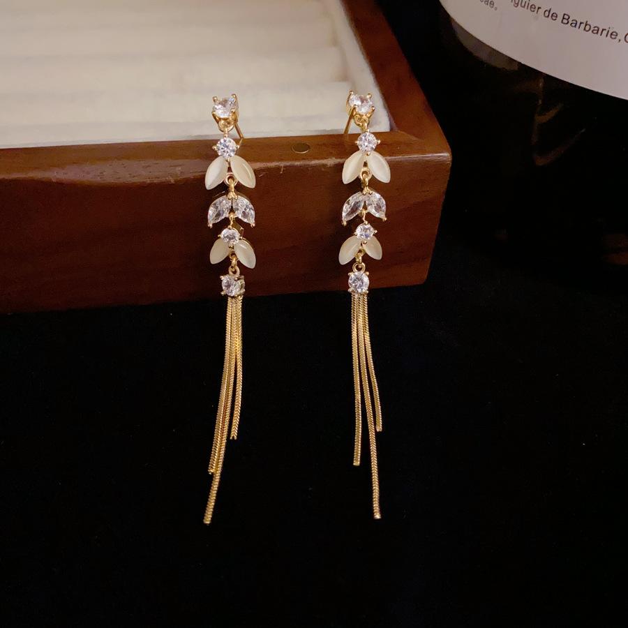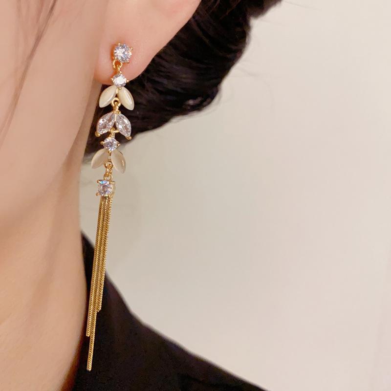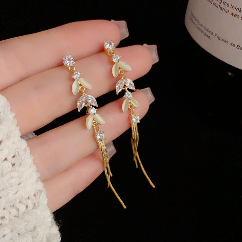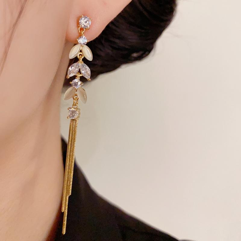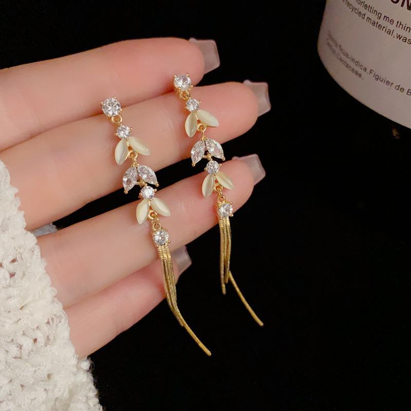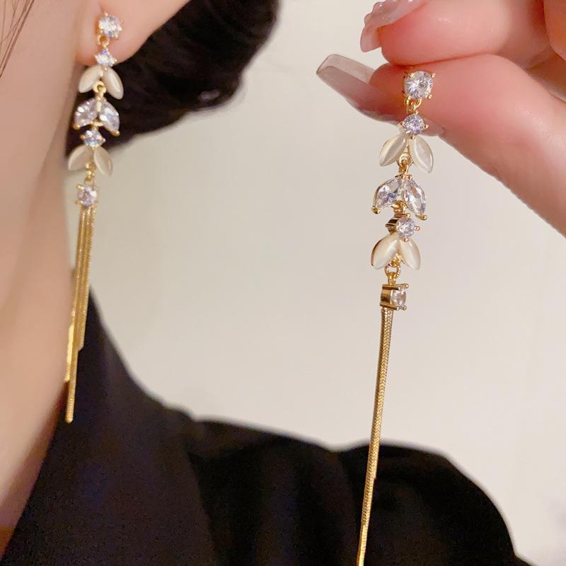 Compra Pendientes largos con borlas y hojas de piedra de ojo de gato de circonita de alta calidad, ligeros y de lujo de nicho, exquisitos y versátiles, pendientes delgados al por mayor al por mayor en Joom.pro