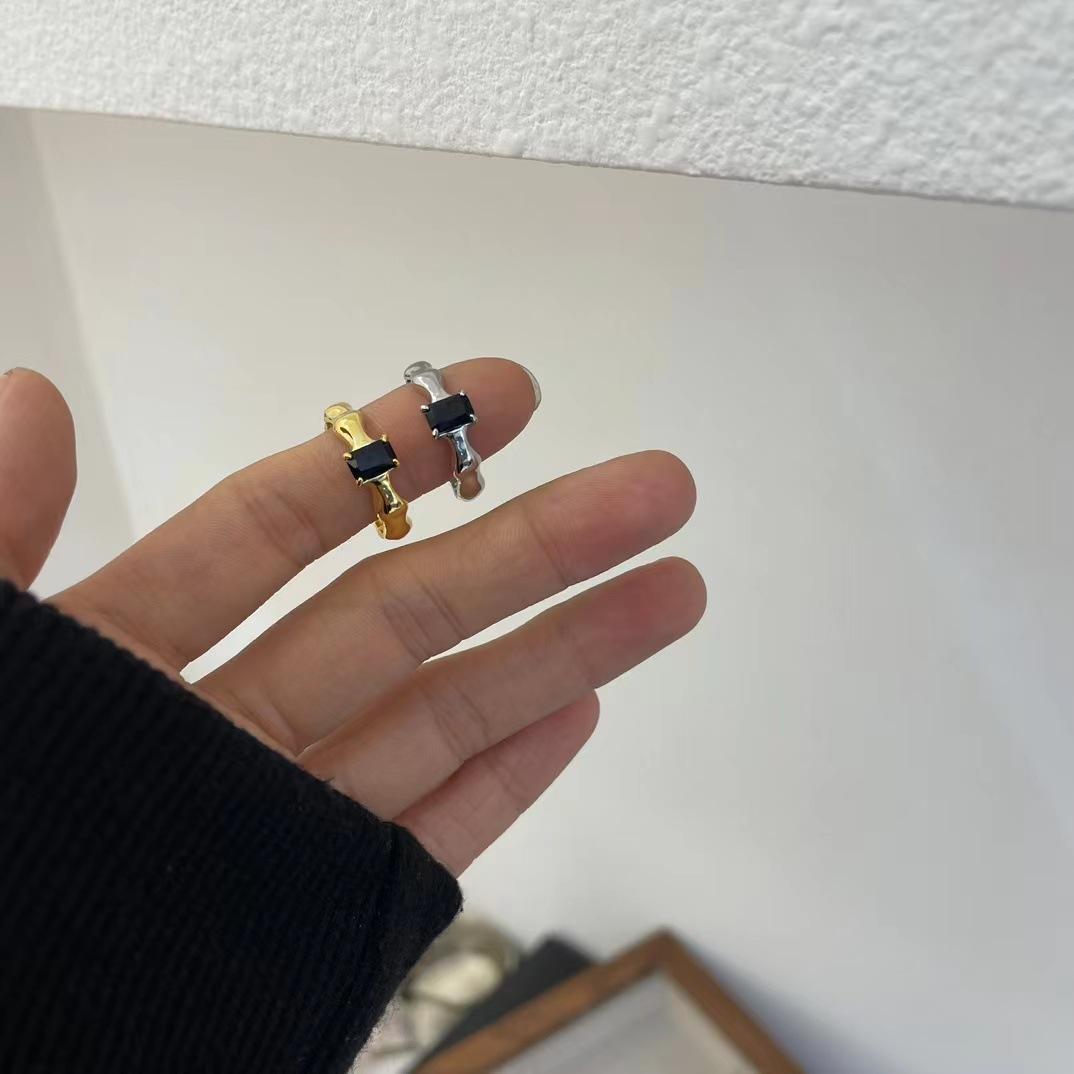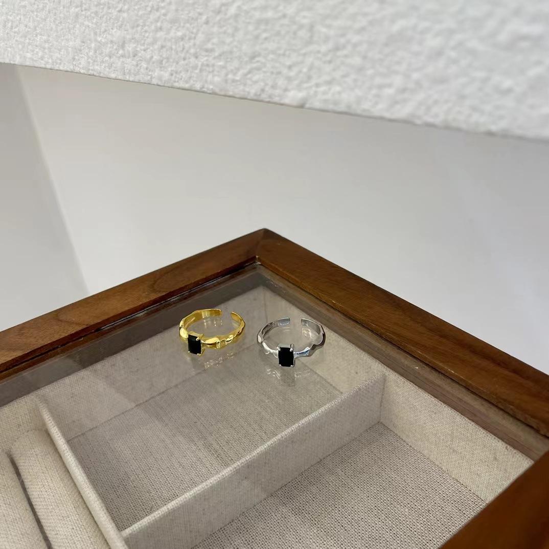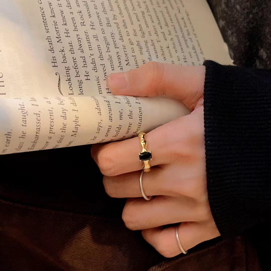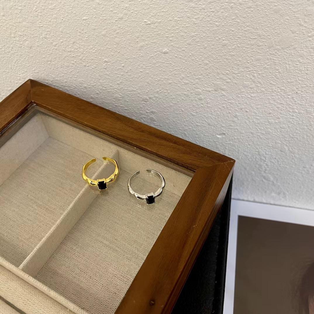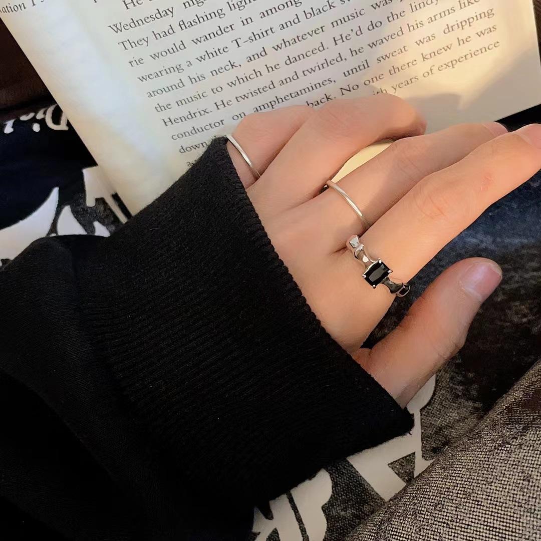 Anillo de apertura para mujer con diseño de nicho francés, diseño de onda con forma de diamante cuadrado negro, estilo libro rojo de viento, s925