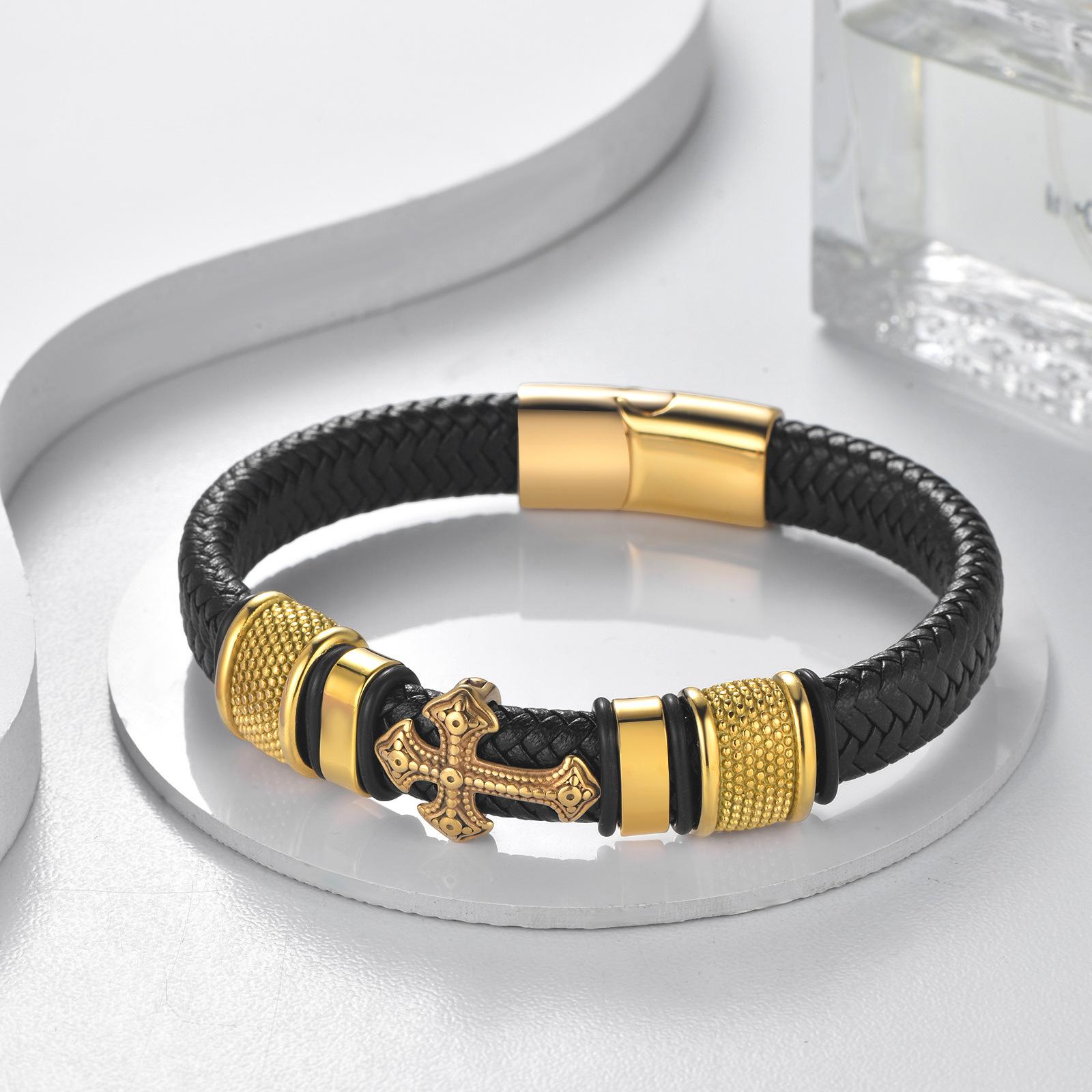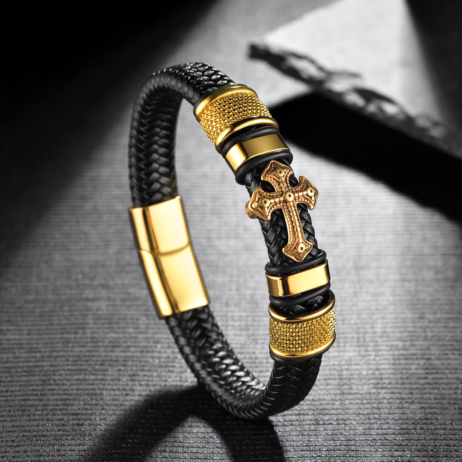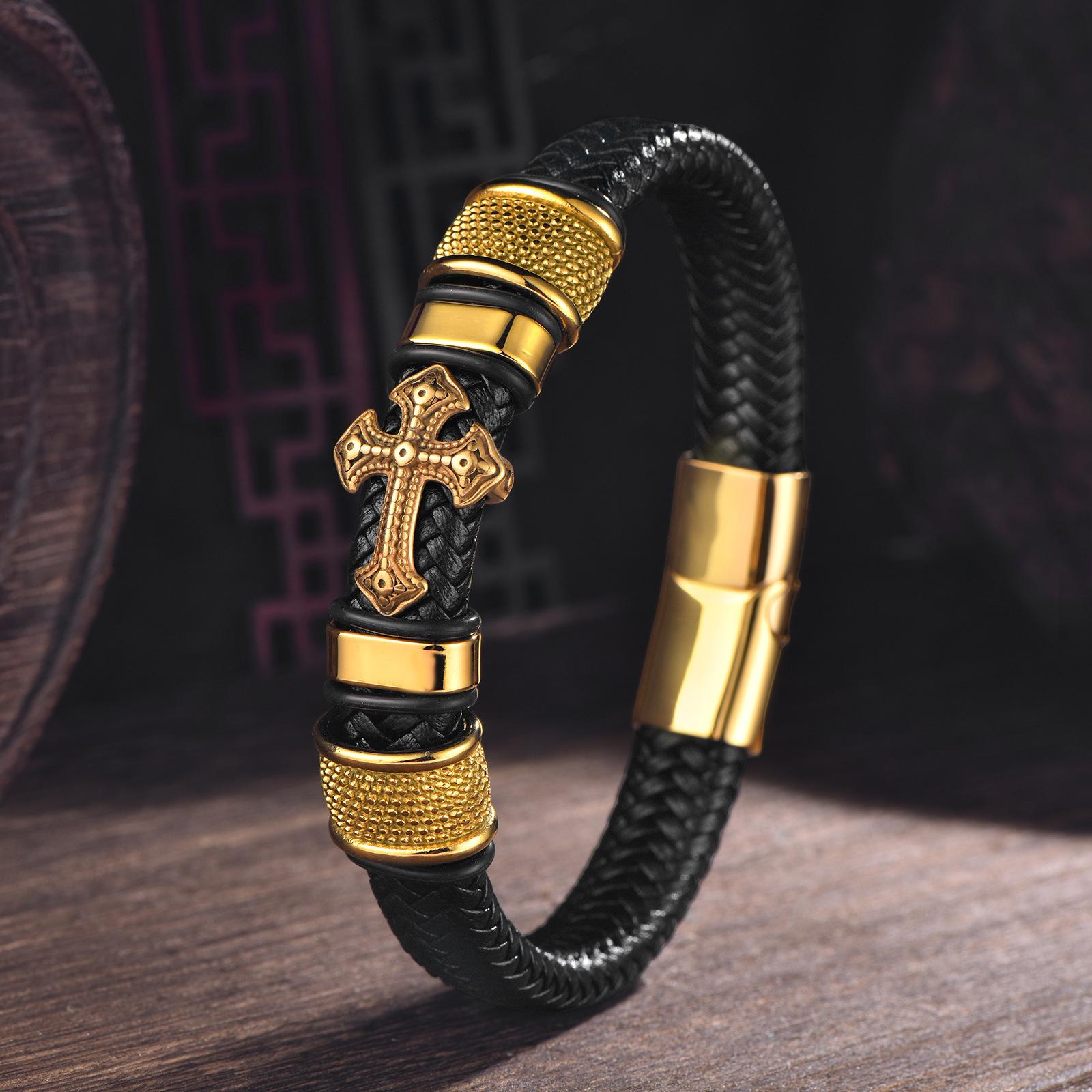 Pulsera de cuero tejida a mano, de gran oferta transfronteriza, nueva pulsera de cuero vintage con cruz dorada de moda para hombre.