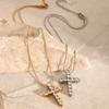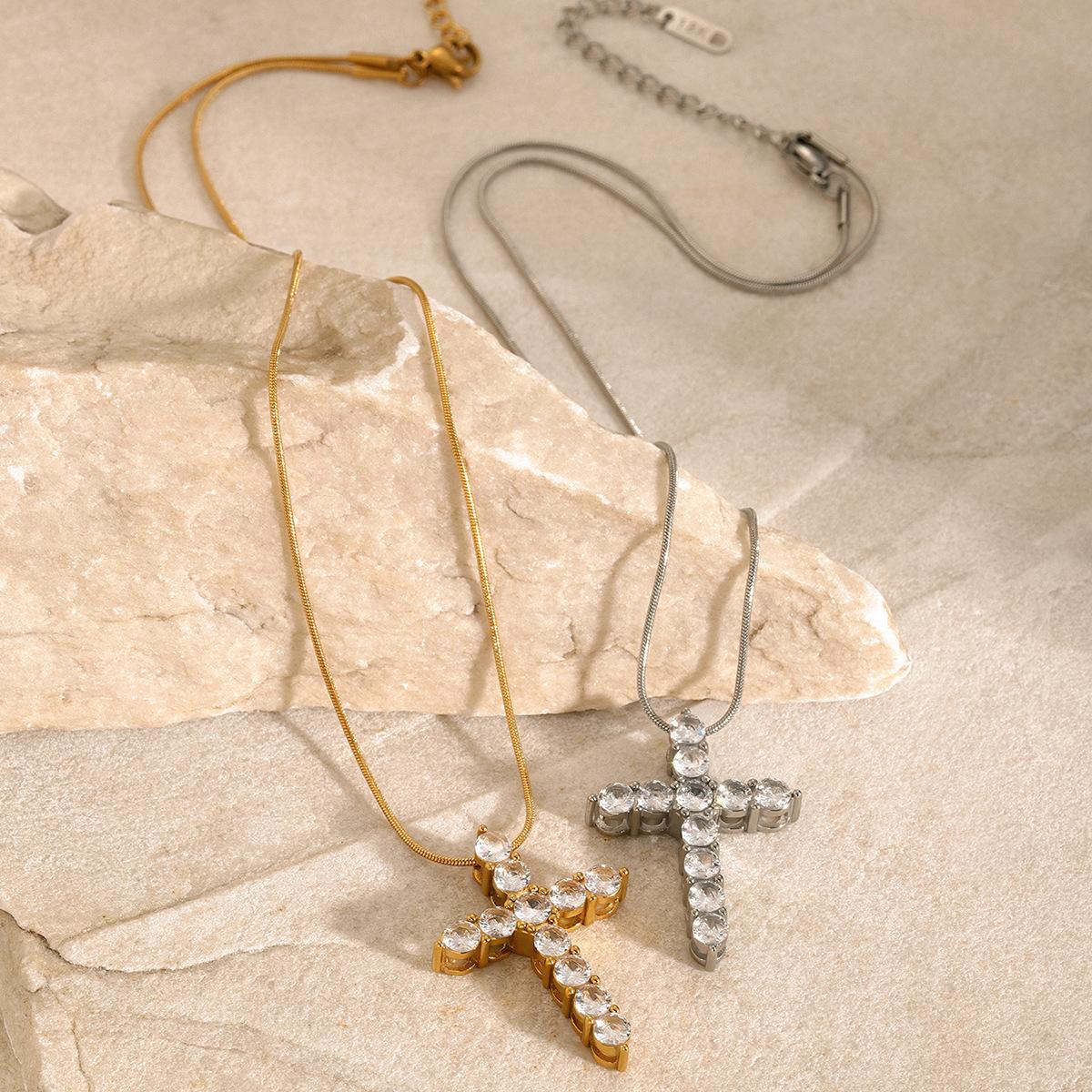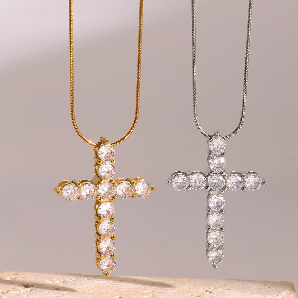 Collar con colgante de cruz de circonita blanca redonda de acero inoxidable y oro de 18 quilates para mujer, joyería transfronteriza europea y americana, venta al por mayor para mujer