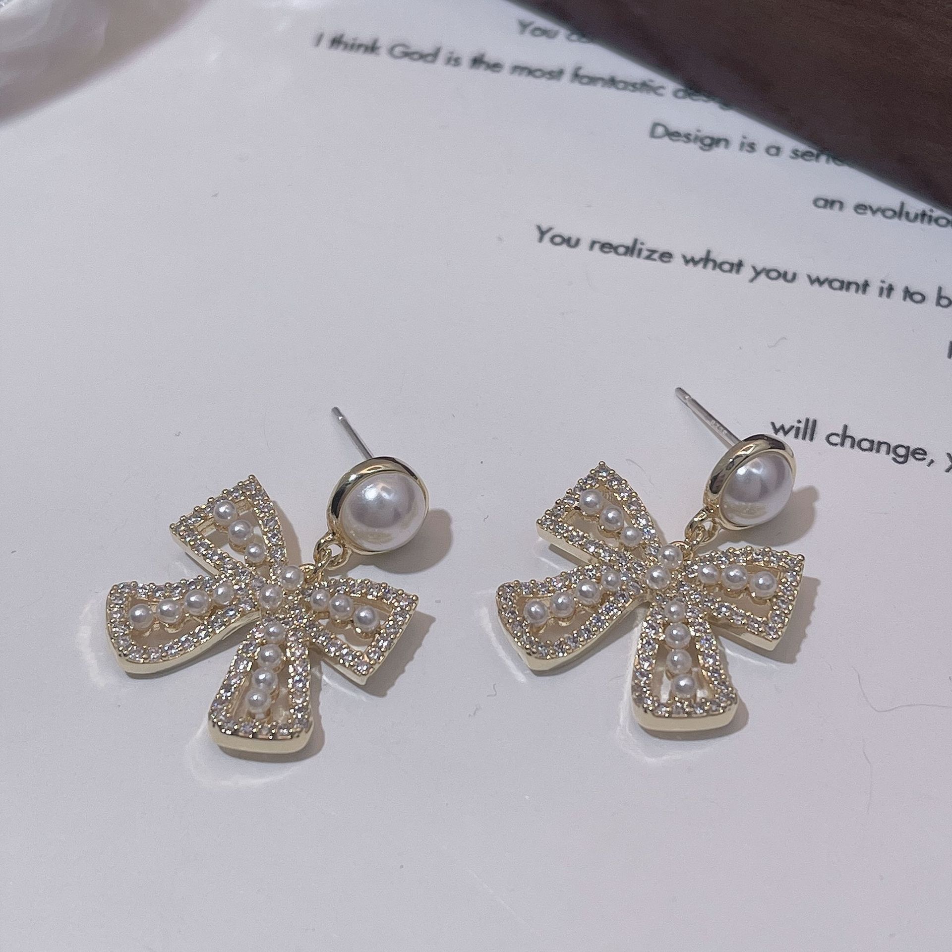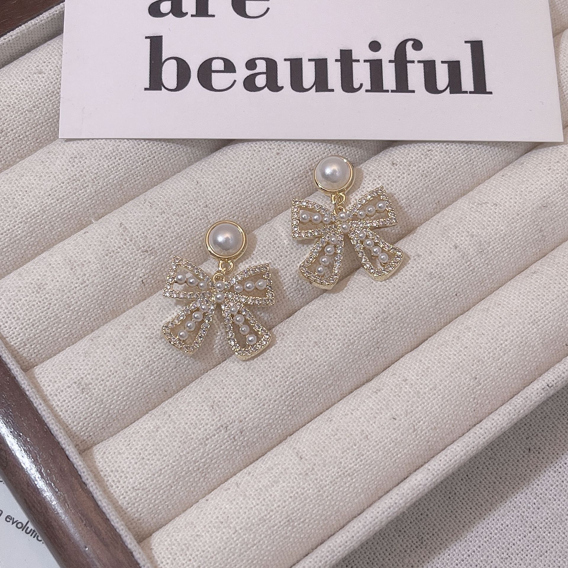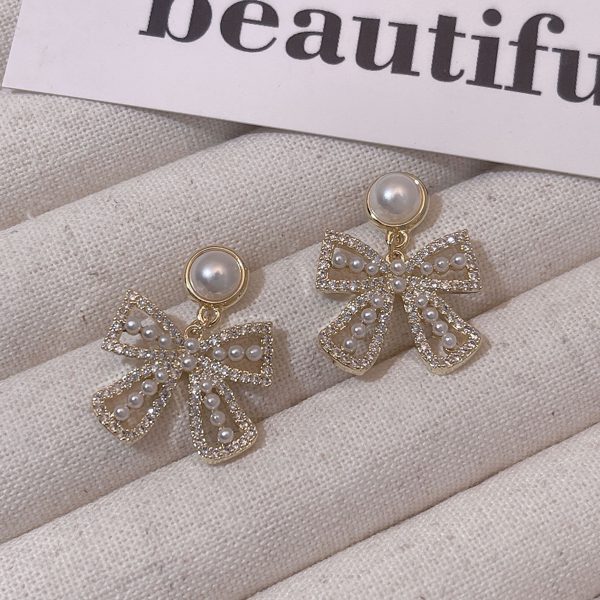 Pendientes de perlas con lazo de circonita con microincrustaciones de temperamento exquisito, diseño de nicho, pendientes de moda dulces que combinan con todo.