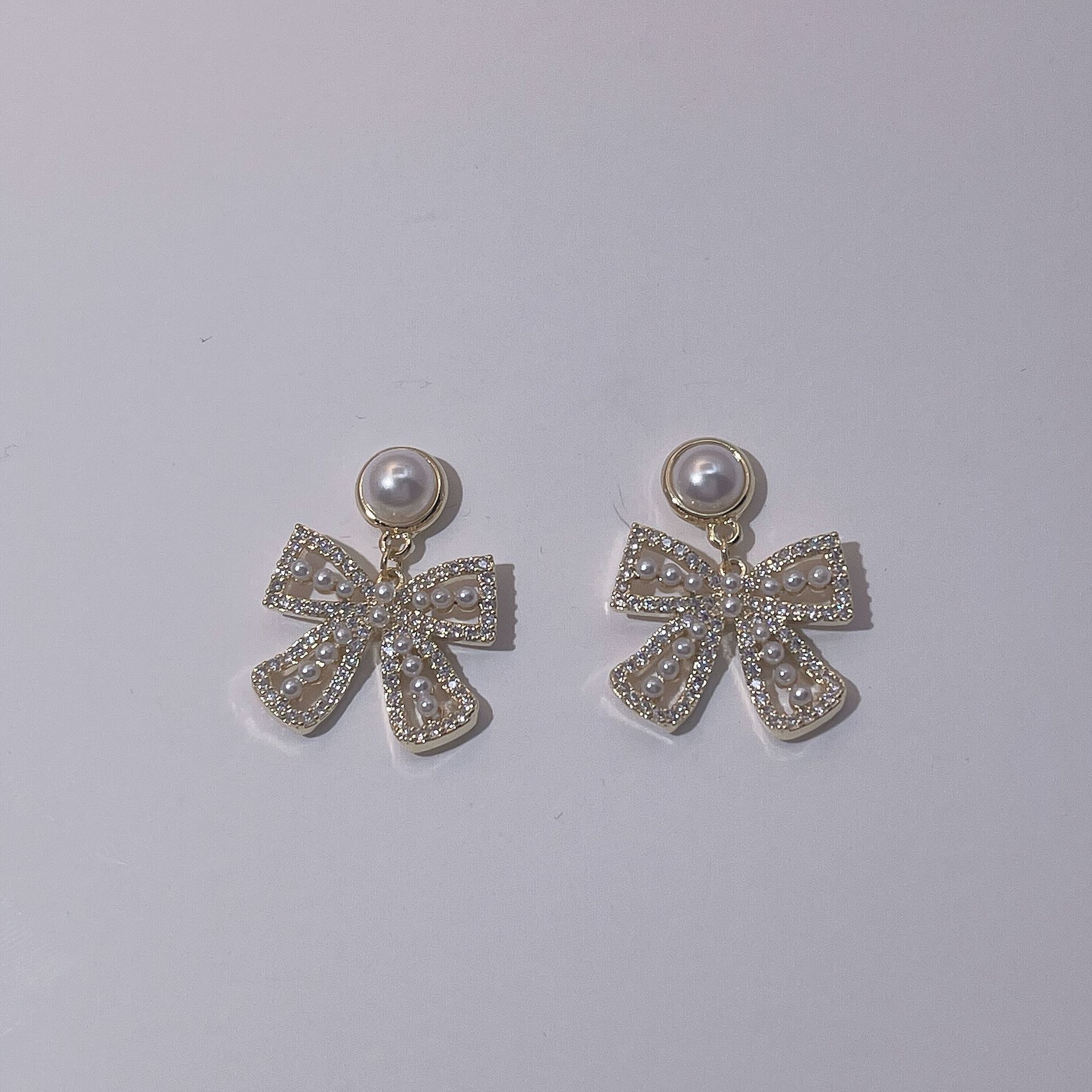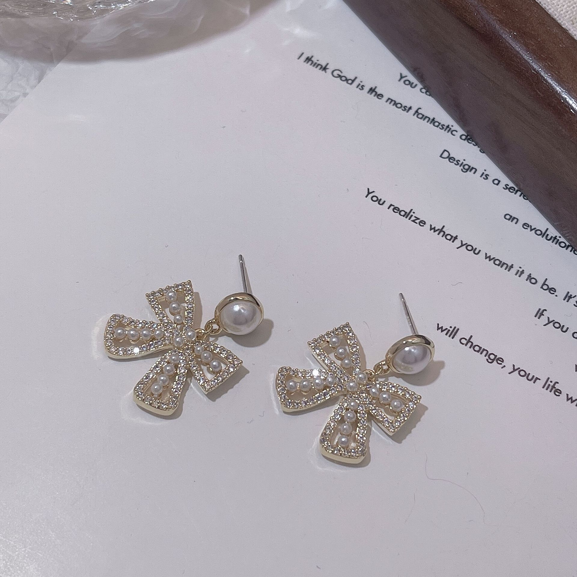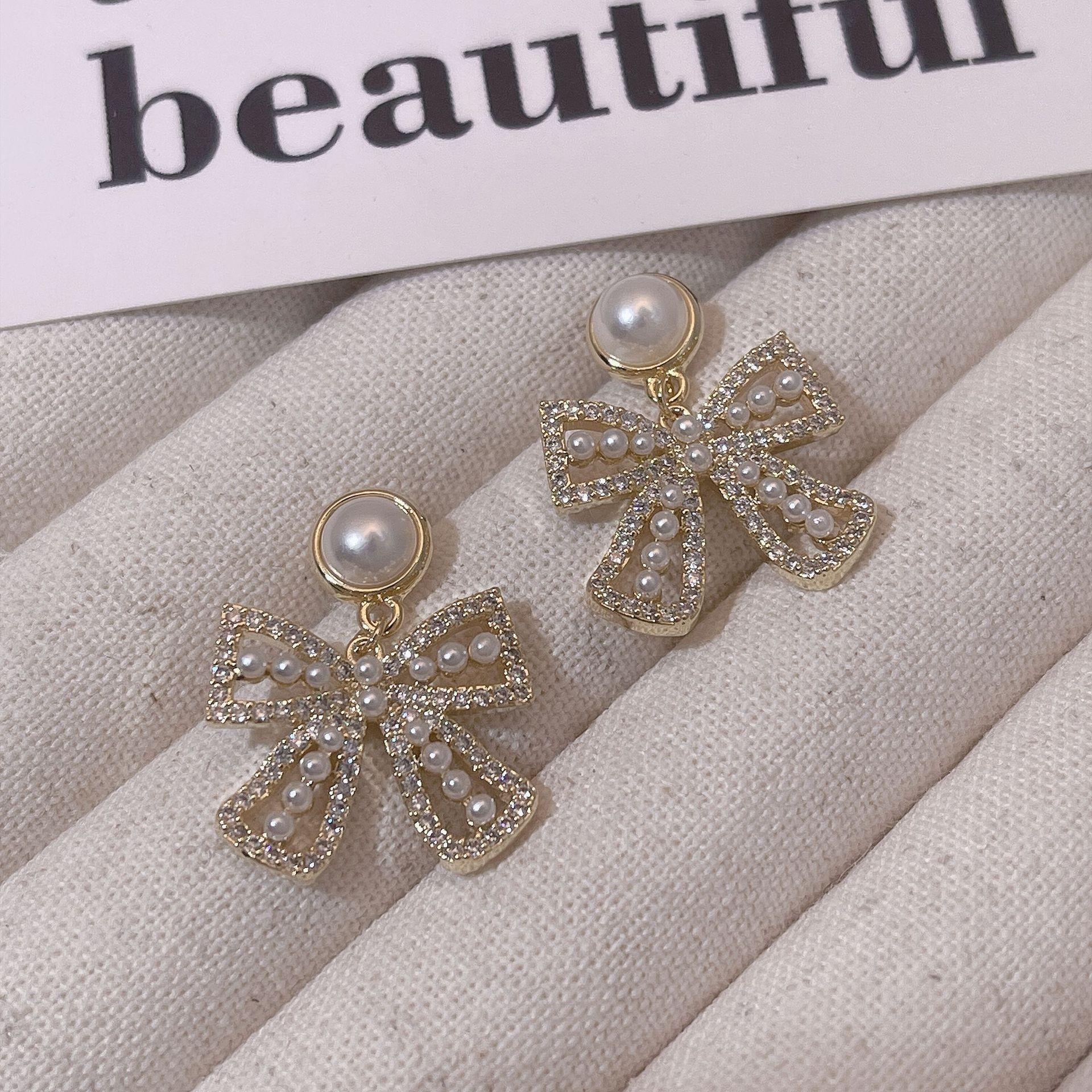 Pendientes de perlas con lazo de circonita con microincrustaciones de temperamento exquisito, diseño de nicho, pendientes de moda dulces que combinan con todo.
