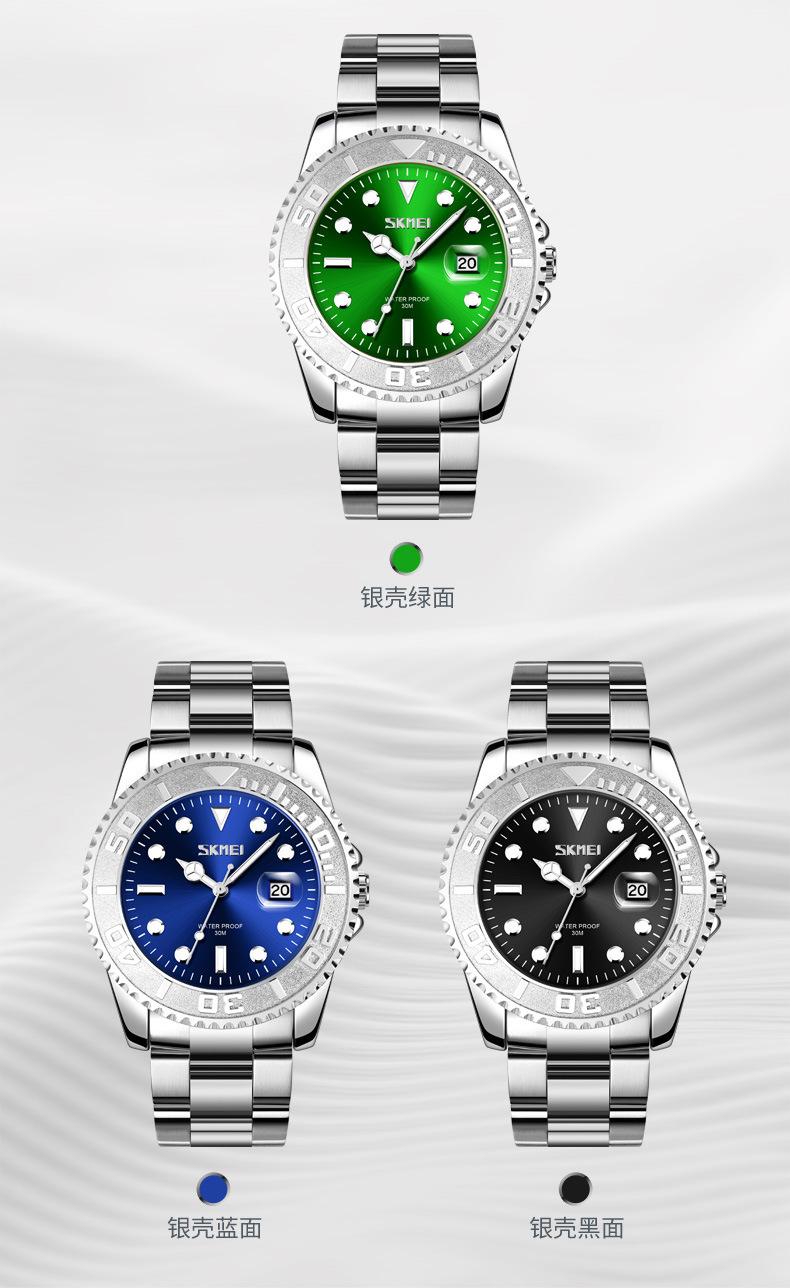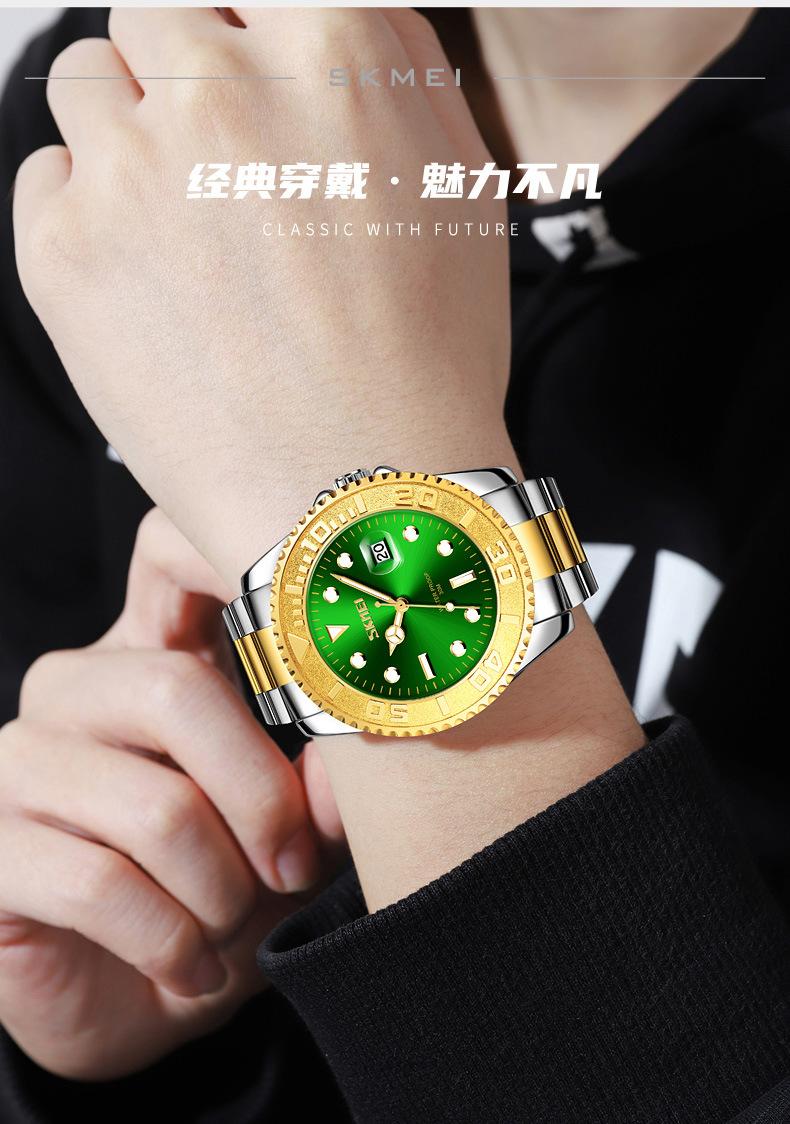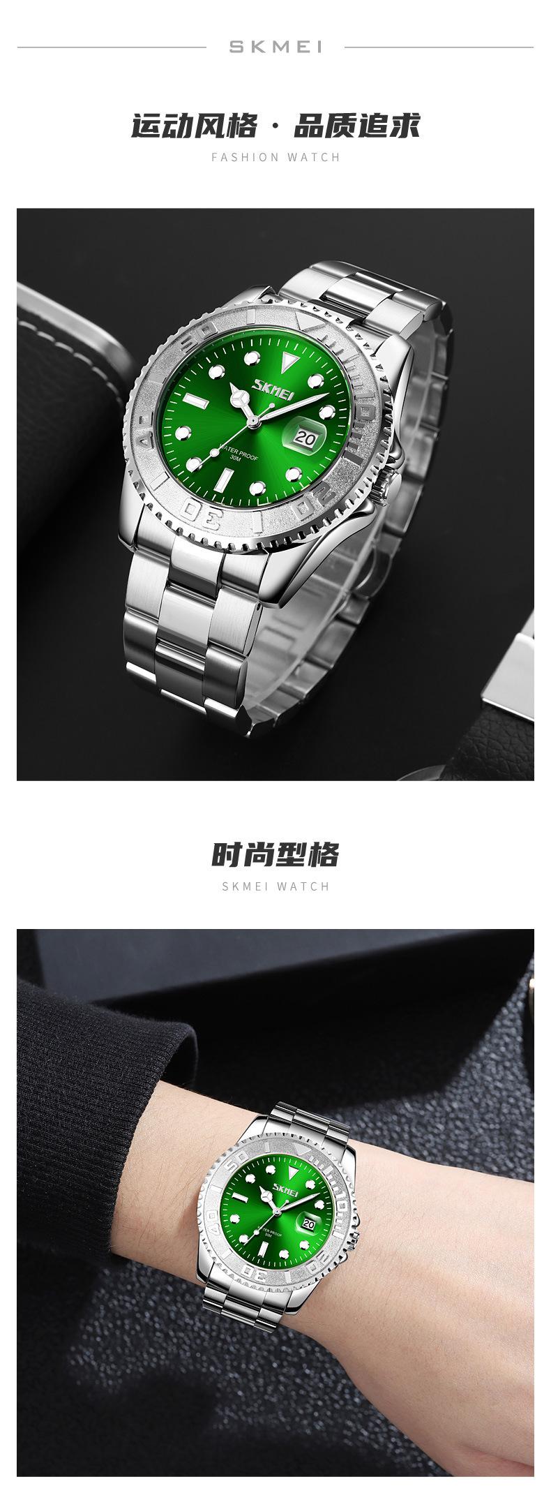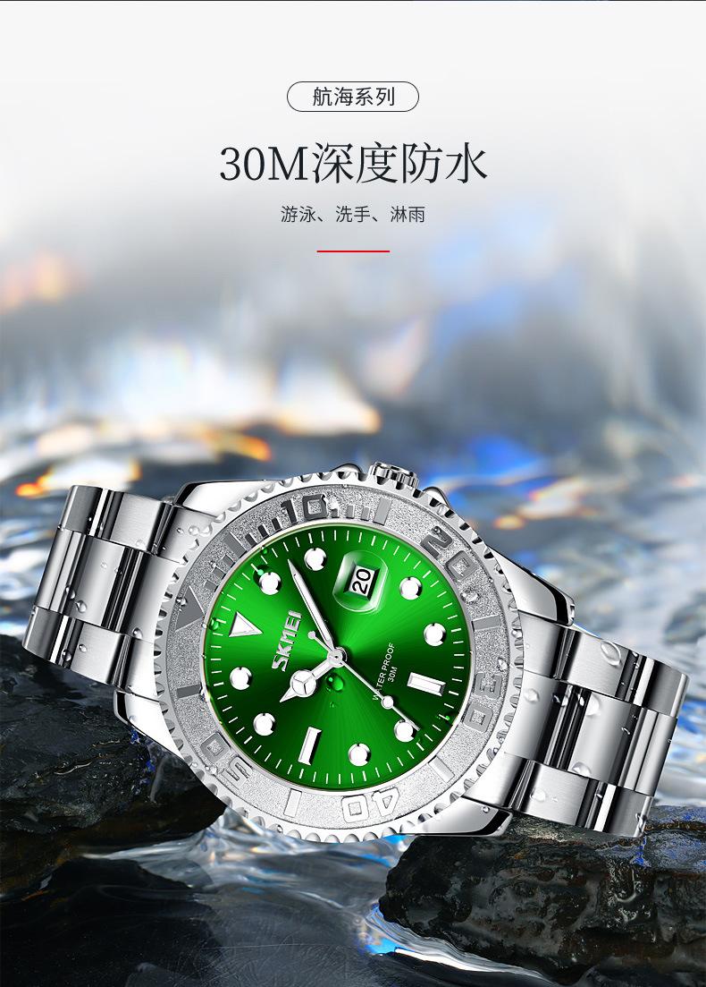 Reloj de cuarzo Skmei con esfera de puntero luminoso verde 'Fantasma de Agua', correa de acero sólido, reloj de hombre con calendario para negocios