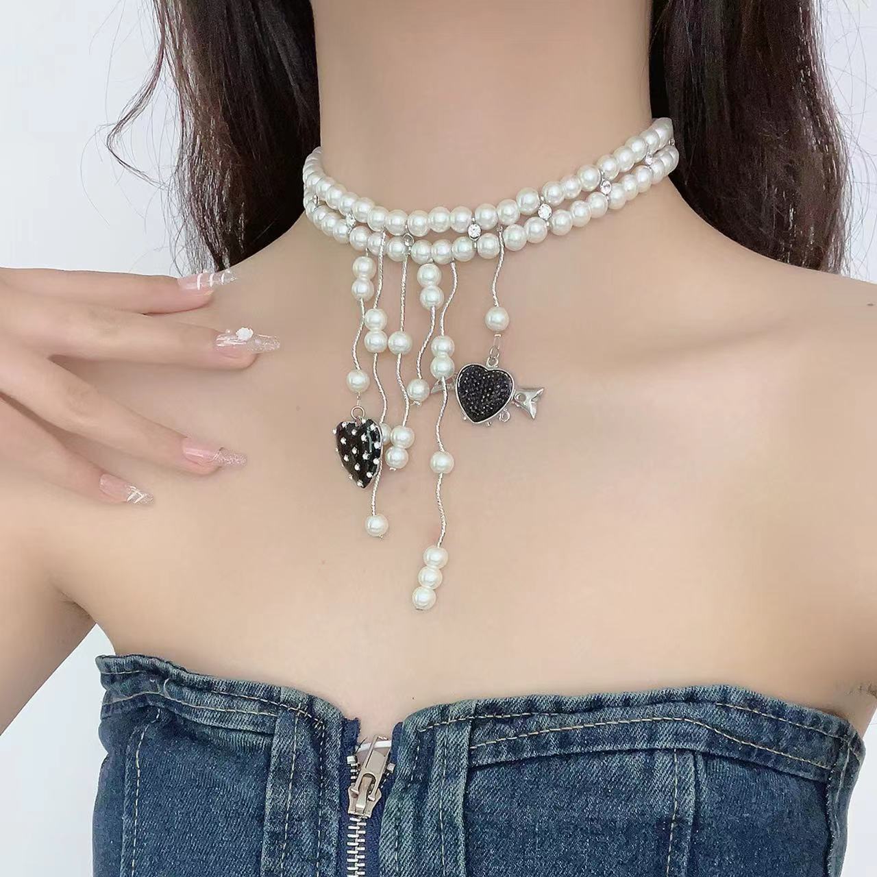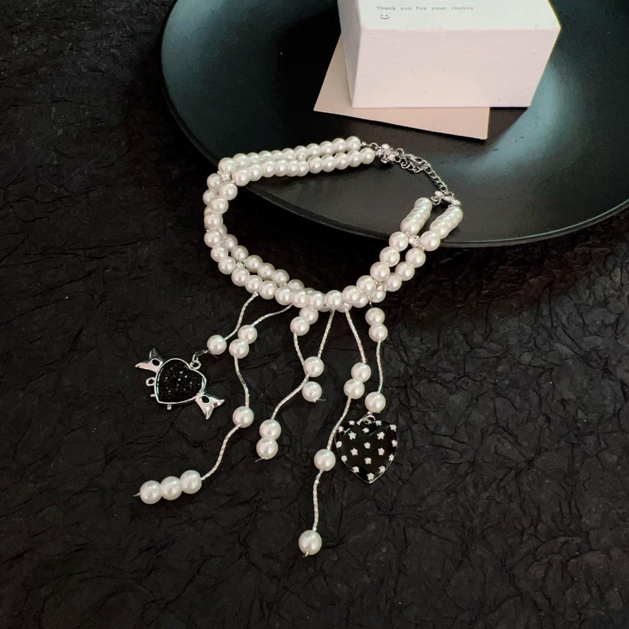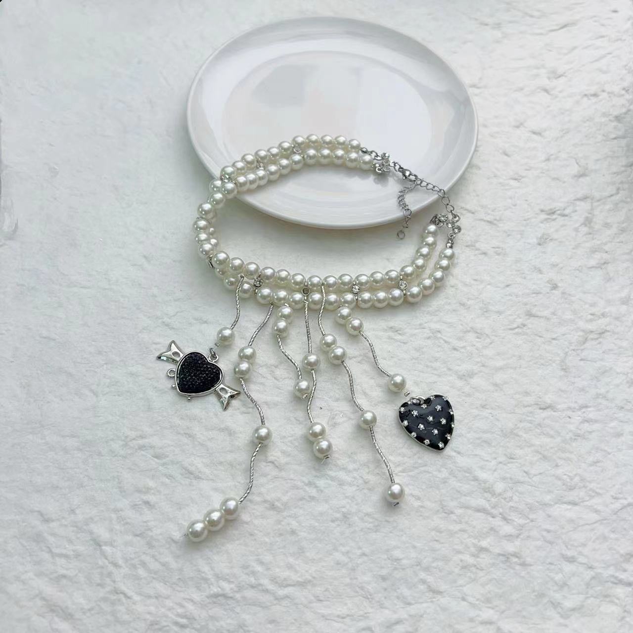 Estilo Dulce y Cool Europeo y Americano Negro Amor Borla Doble Capa Collar de Perlas Cadena Irregular para Clavícula Nuevo Estilo 2024 Elegante Trendy