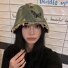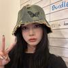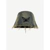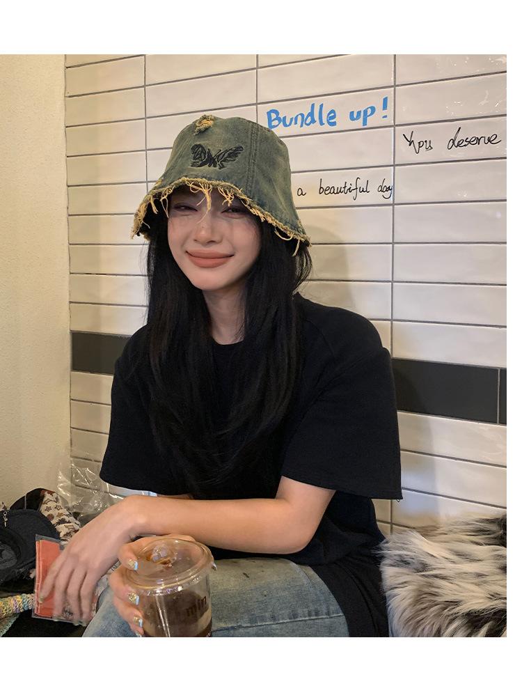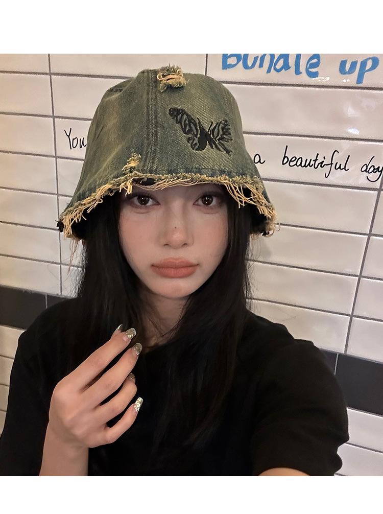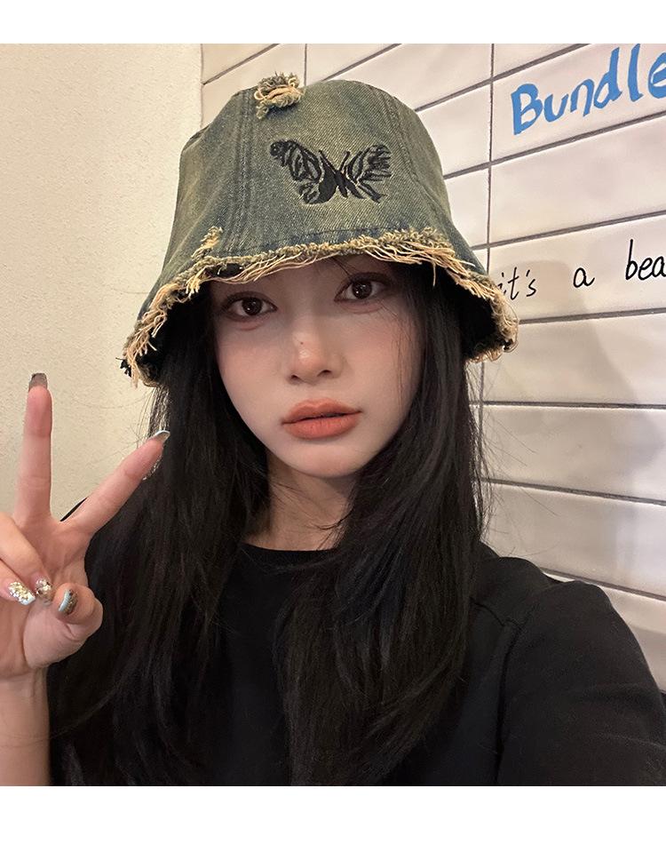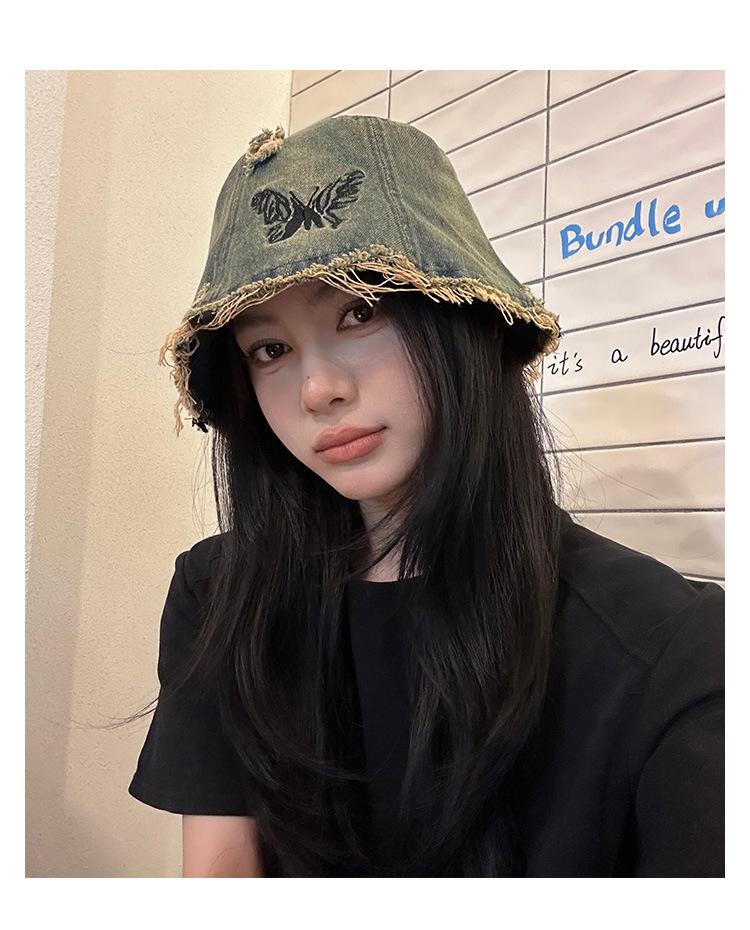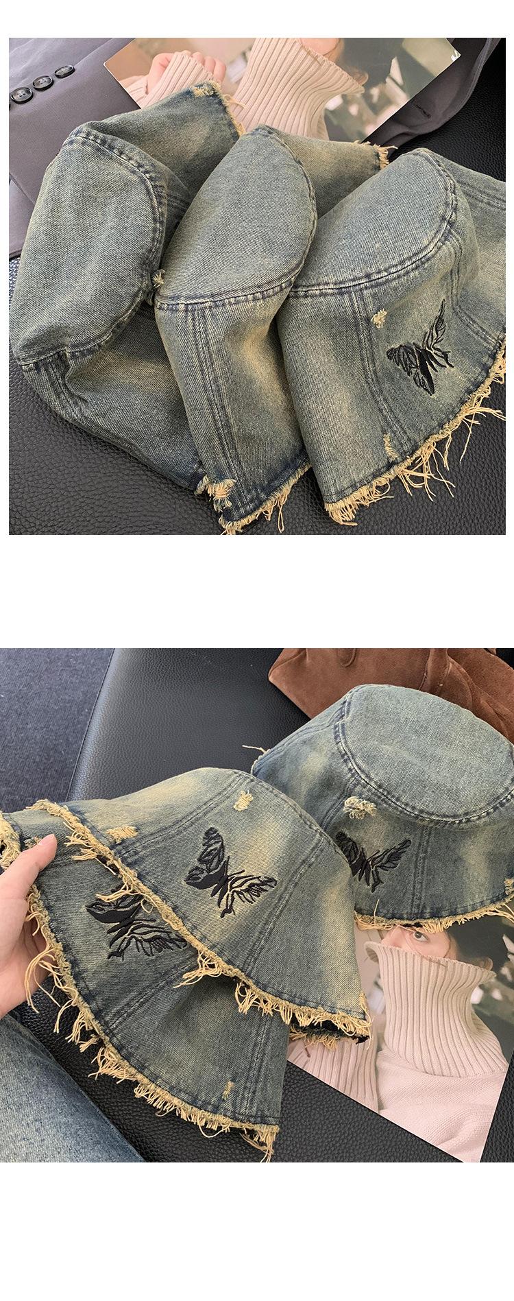 Sombrero de Pescador de Mezclilla con Mariposa Bordada Vintage Estilo Coreano para Mujer Cabeza Grande Cara Pequeña Lavado Viejo Sombrero de Cubo Nuevo Estilo