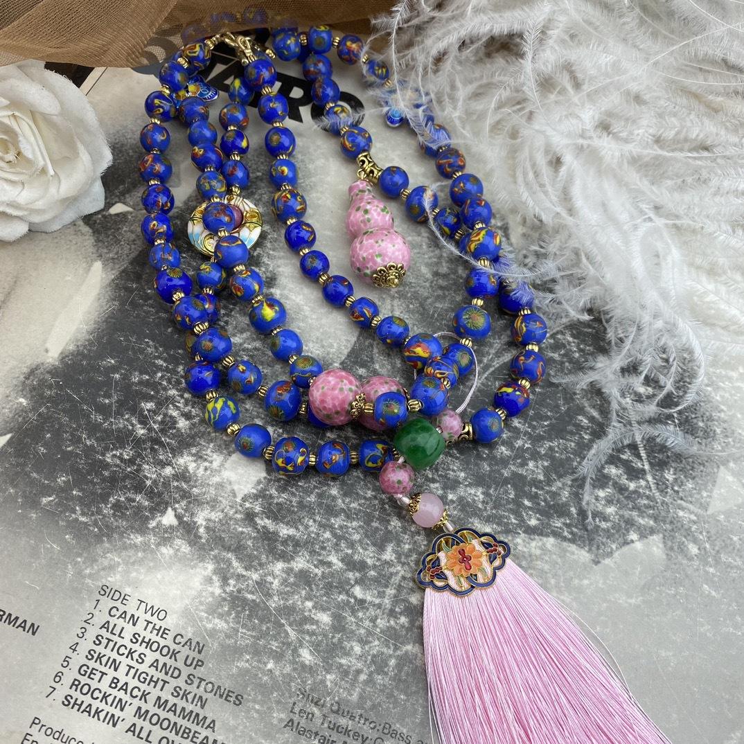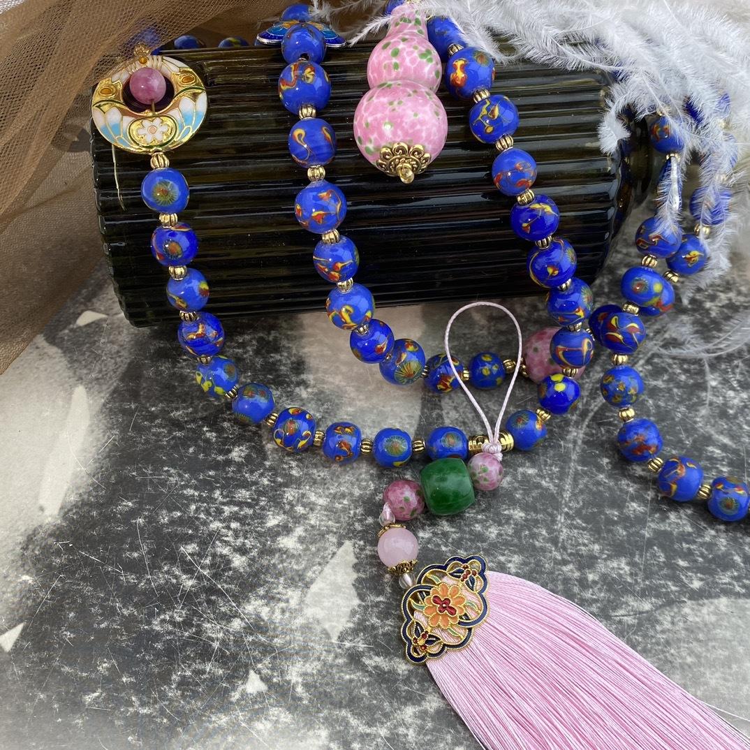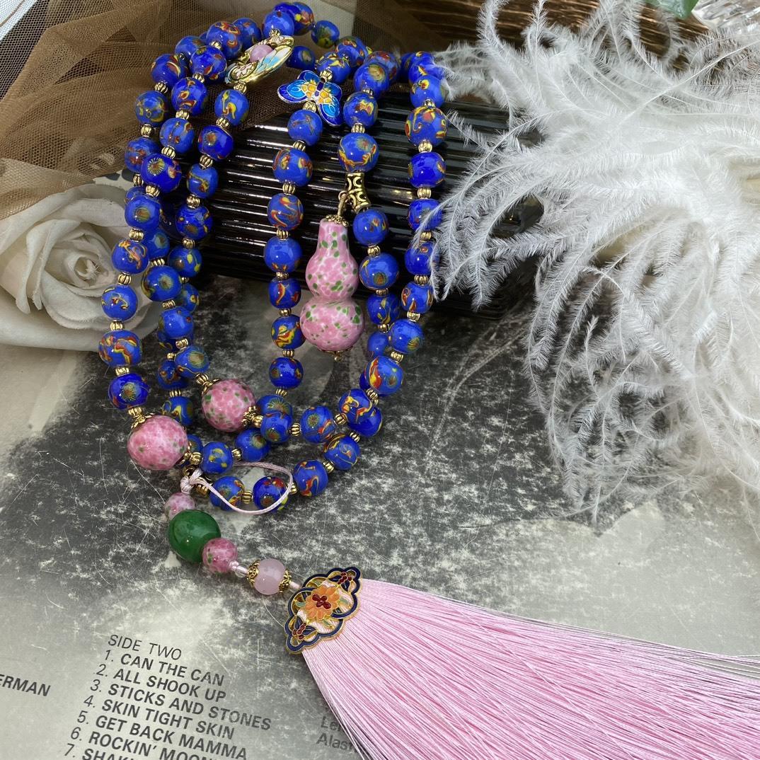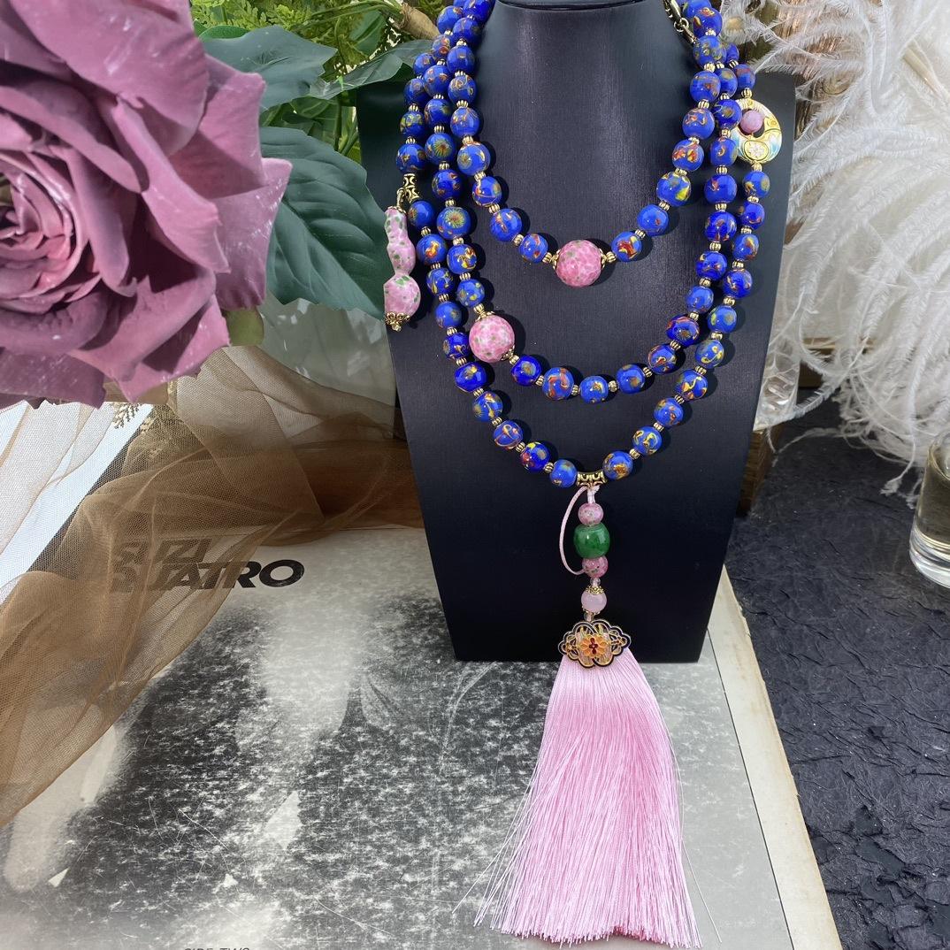 Collar de borla larga con ojo de fénix azul, rana rosa y esmeralda de estilo palaciego de mediados de la antigüedad de Mi Nan