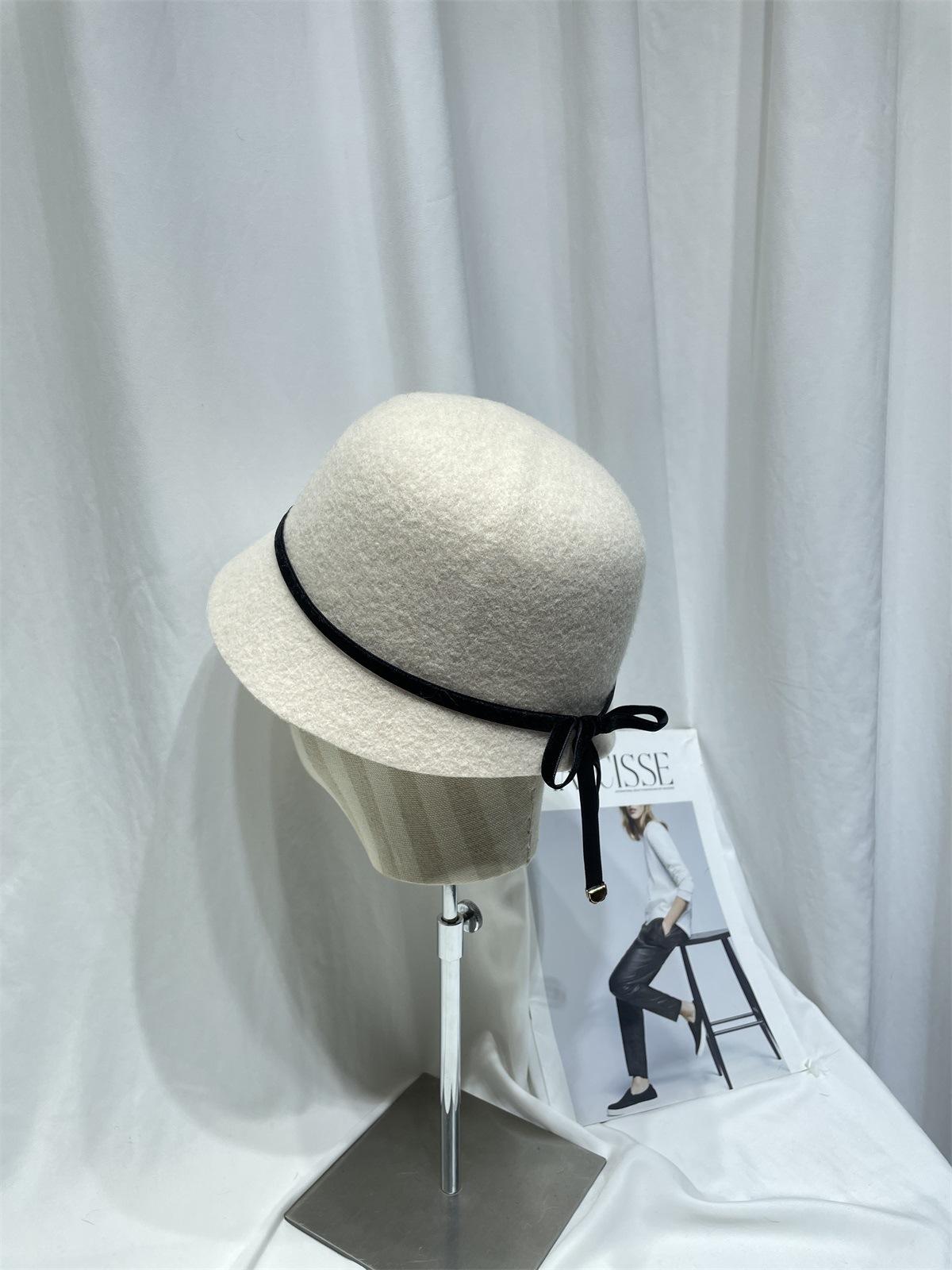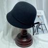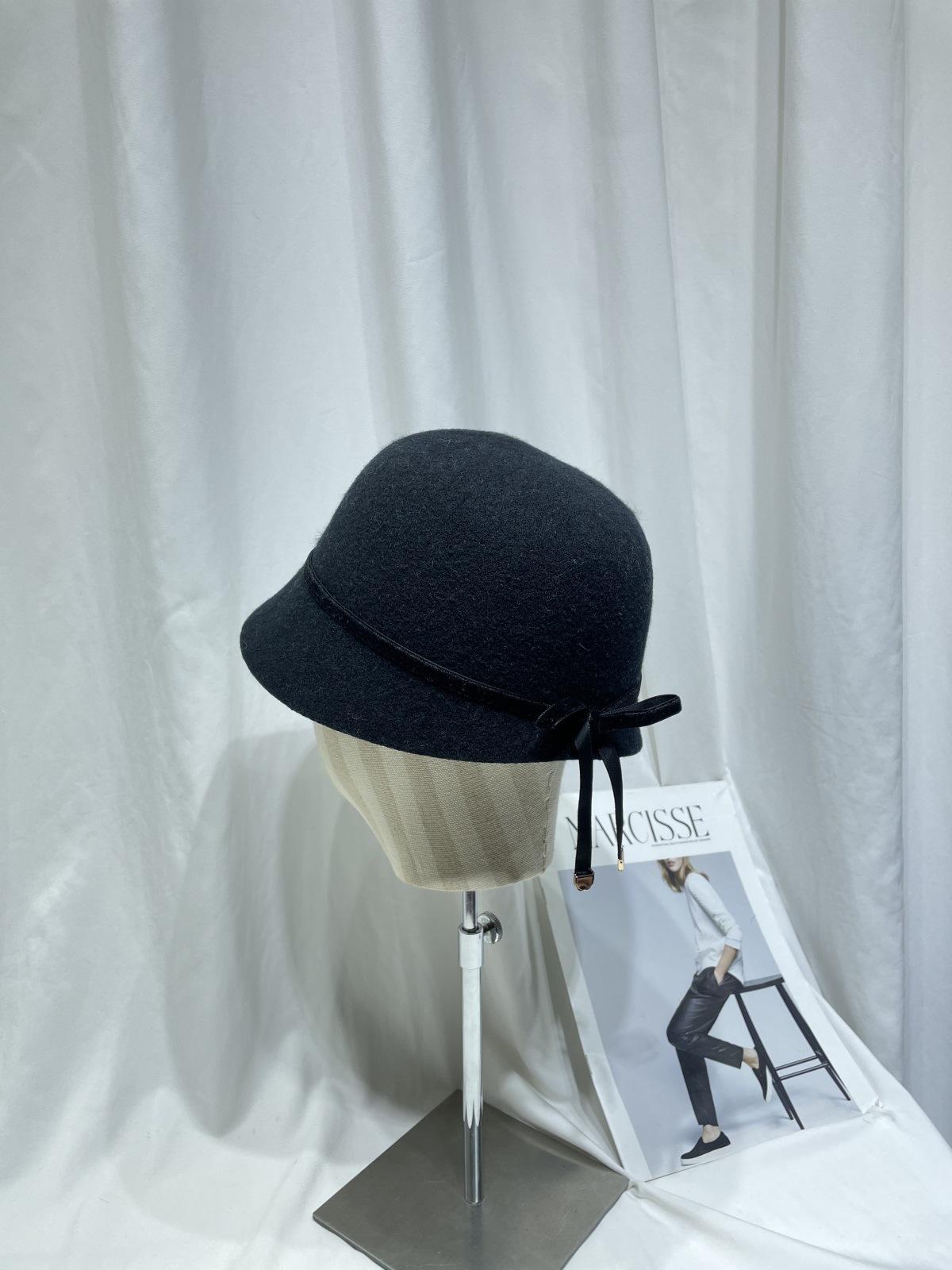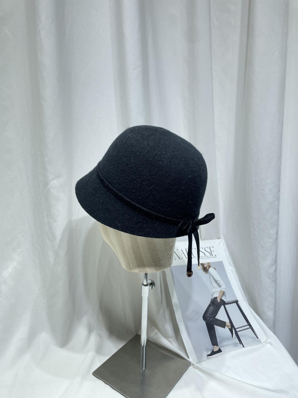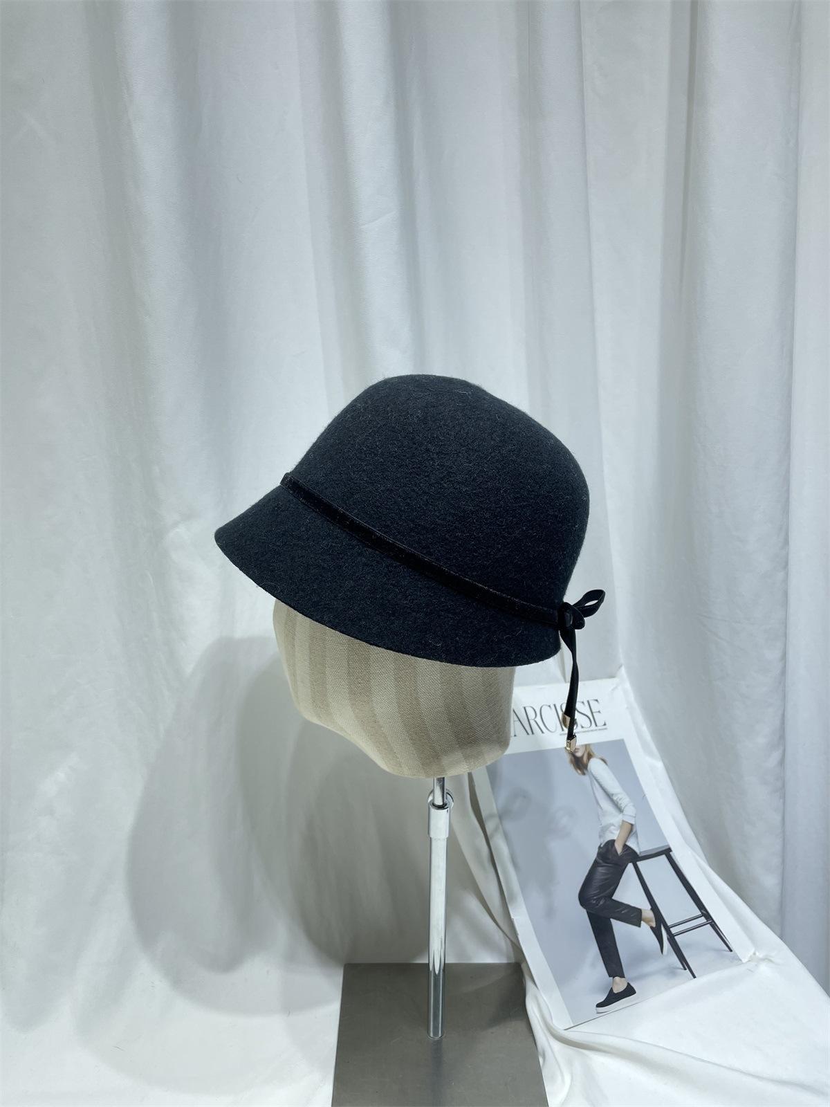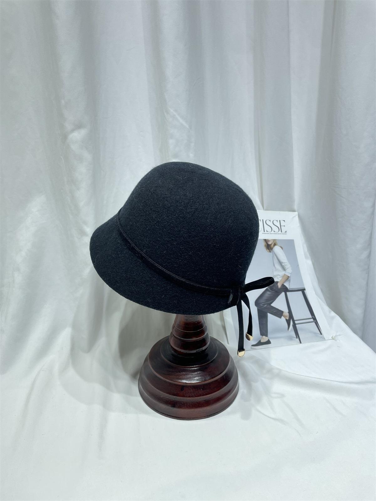 Sombrero femenino de otoño e invierno estilo Hepburn, elegante sombrero de pescador de lana con lazo, sombrero de lavabo con cúpula retro japonés, sombrero de copa con marea.