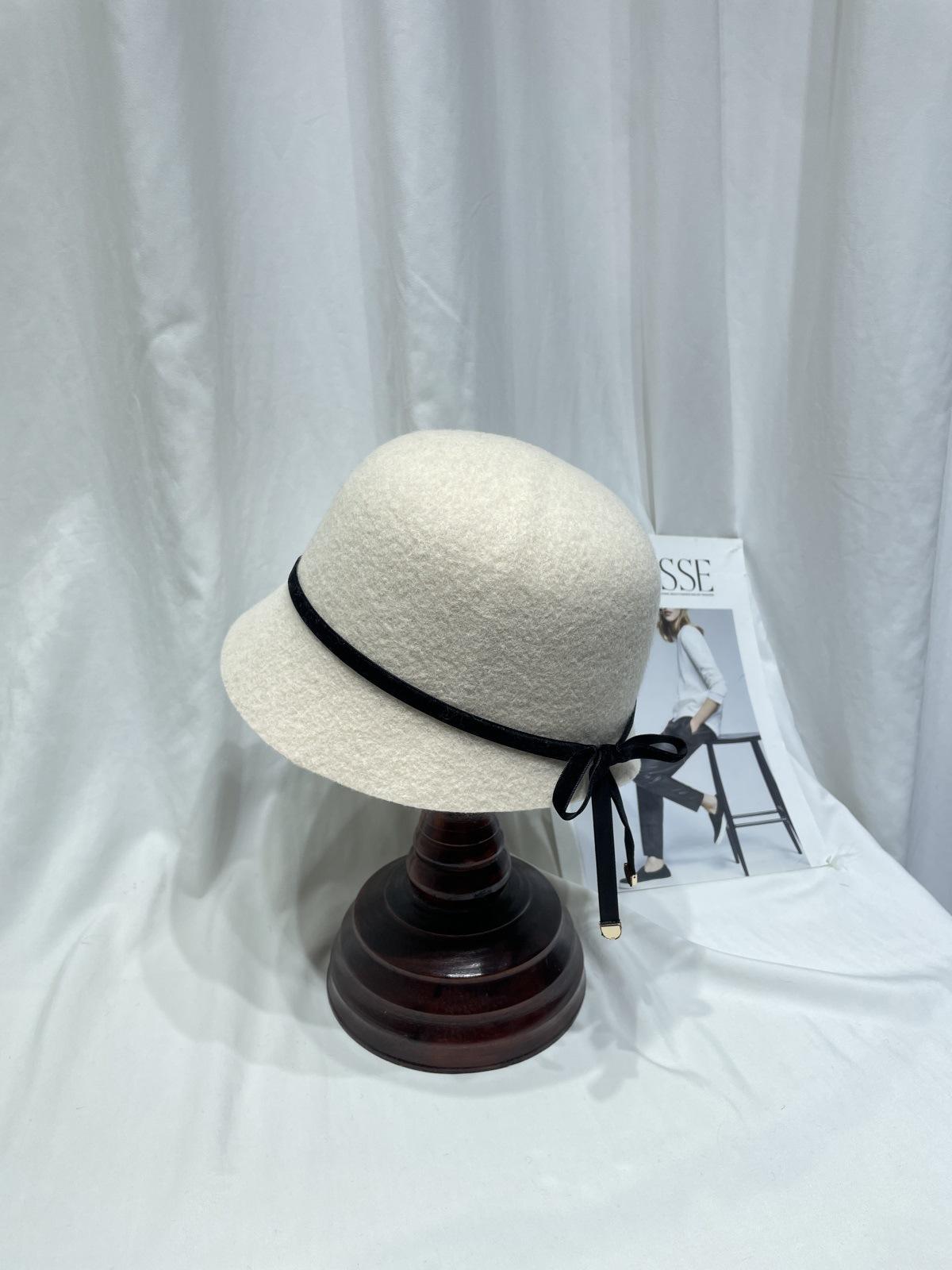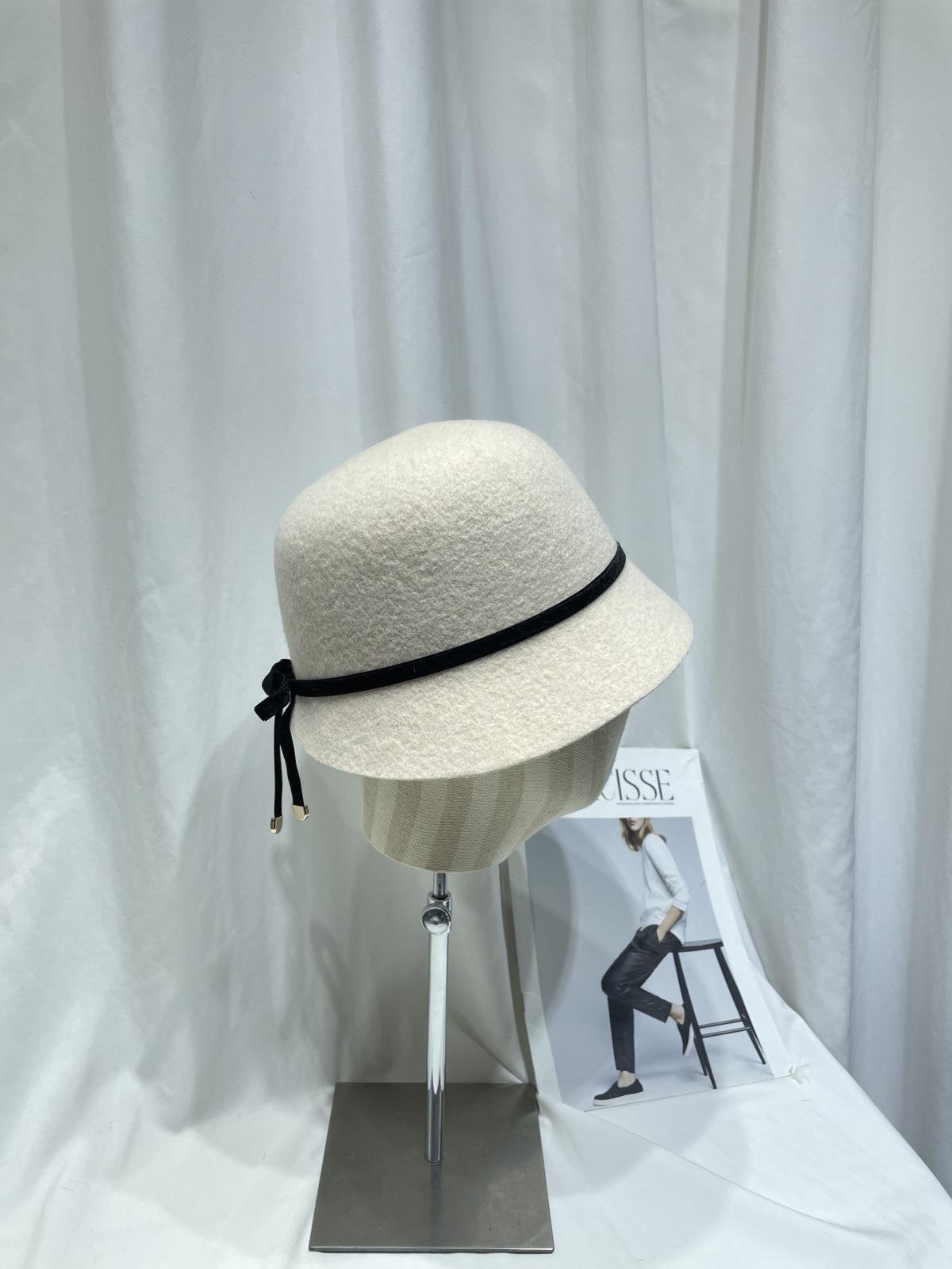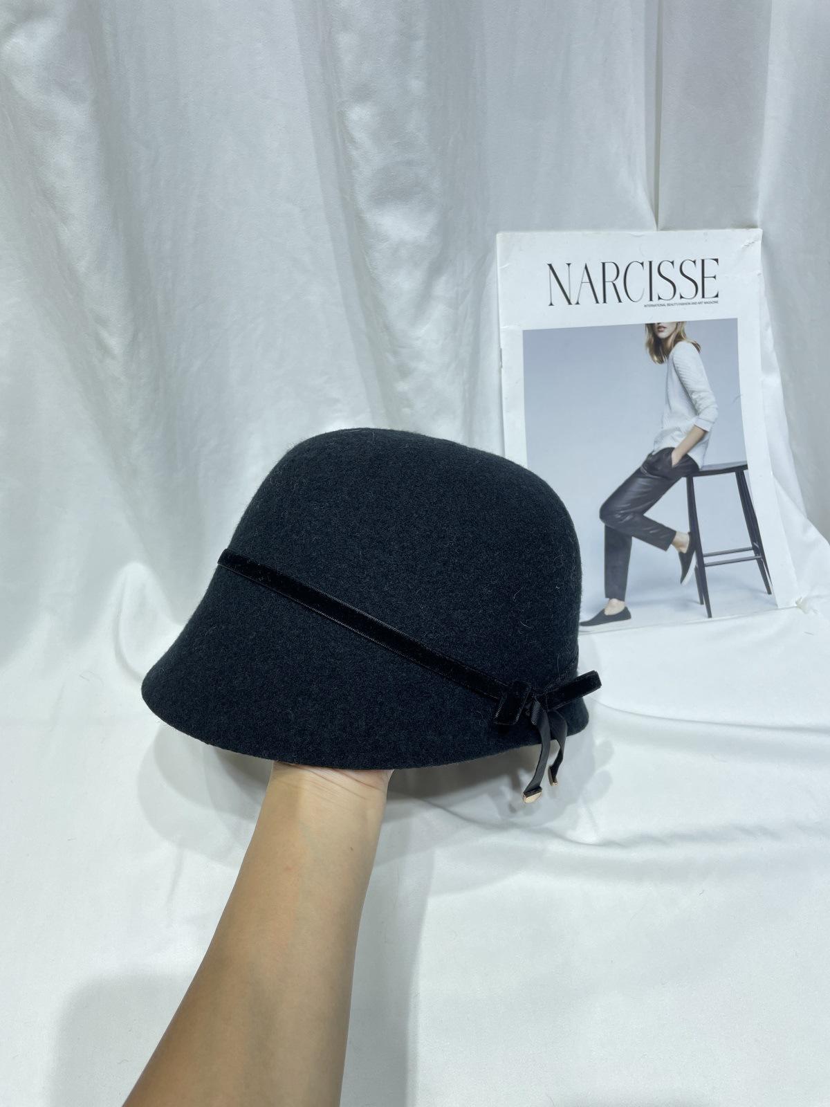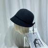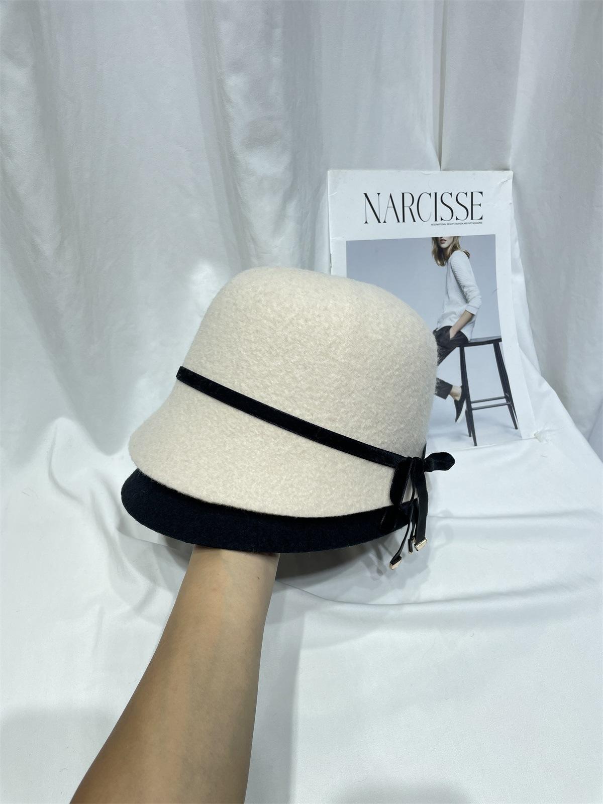 Sombrero femenino de otoño e invierno estilo Hepburn, elegante sombrero de pescador de lana con lazo, sombrero de lavabo con cúpula retro japonés, sombrero de copa con marea.