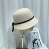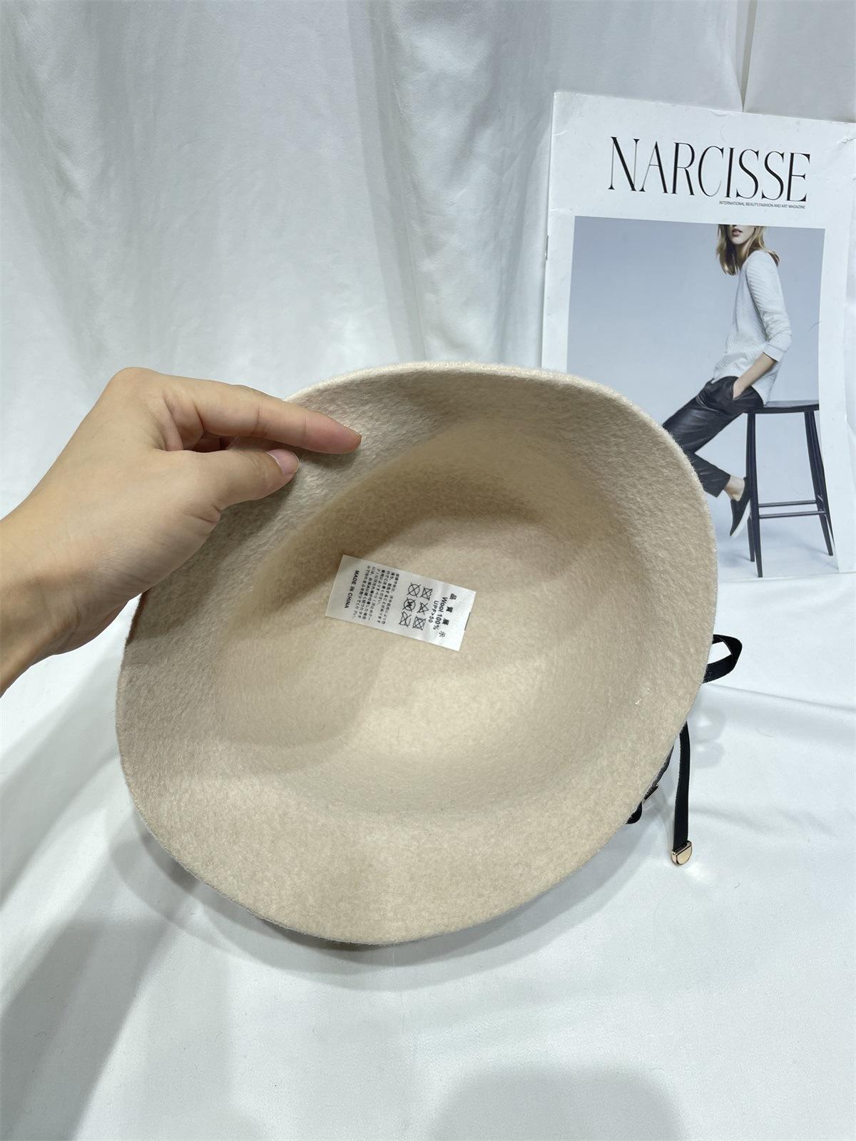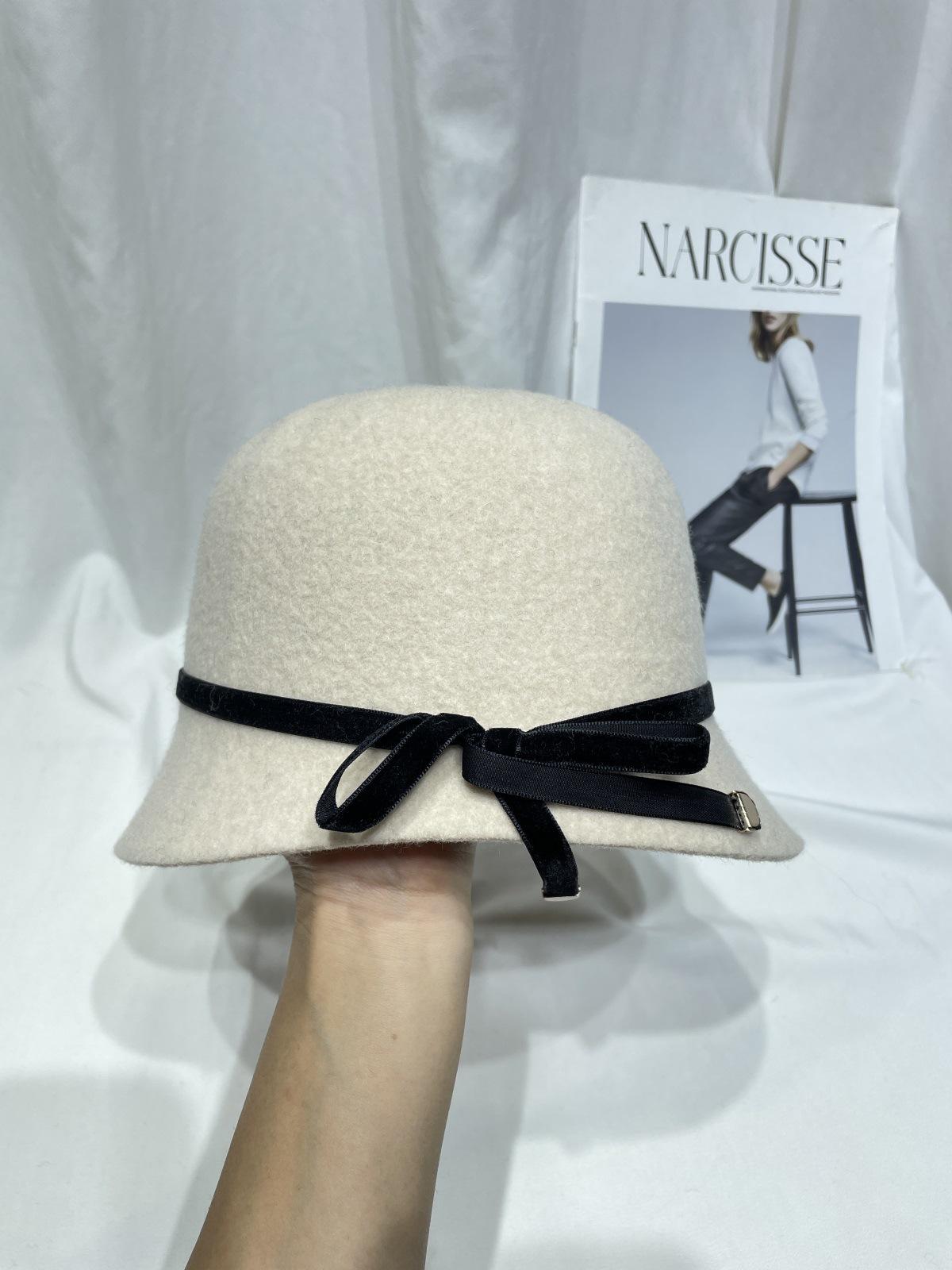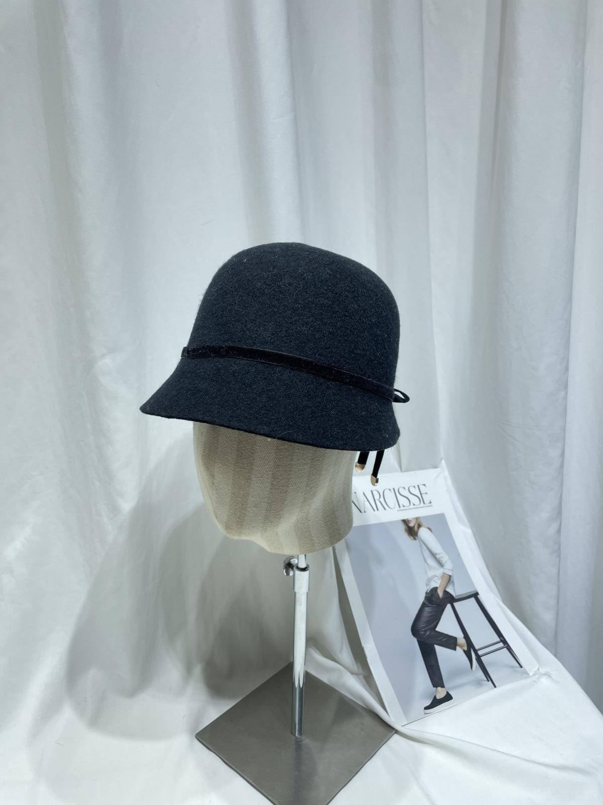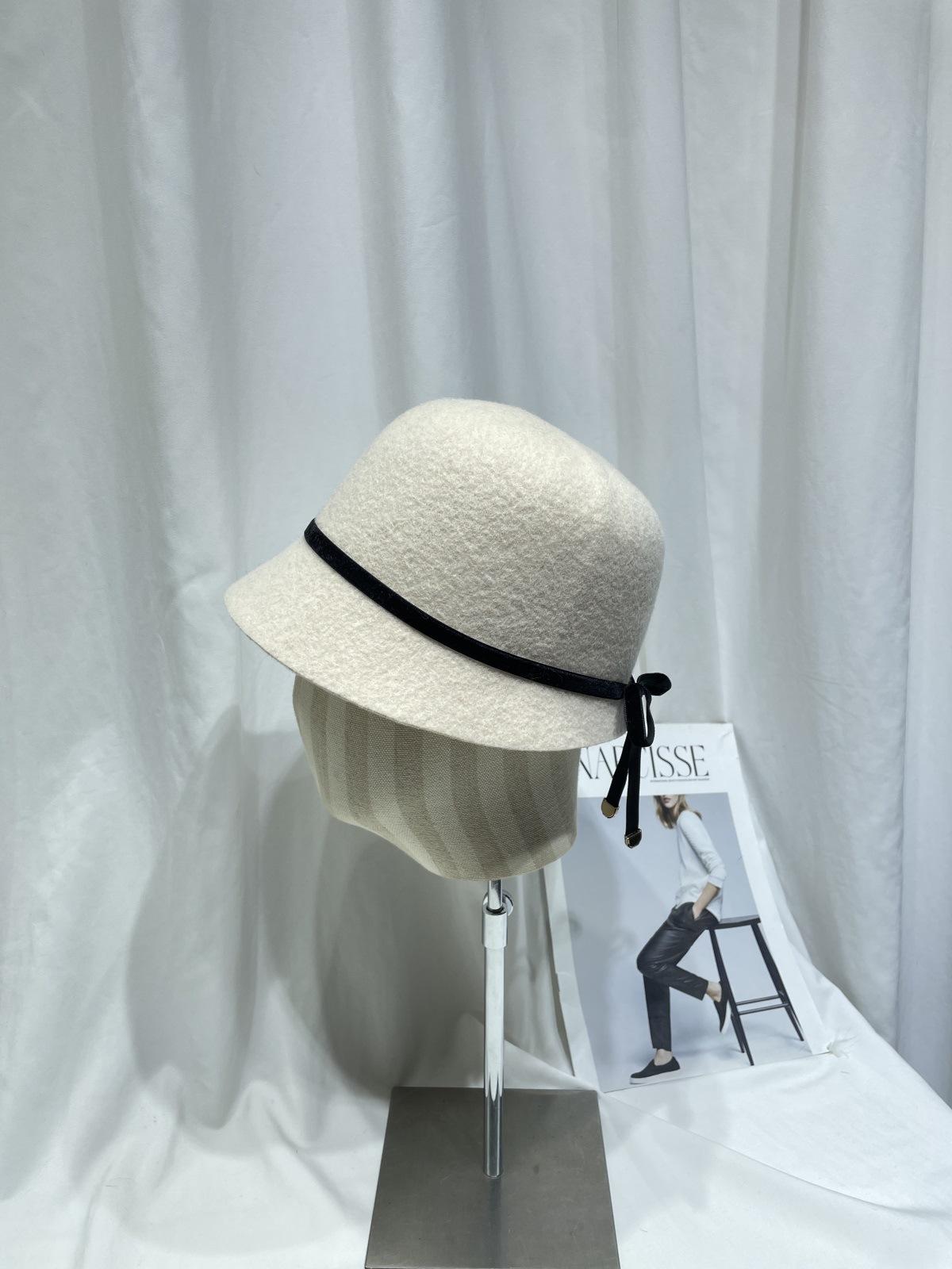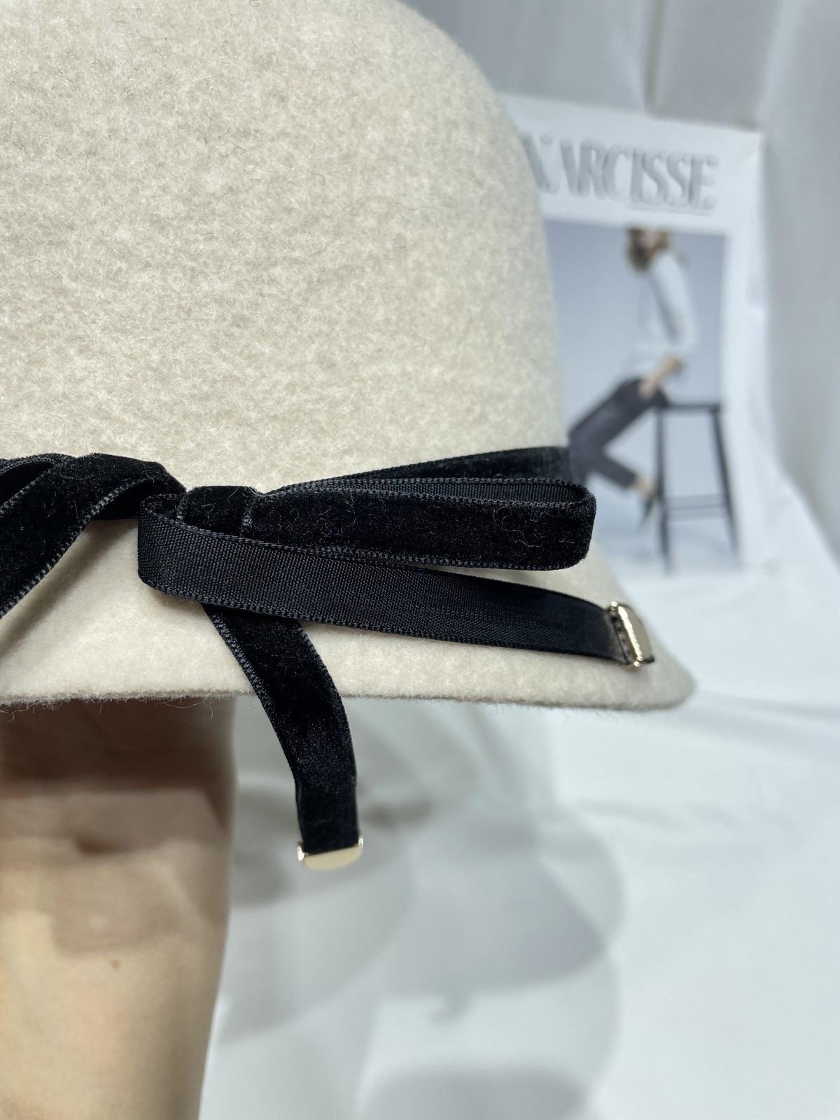 Sombrero femenino de otoño e invierno estilo Hepburn, elegante sombrero de pescador de lana con lazo, sombrero de lavabo con cúpula retro japonés, sombrero de copa con marea.