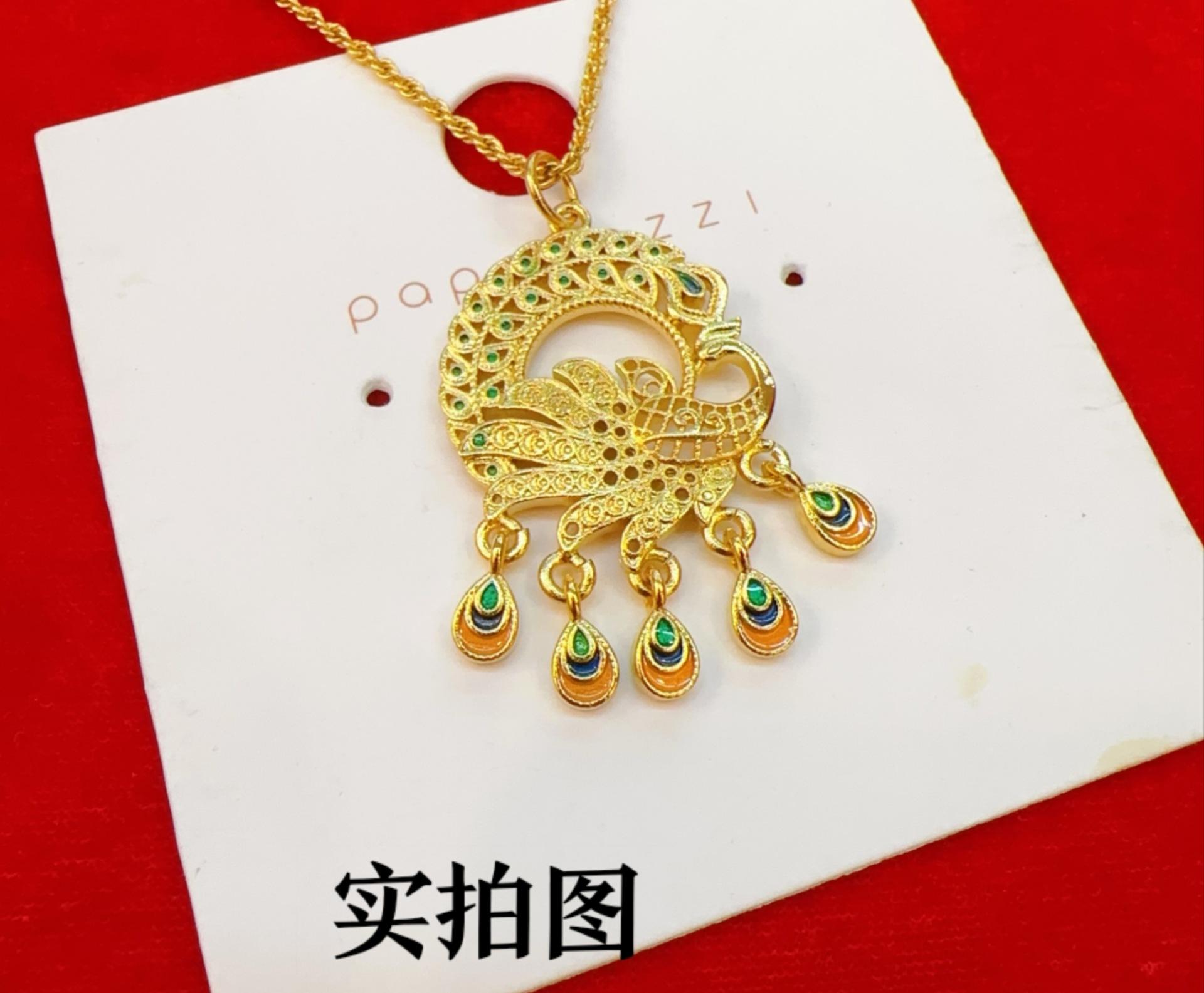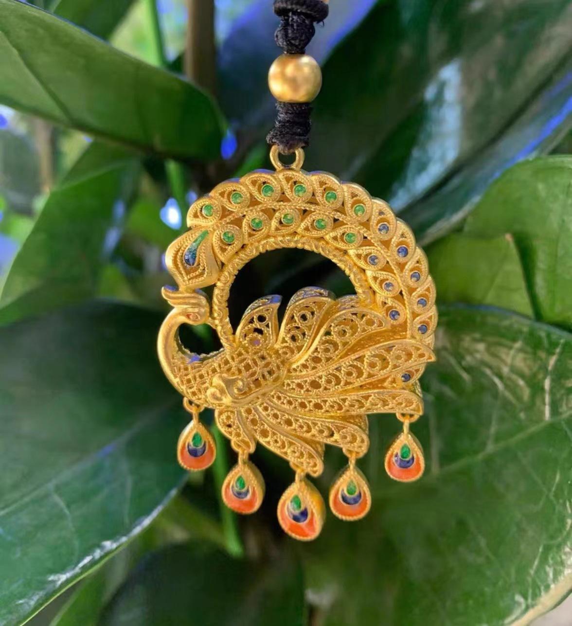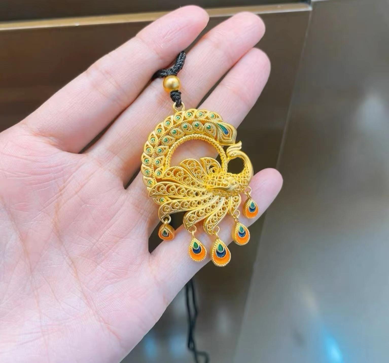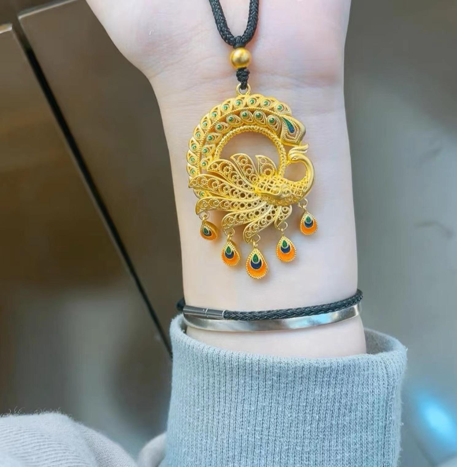 Colgante de pavo real con pantalla abierta de esmalte, colgante de pavo real dorado amarillo antiguo chino, estilo nacional, collar de boda de oro de simulación