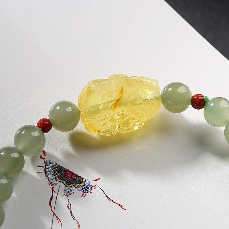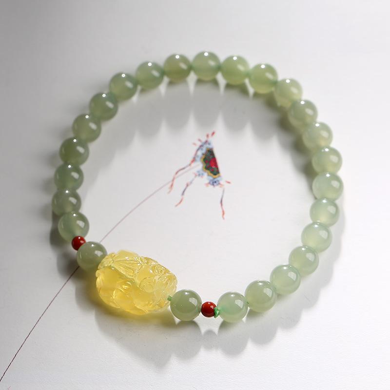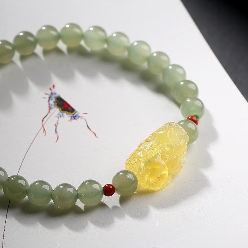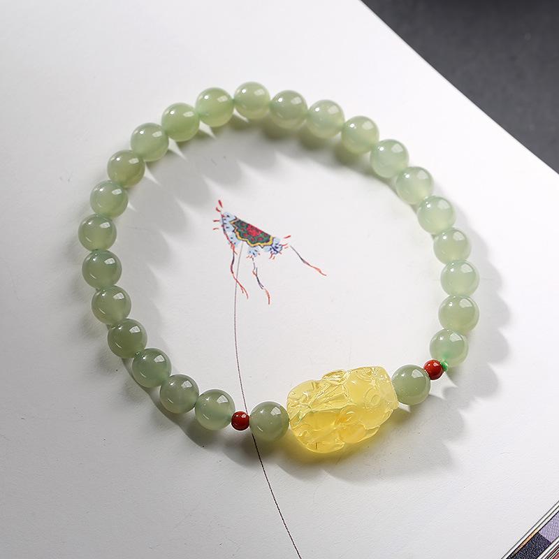 Pulsera de Círculo Sencillo de Jade Hetian Natural con Cuentas Redondas de 6 mm Pulsera de Jade Hetian Cera de Abeja Pixiu Estilo Chino Retro Pulsera para Mujer