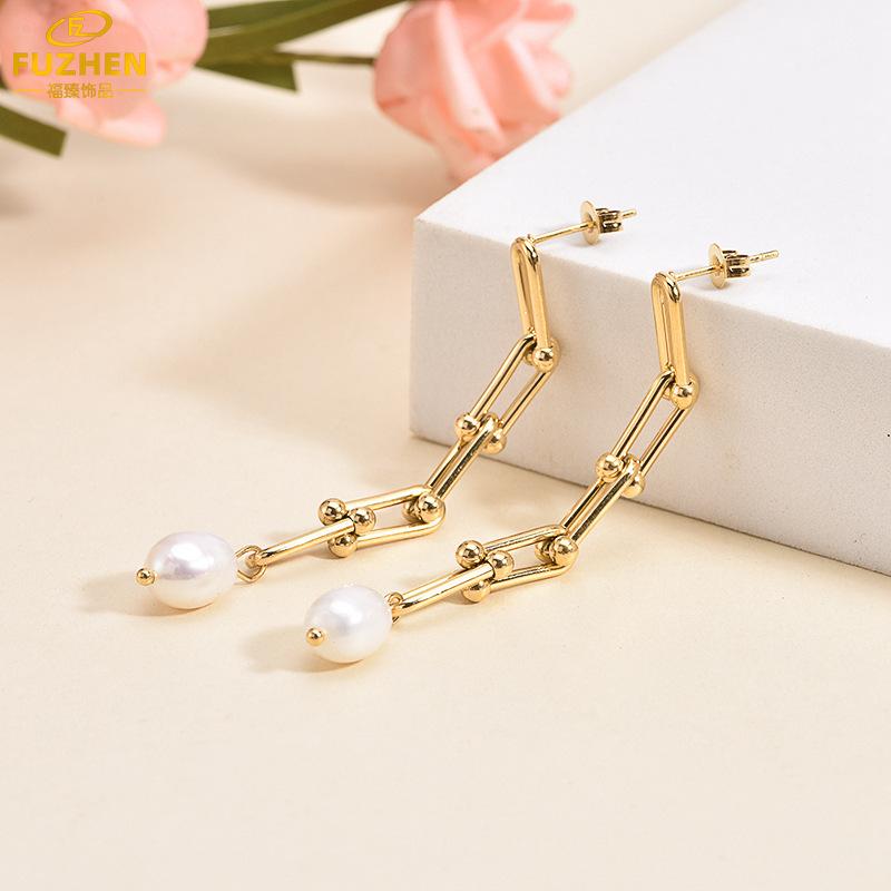 Pendientes de cadena larga en forma de U de acero inoxidable estilo retro europeo y americano, pendientes de perlas de lujo ligeros y de temperamento moderno para hombres y mujeres.