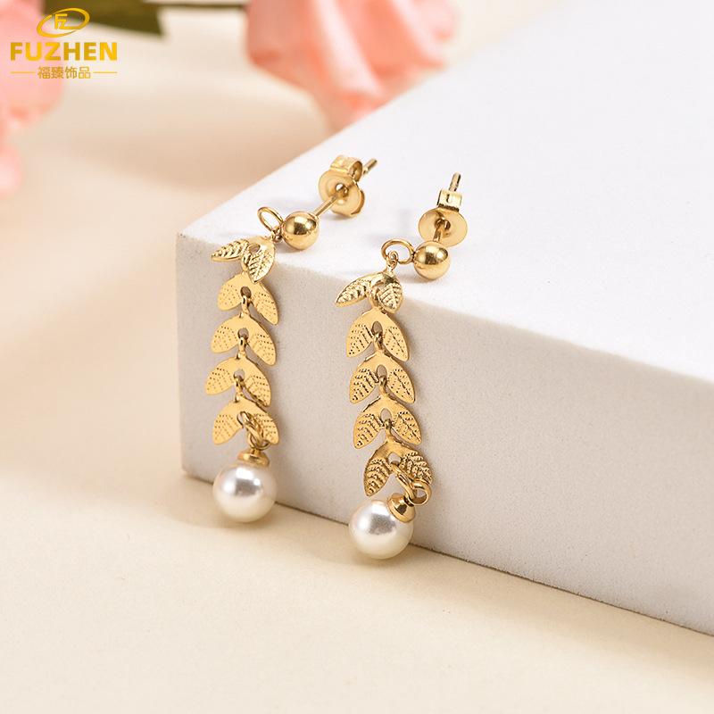 Pendientes largos de estilo retro con diseño de bosque, de nuevo estilo, de alta calidad, con borlas de orejas de trigo y perlas, joyería de acero de titanio.
