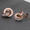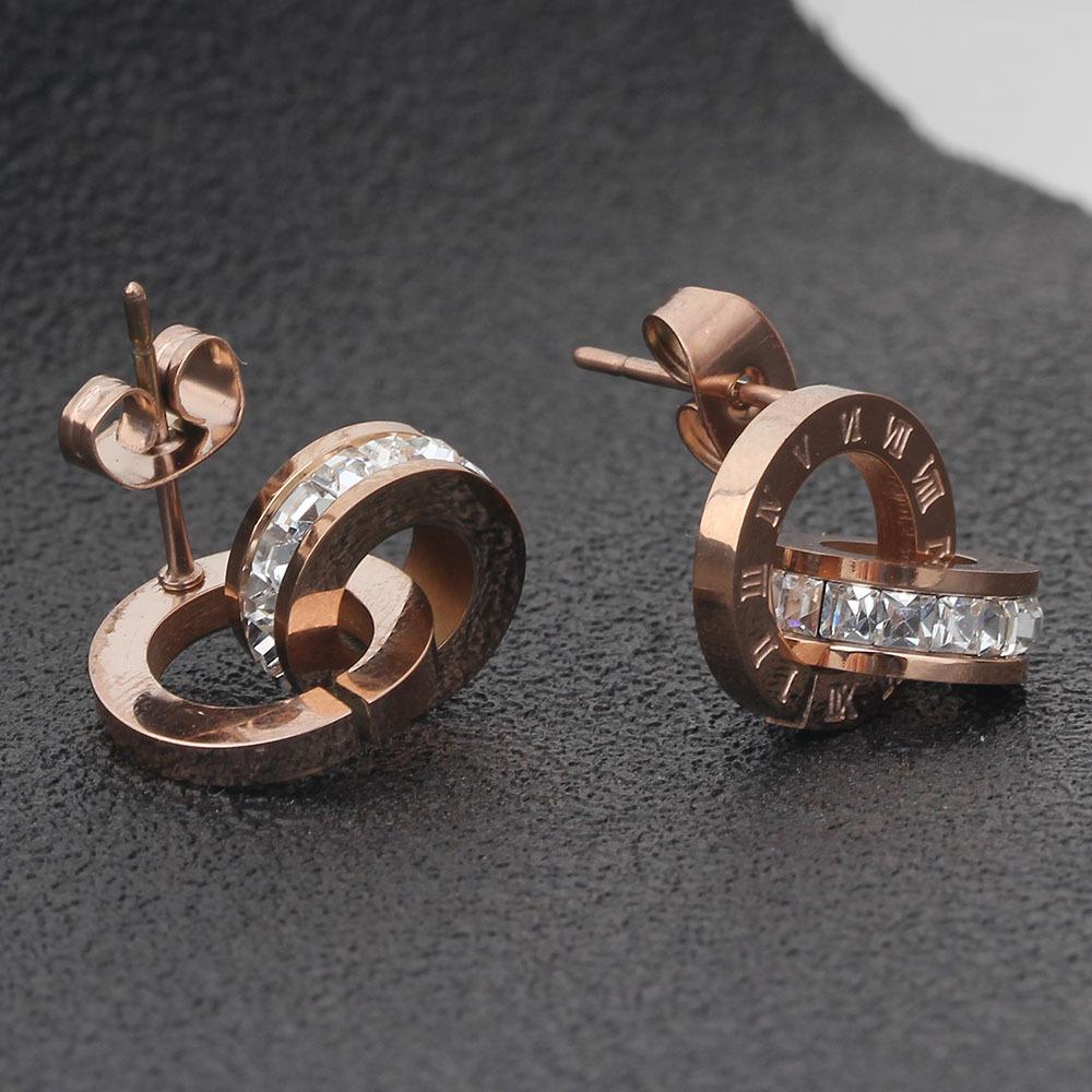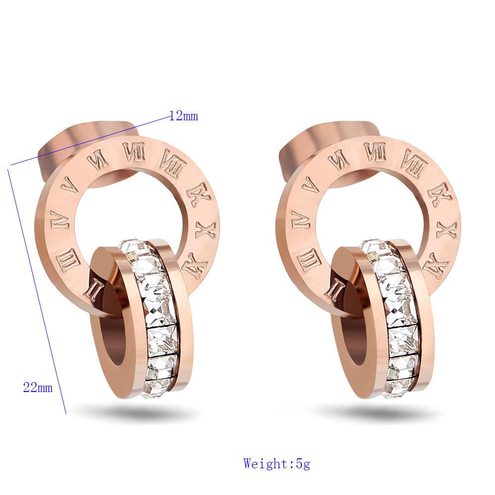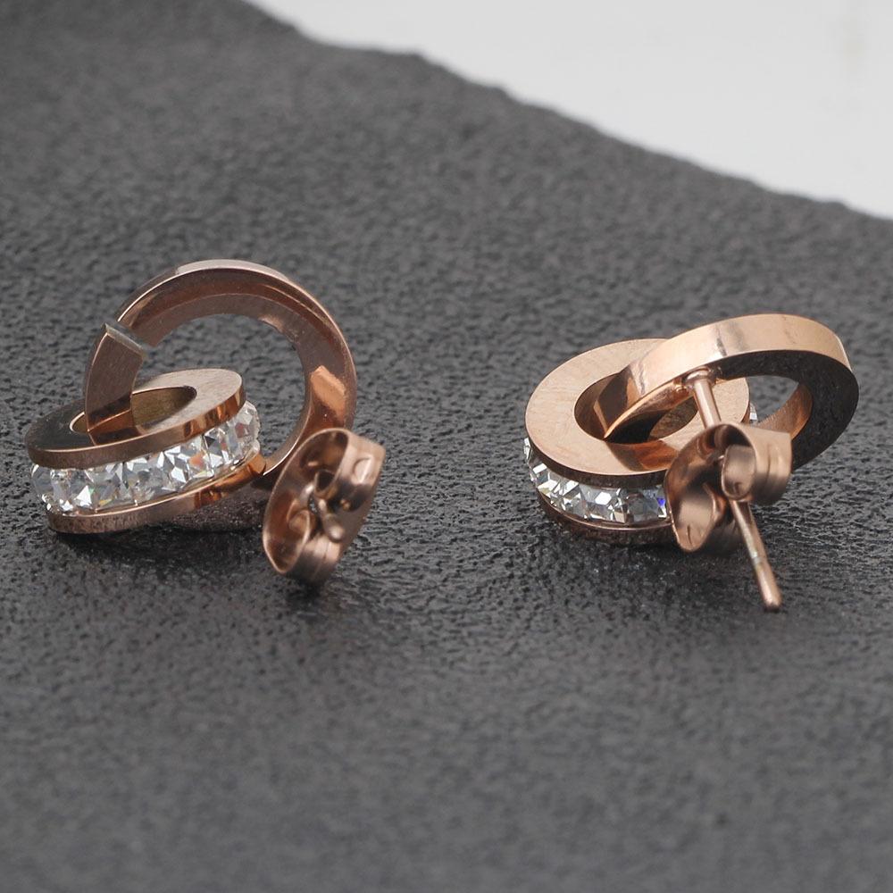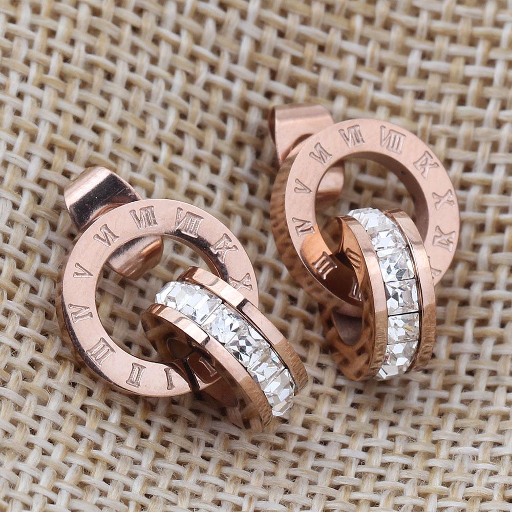 Aretes Europeos y Americanos Ins Simples y Versátiles de Número Romano de Doble Capa de 12 mm Redondos de Diamante Oro Rosa Acero Titanio para Mujer