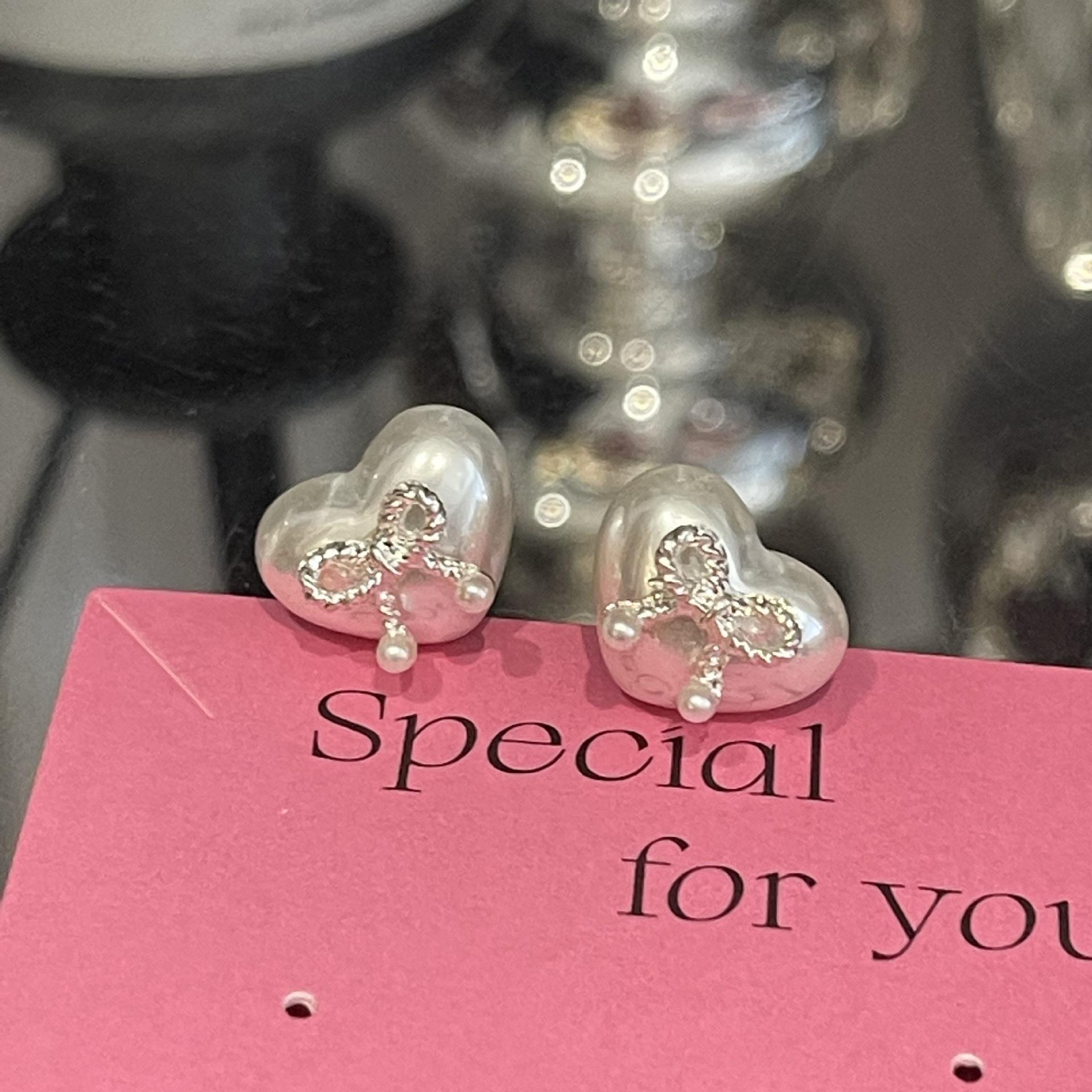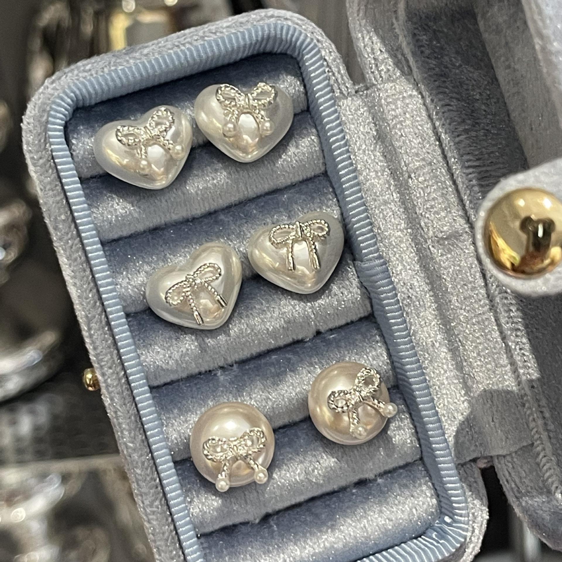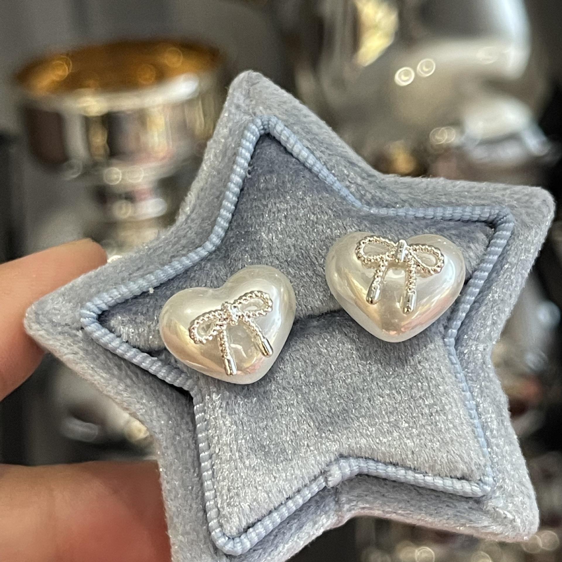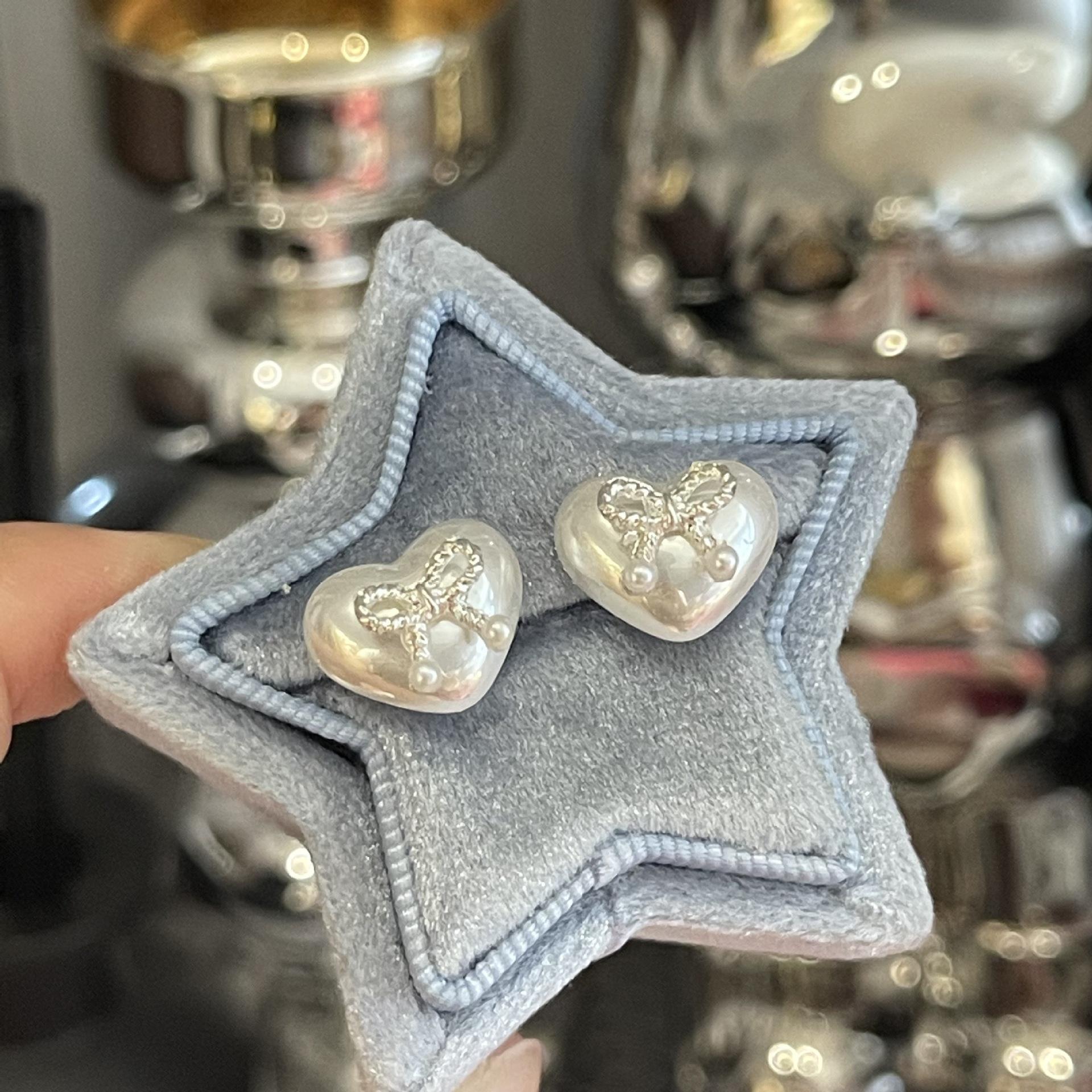 Pendientes pequeños con lazo de perla en forma de corazón, aguja de plata S925, temperamento femenino, combinables, pequeños, lindos, apacibles, exquisitos.