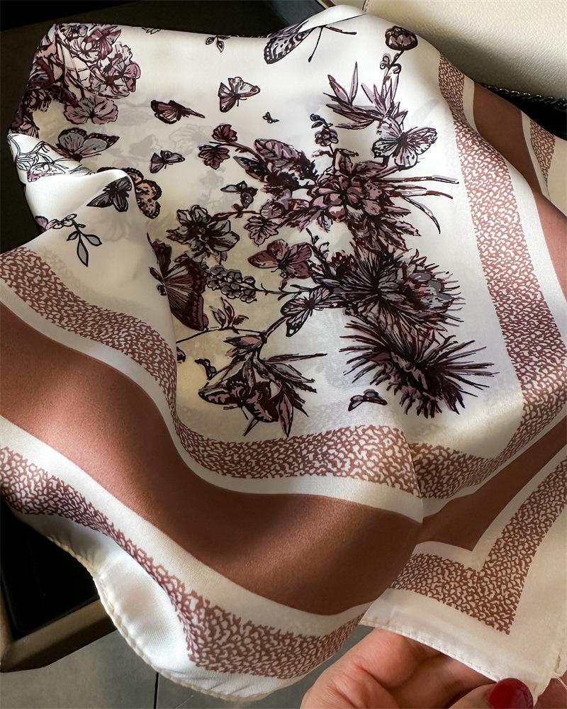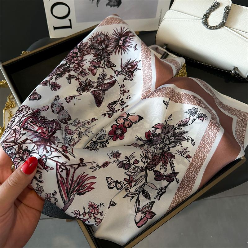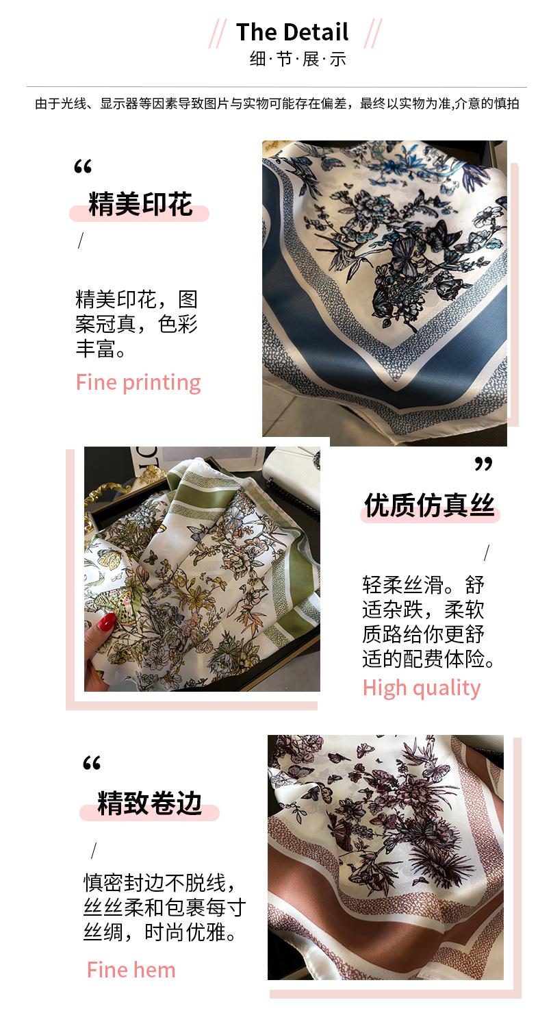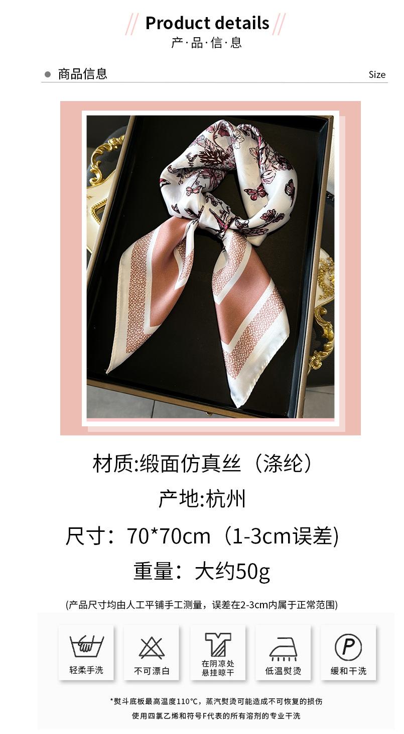 Versión coreana de primavera y verano de la bufanda estampada de seda de imitación cuadrada pequeña con flores de mariposa, nueva bufanda de moda, bufanda profesional.