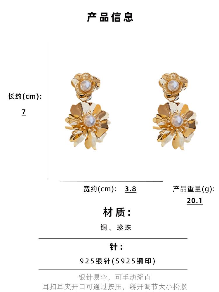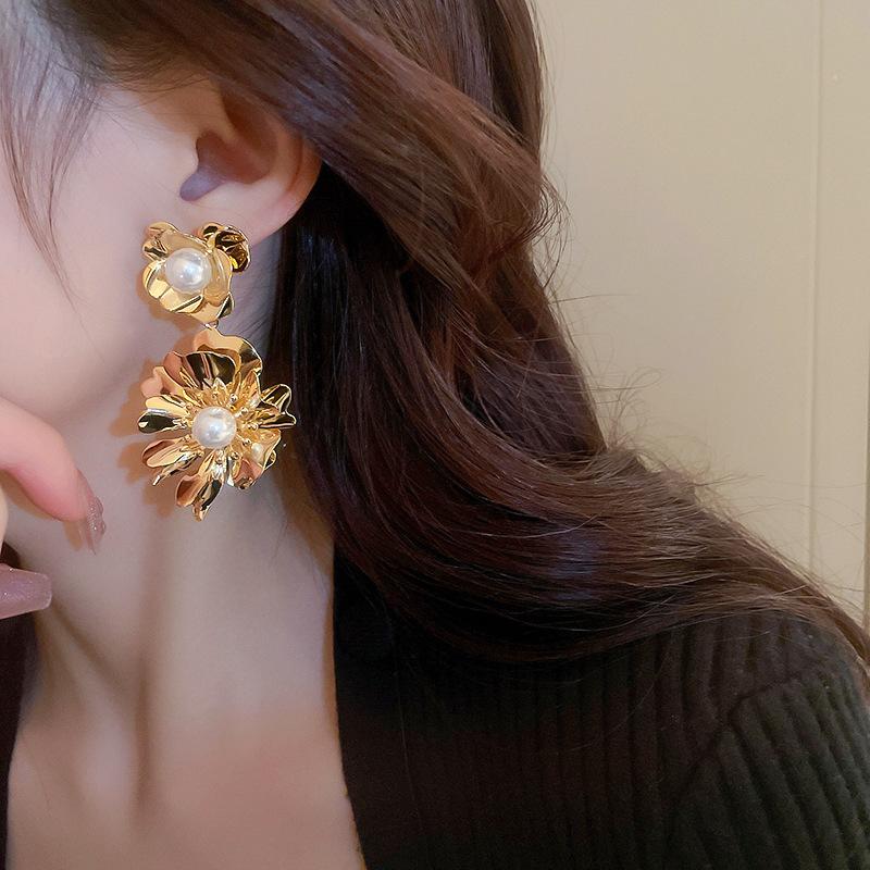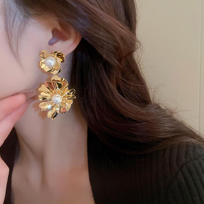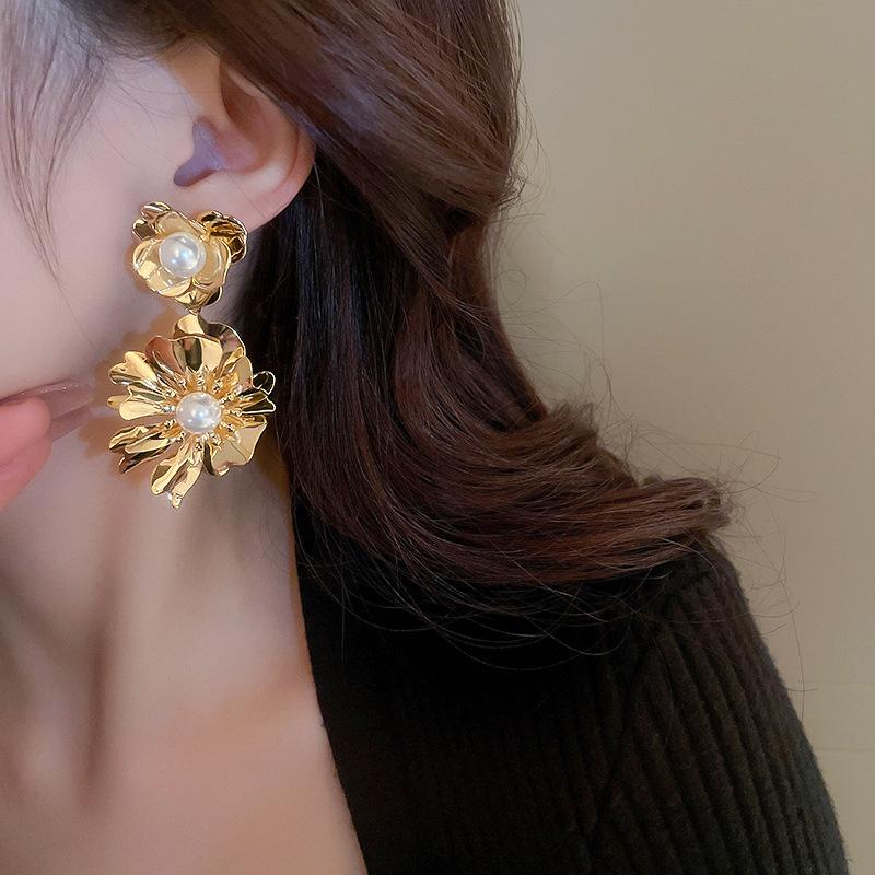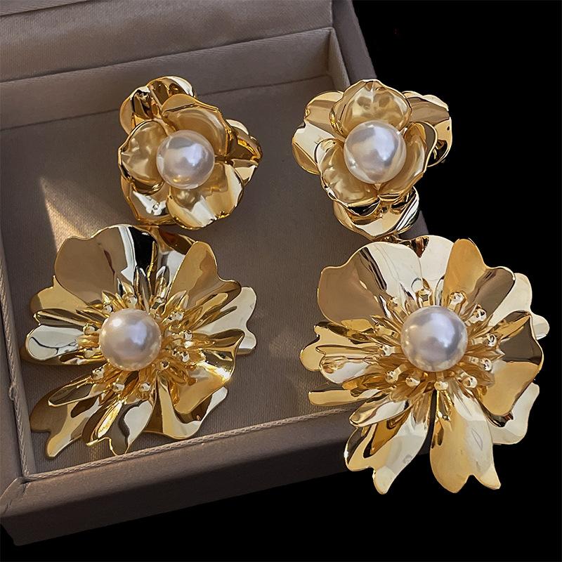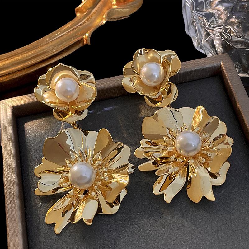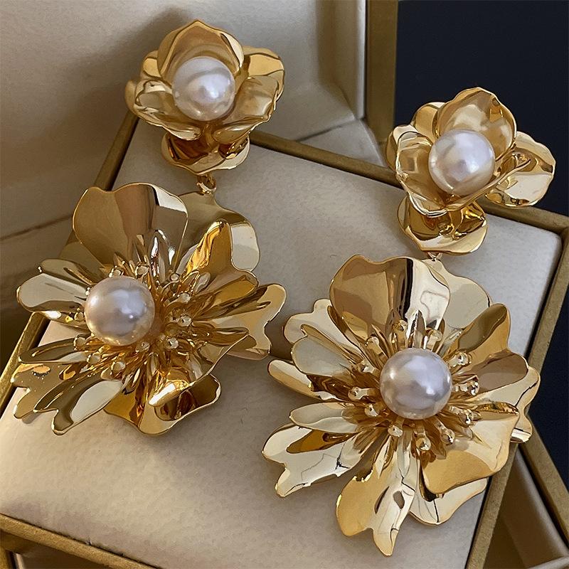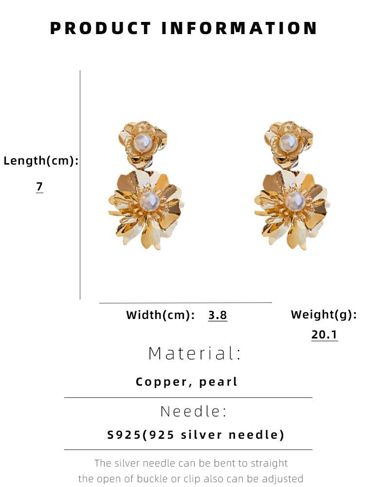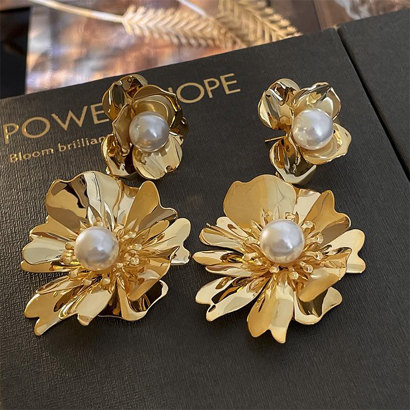 Compra Pendientes de cobre metálico personalizados con flor de perla de imitación de plata, pendientes de alta gama de temperamento exagerado de moda europea y americana para mujer al por mayor en Joom.pro