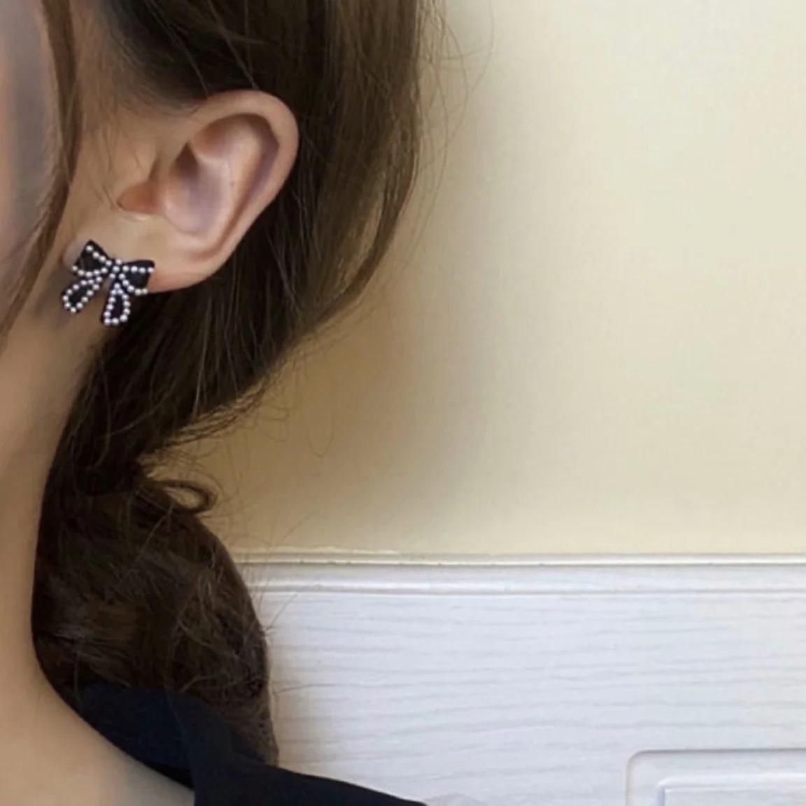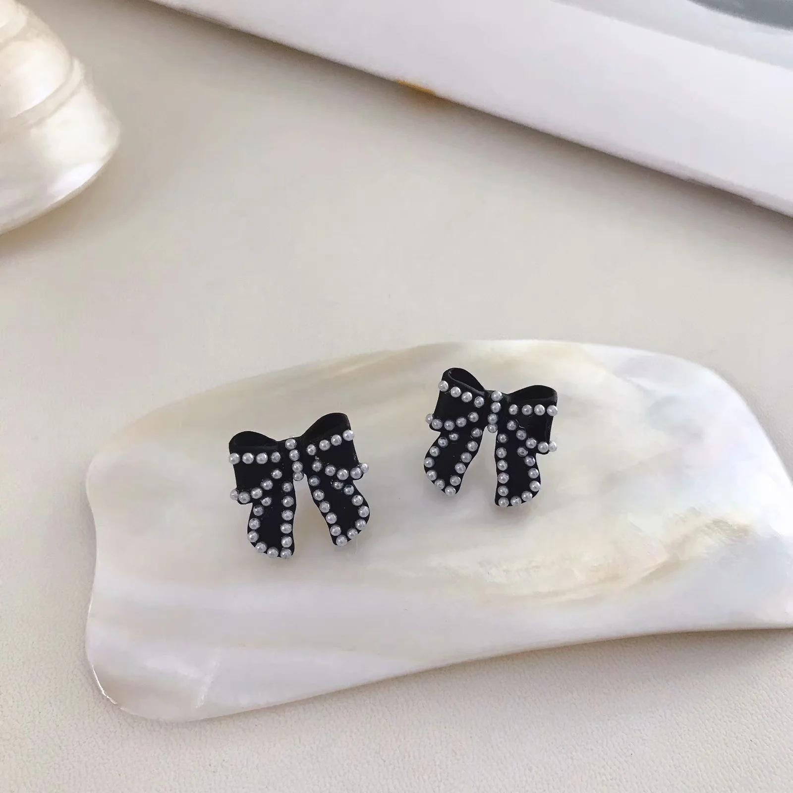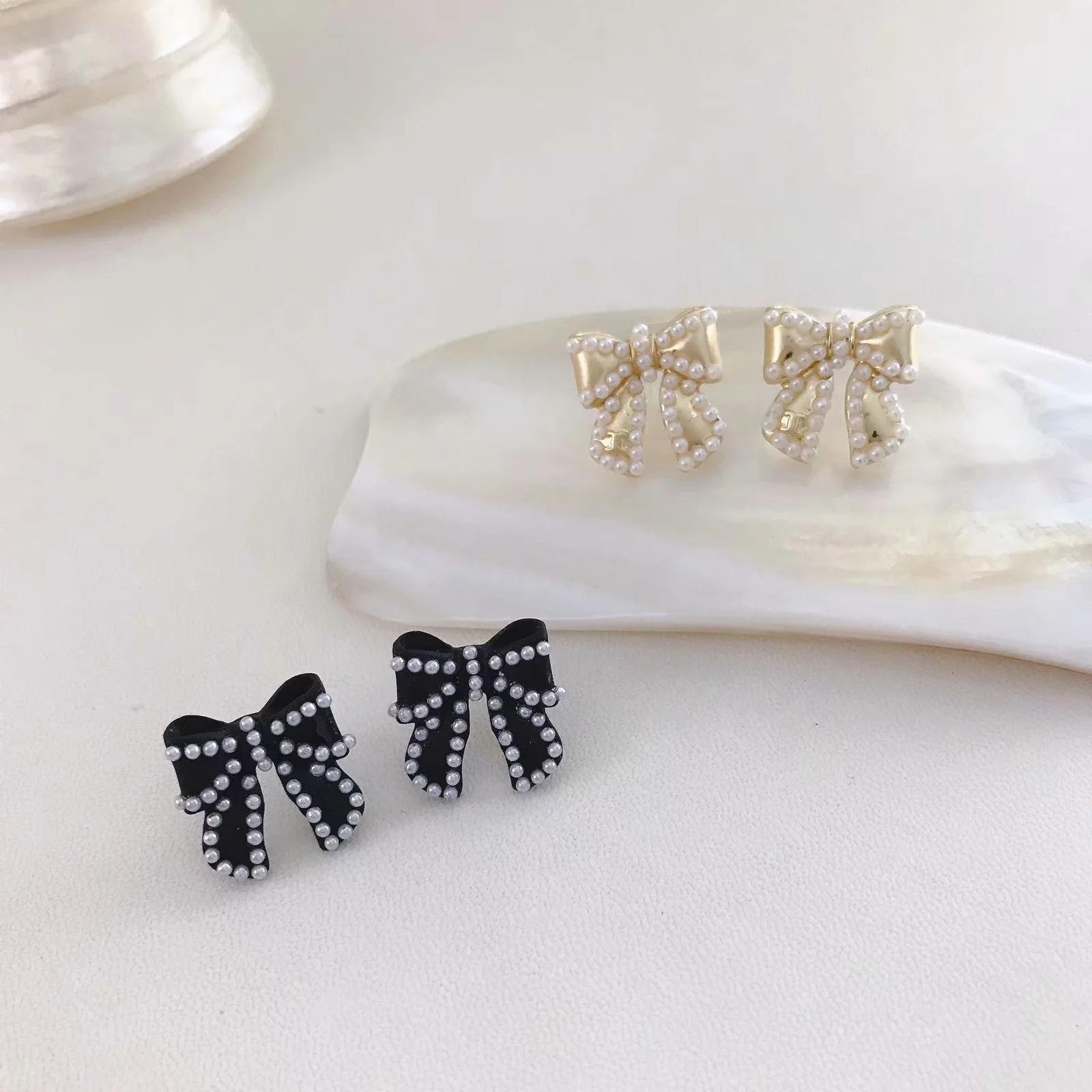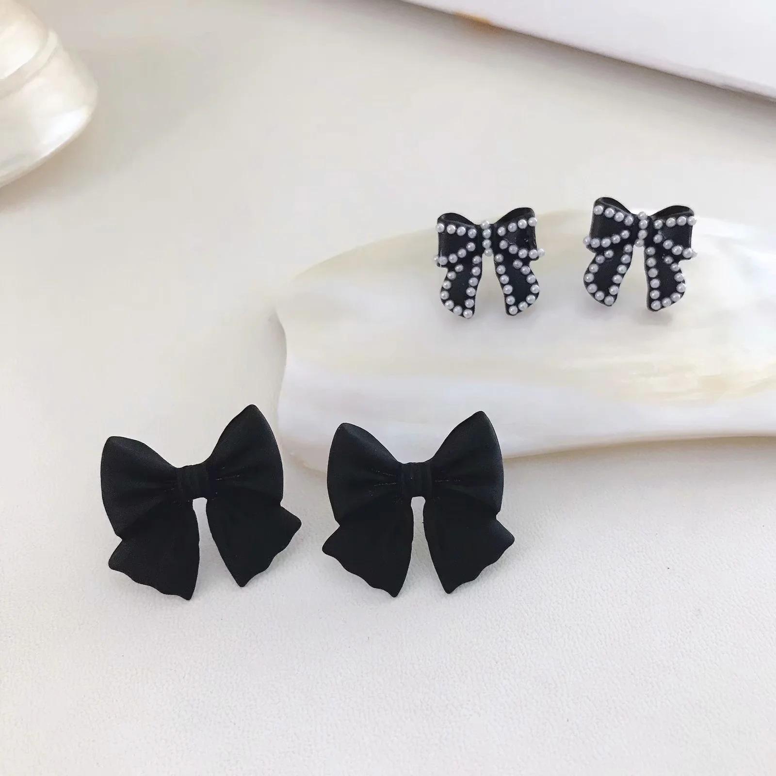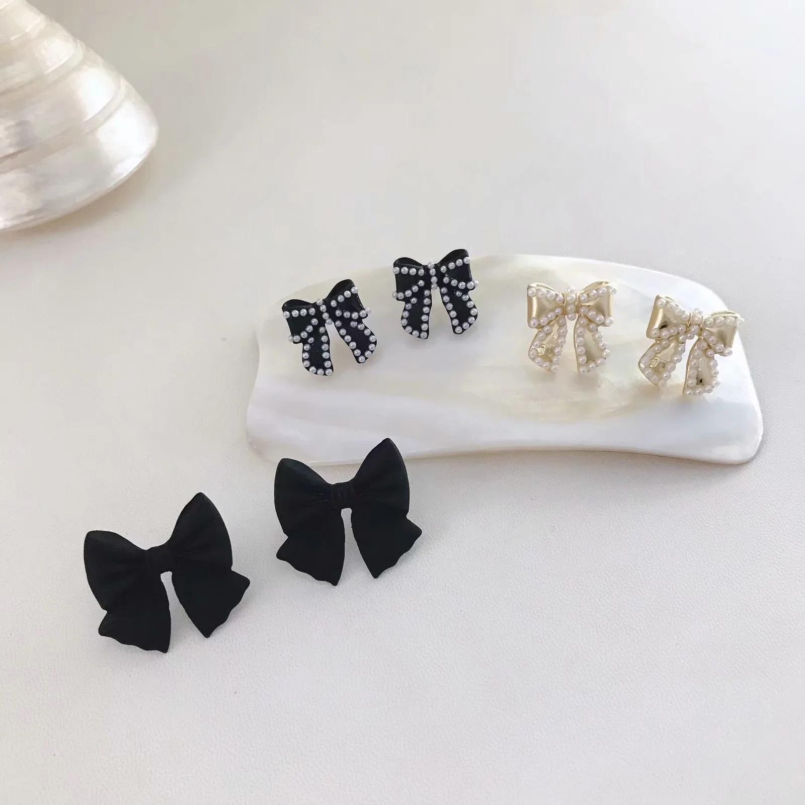 Compra Pendientes Temperamento Negro ~ Lazo de Perla Casual para Mujer Pendientes Pequeños Exquisitos Pendientes Lindos de Celebridad Coreana de Internet al por mayor en Joom.pro