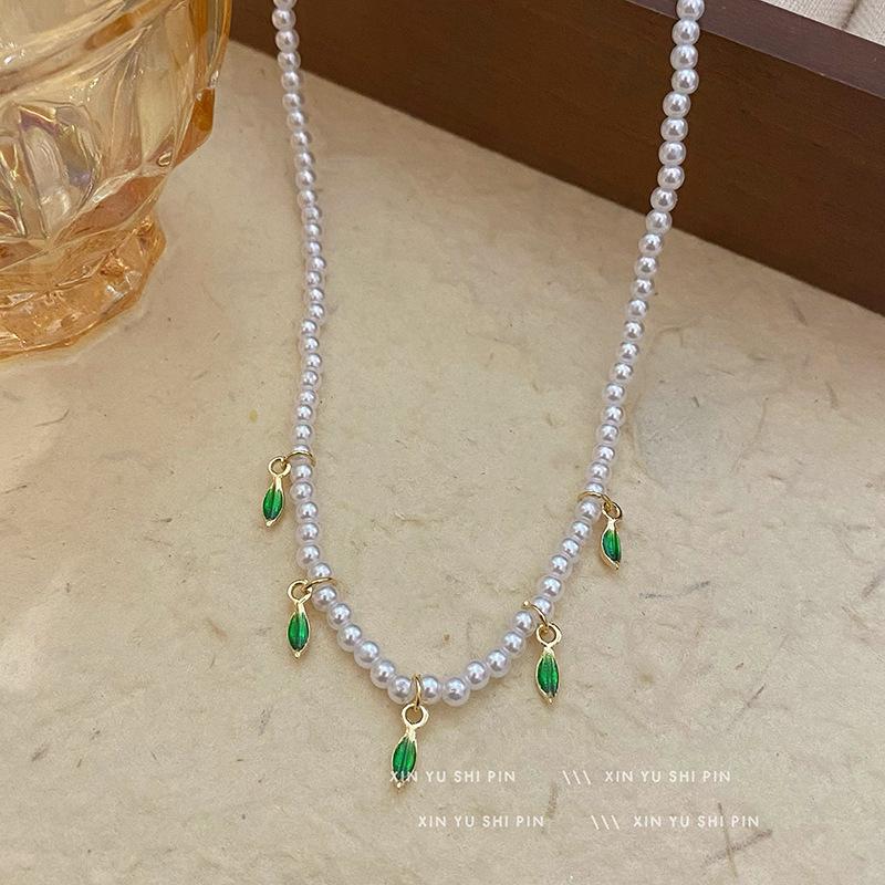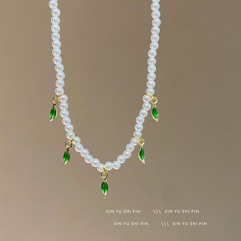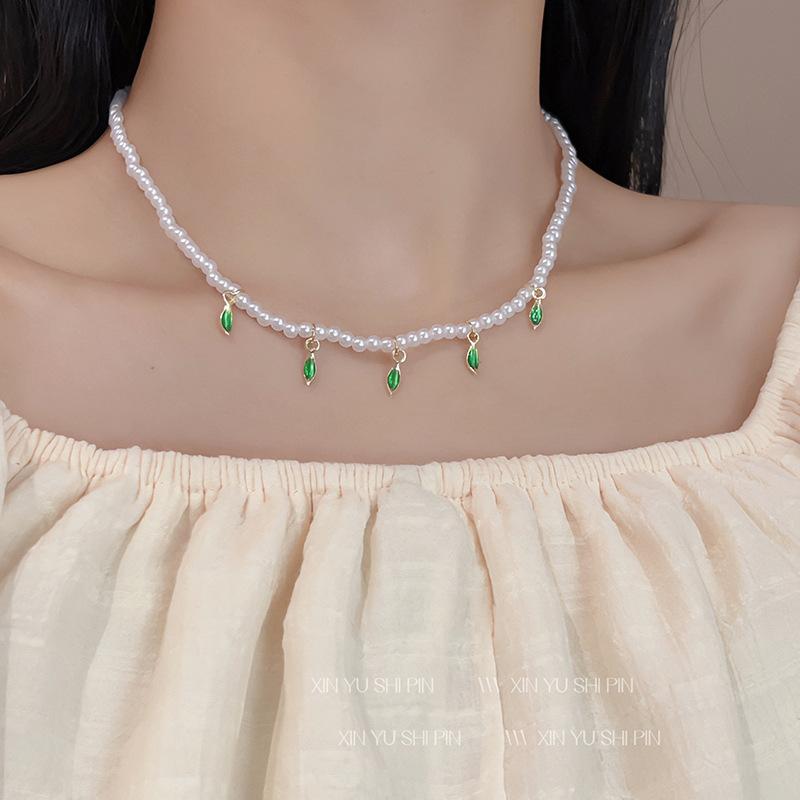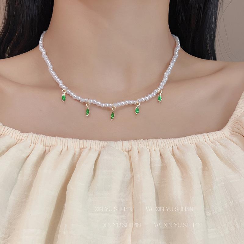 Collar de perlas con colgante de hoja verde fresca pequeña para mujer, ligero, de lujo, elegante, de alta gama, con diseño de nicho, cadena para clavícula.