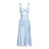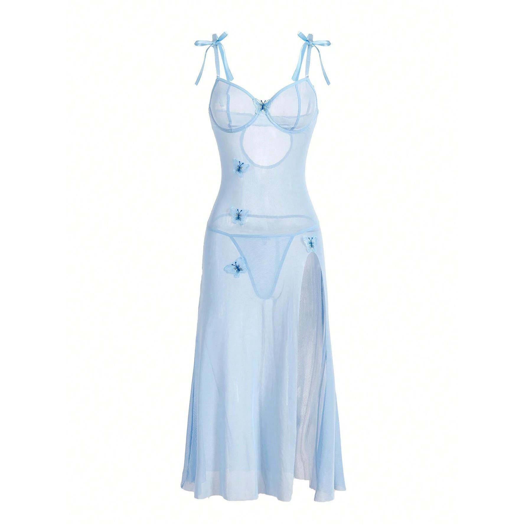 Comercio Exterior Estilo Europeo y Americano Sexy Perspectiva Malla Tentación Encaje Espalda Descubierta Abertura Alta Azul Claro Vestido Sexy de Tirantes