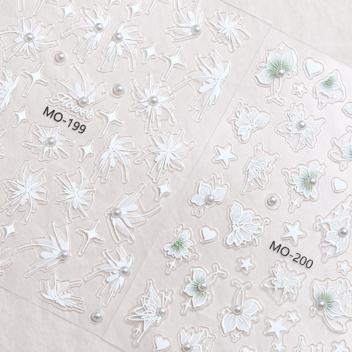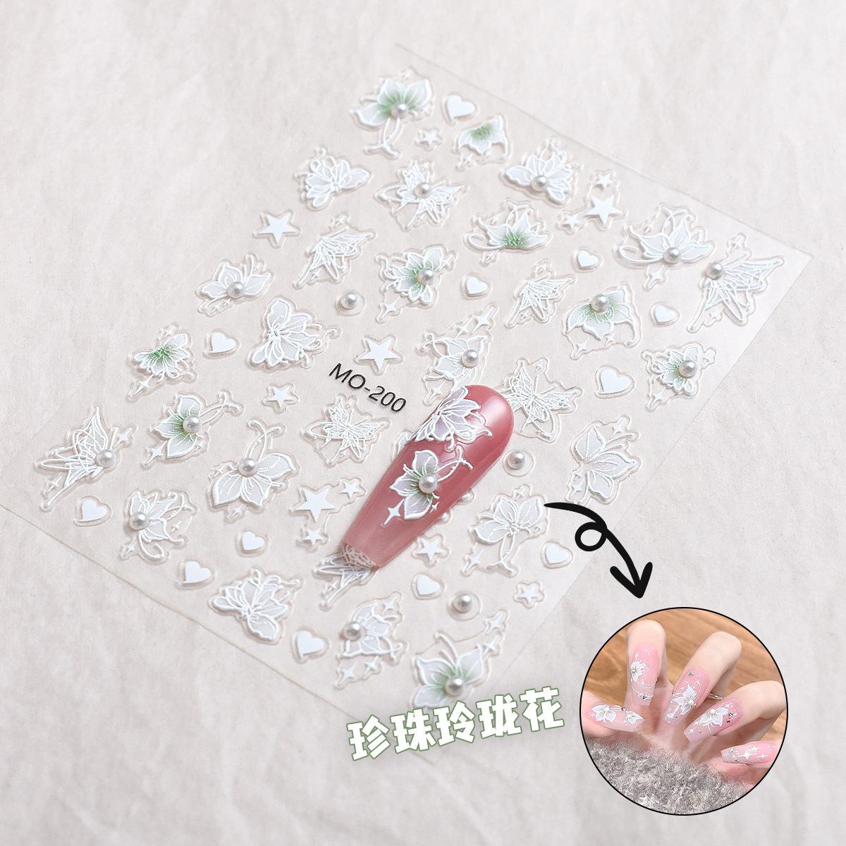 Pegatinas de uñas con flores y perlas de celebridades populares en línea 2024. Nuevas calcomanías de uñas con relieve blanco de mariposa y diamante de cristal.