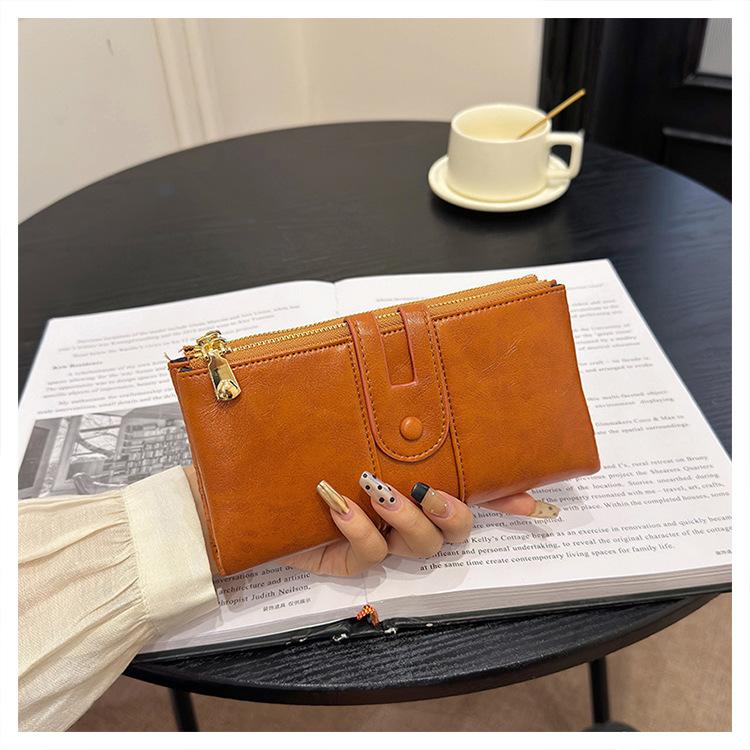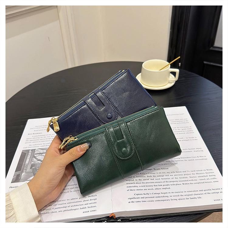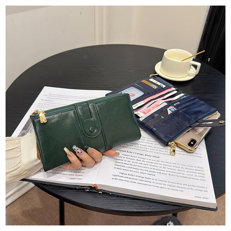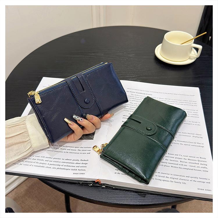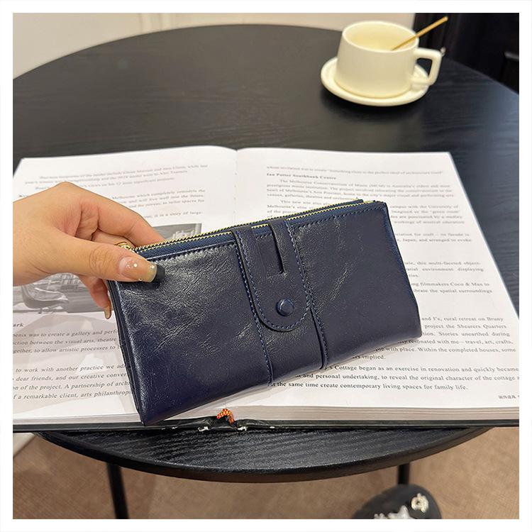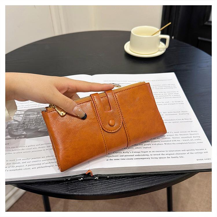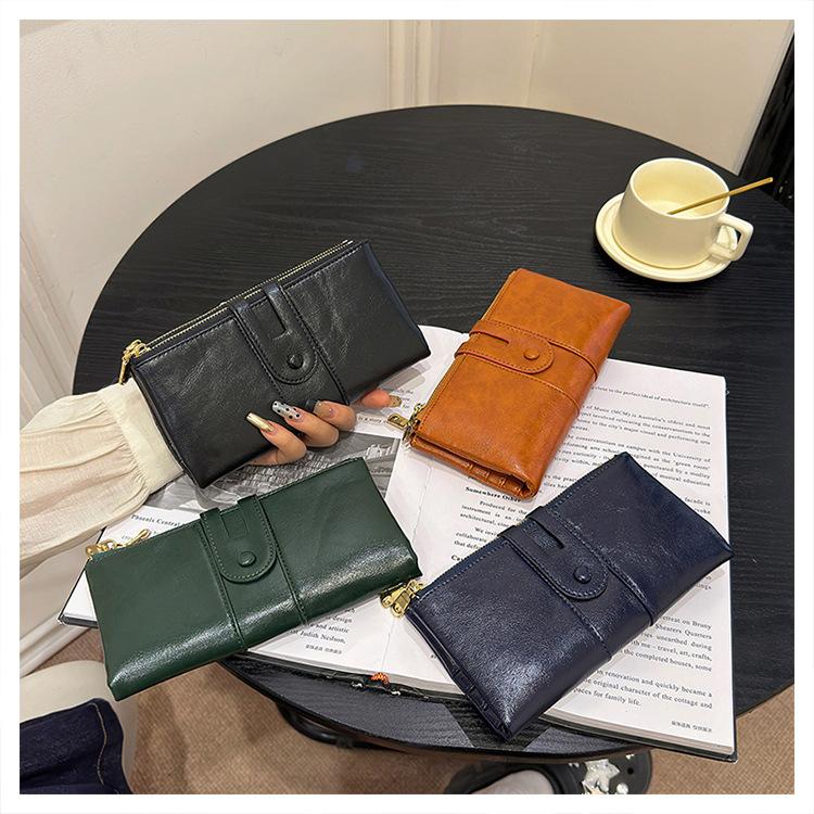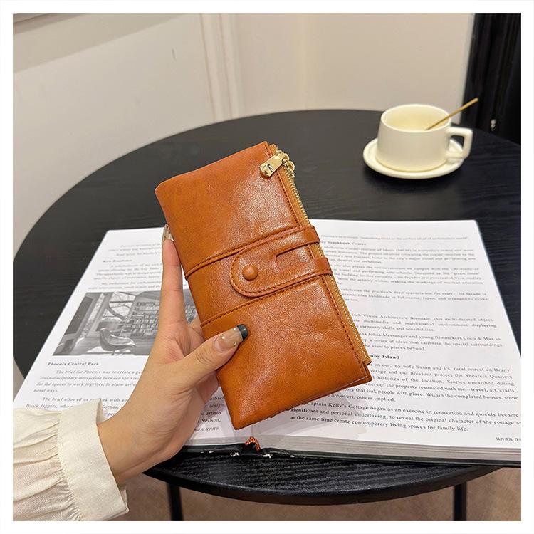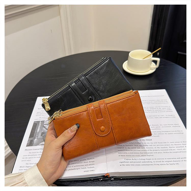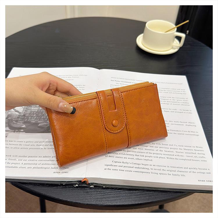 Cartera de comercio exterior transfronterizo para mujer, nueva cartera de 2024, cartera vintage de cuero con cera de aceite, cartera larga para mujer, venta al por mayor