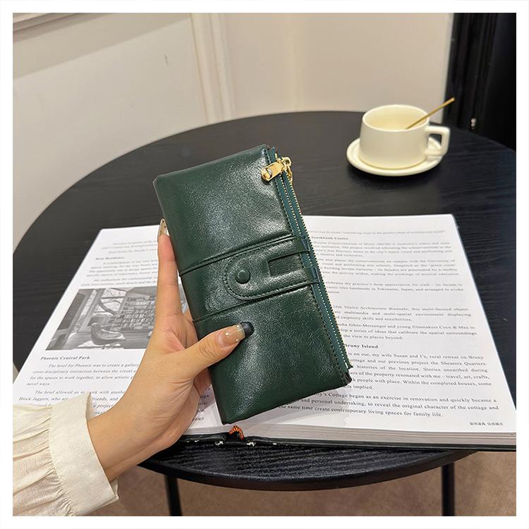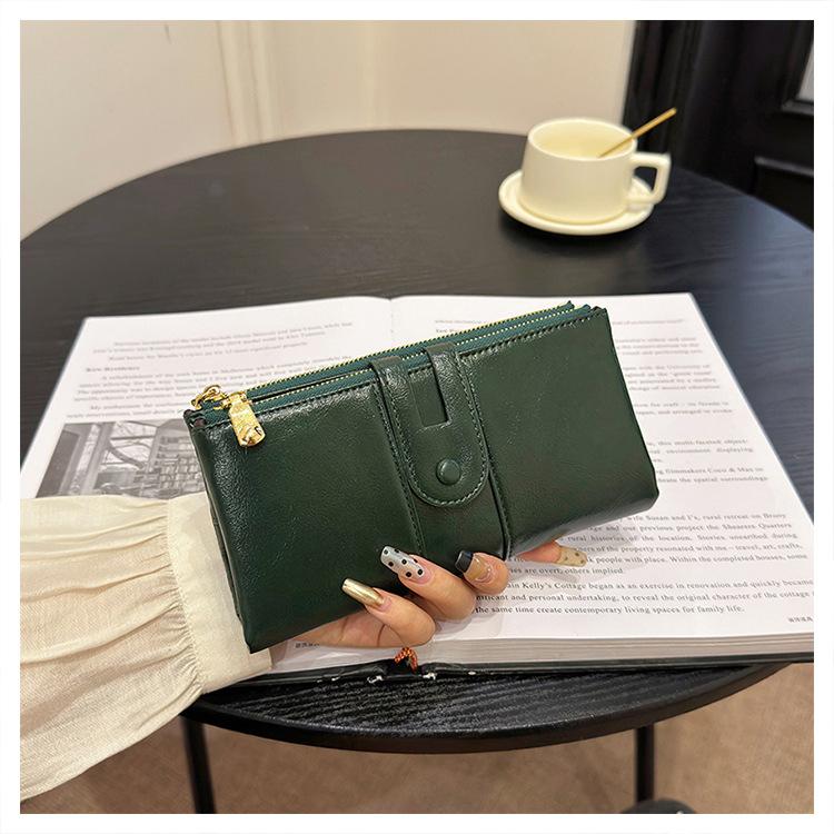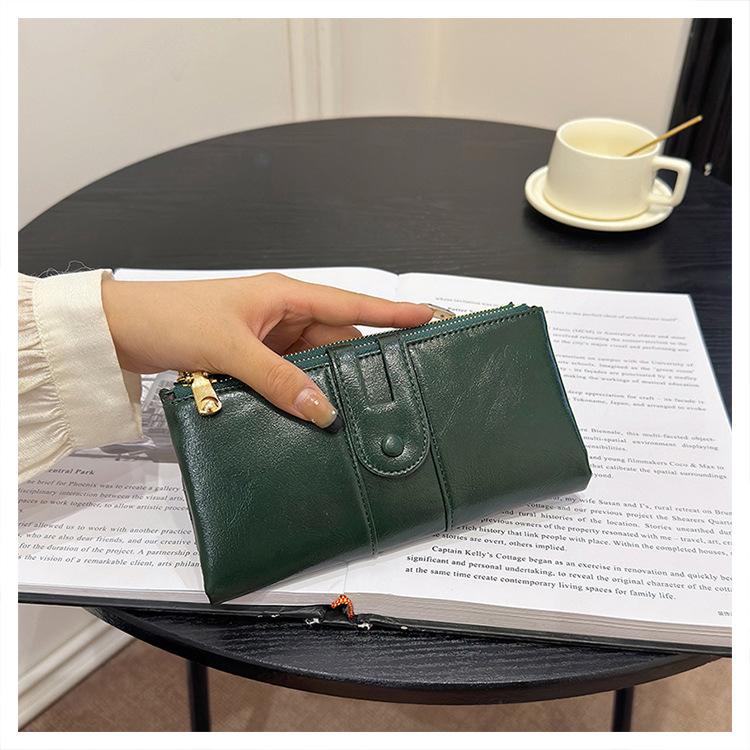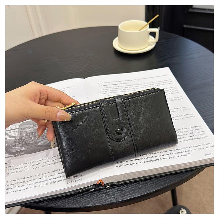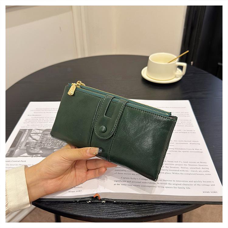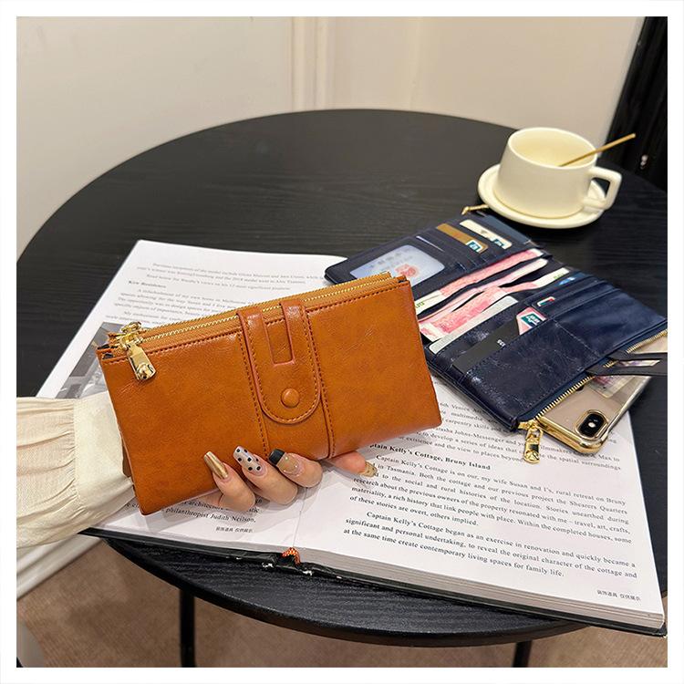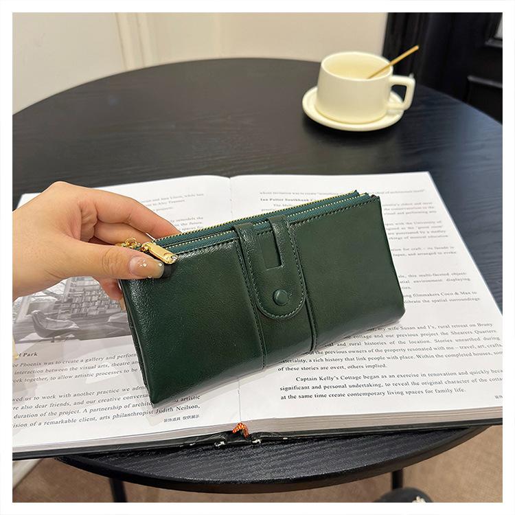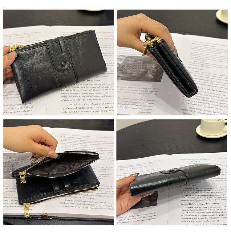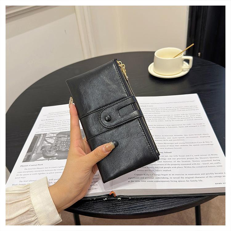 Cartera de comercio exterior transfronterizo para mujer, nueva cartera de 2024, cartera vintage de cuero con cera de aceite, cartera larga para mujer, venta al por mayor
