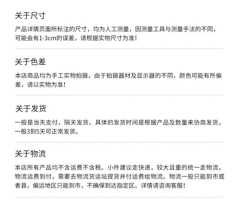 2. Todos los productos de esta tienda se venden directamente de fábrica, con alta calidad, precios bajos y pequeñas ganancias. Si el comprador tiene requisitos más exigentes en cuanto a los materiales, puede contactar con el servicio de atención al cliente para personalizar el producto. ¡Nuestra fábrica también acepta diseños personalizados! Si la superficie de algunos productos metálicos presenta pequeños rayones, es un fenómeno inevitable durante el proceso de procesamiento y producción. ¡Por favor, comprenda!