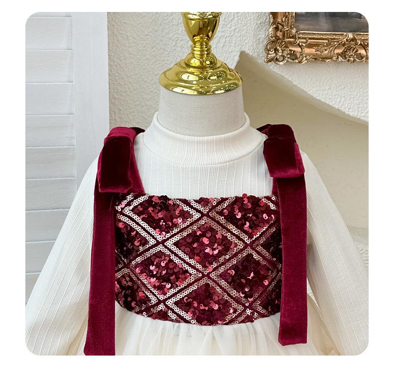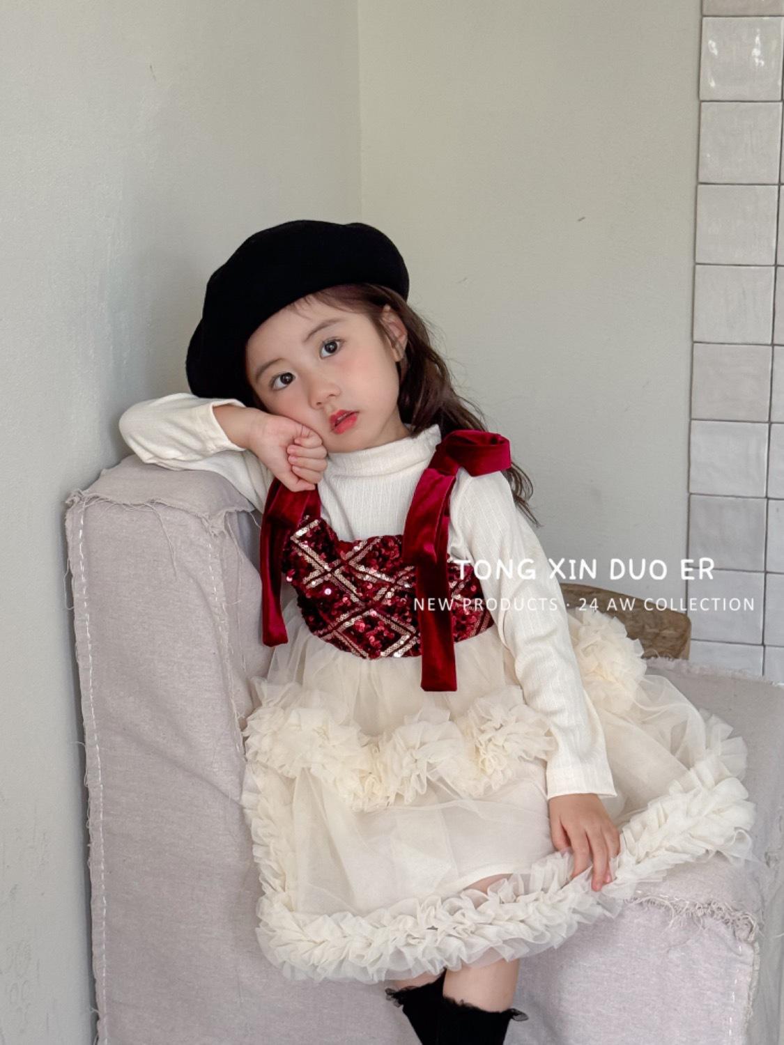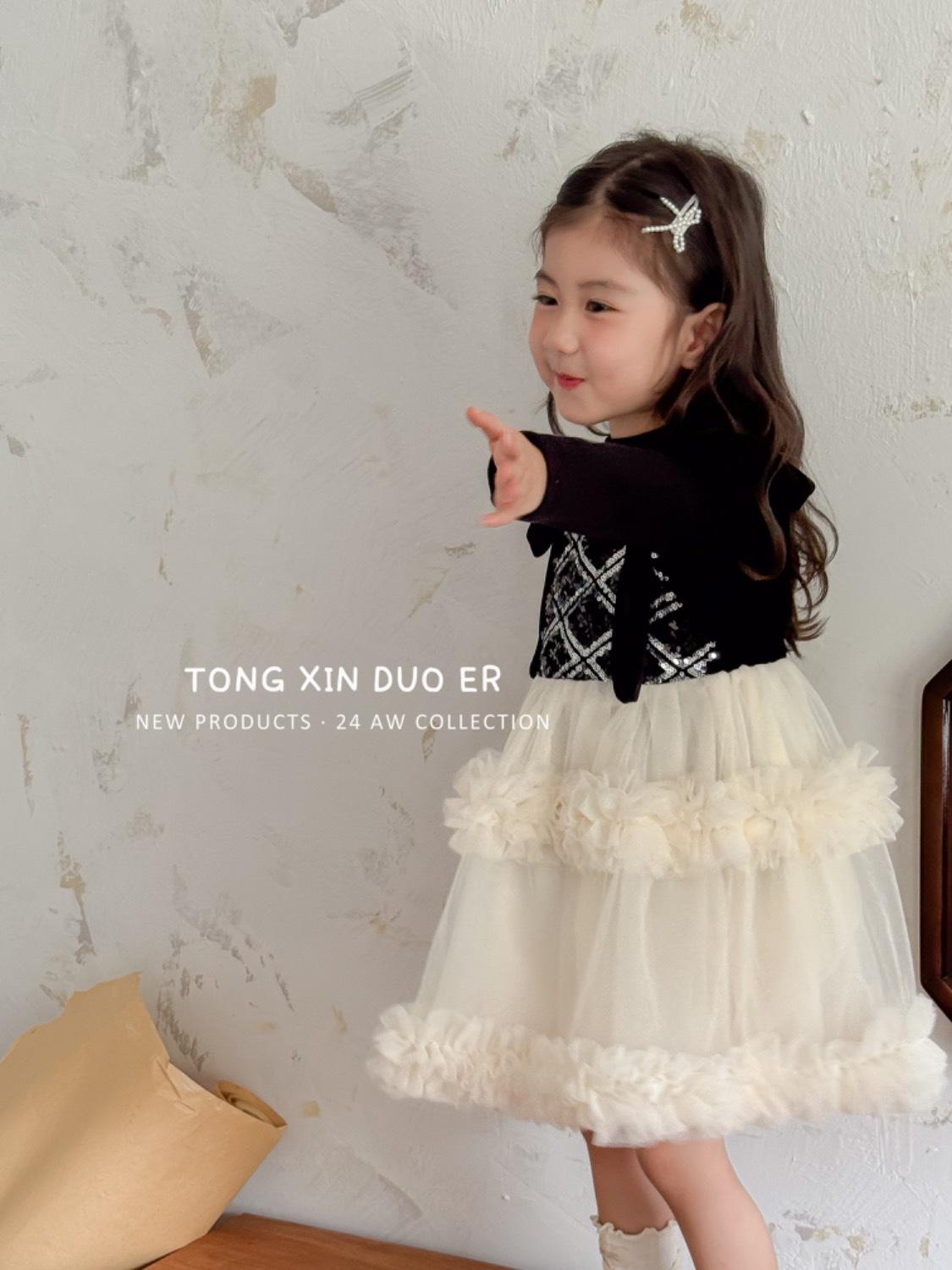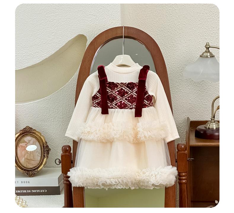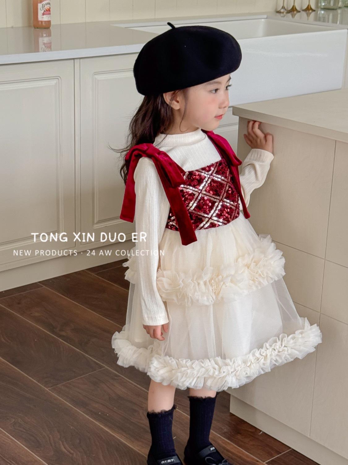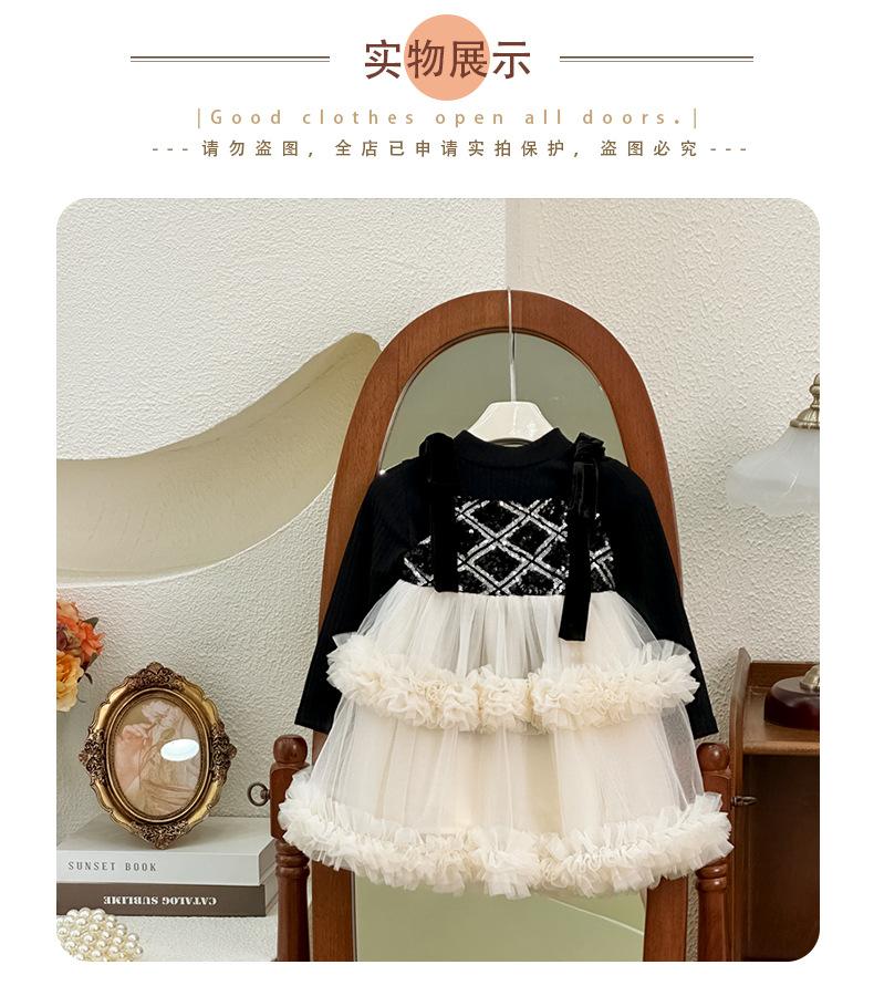 Vestido de Niña 2025 Otoño Nuevo Vestido de Niña Pequeña Correa de Lazo Falda de Dos Piezas Estilo Princesa