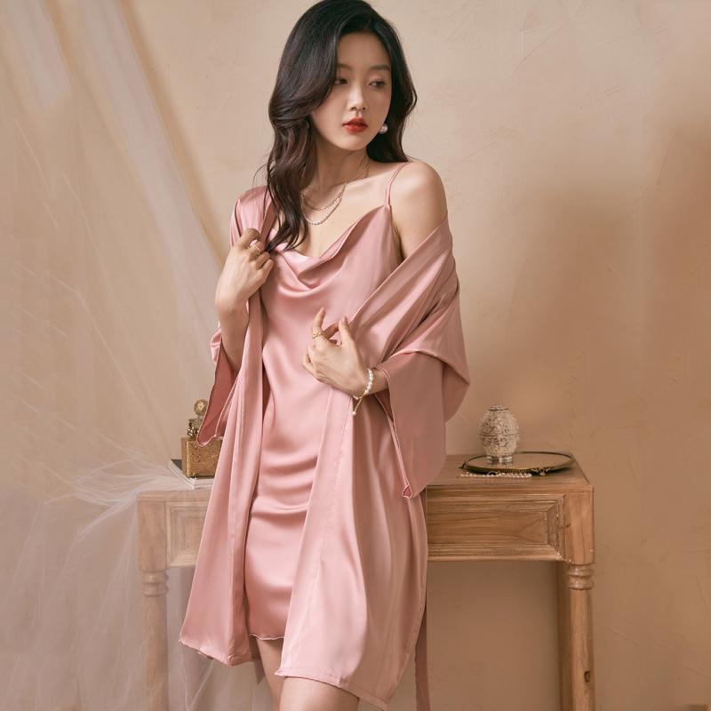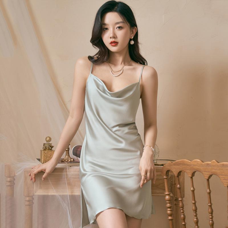 Pijama Sexy Bata Estilo Francés Camisón de Verano de Seda de Hielo para Mujer Universal para las Cuatro Estaciones Lindo Camisón con Tirantes y Cuello Halter de Puro Deseo